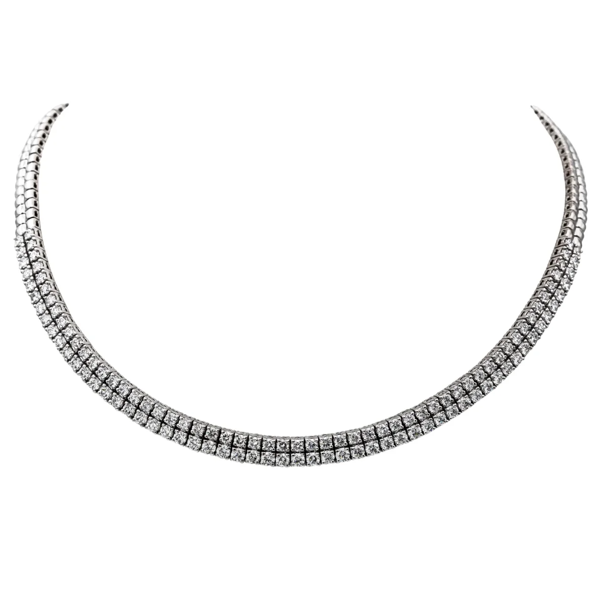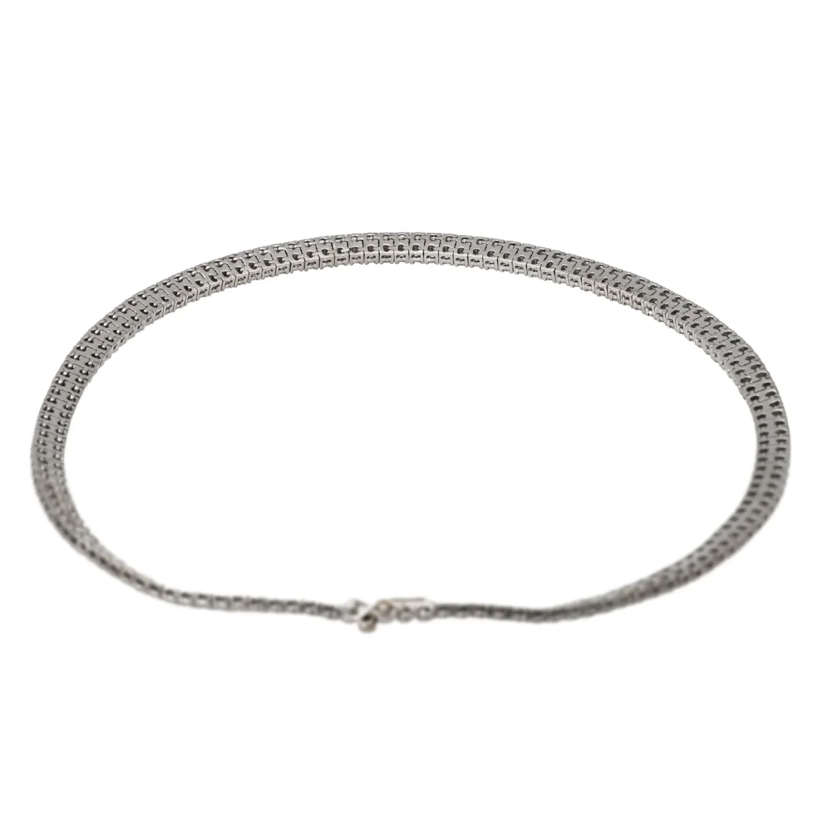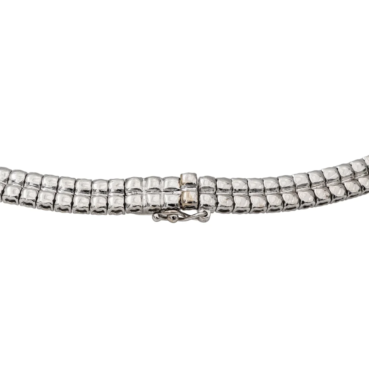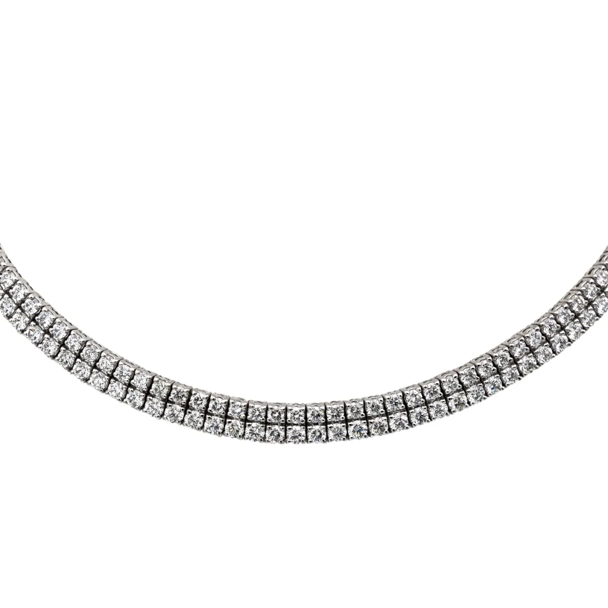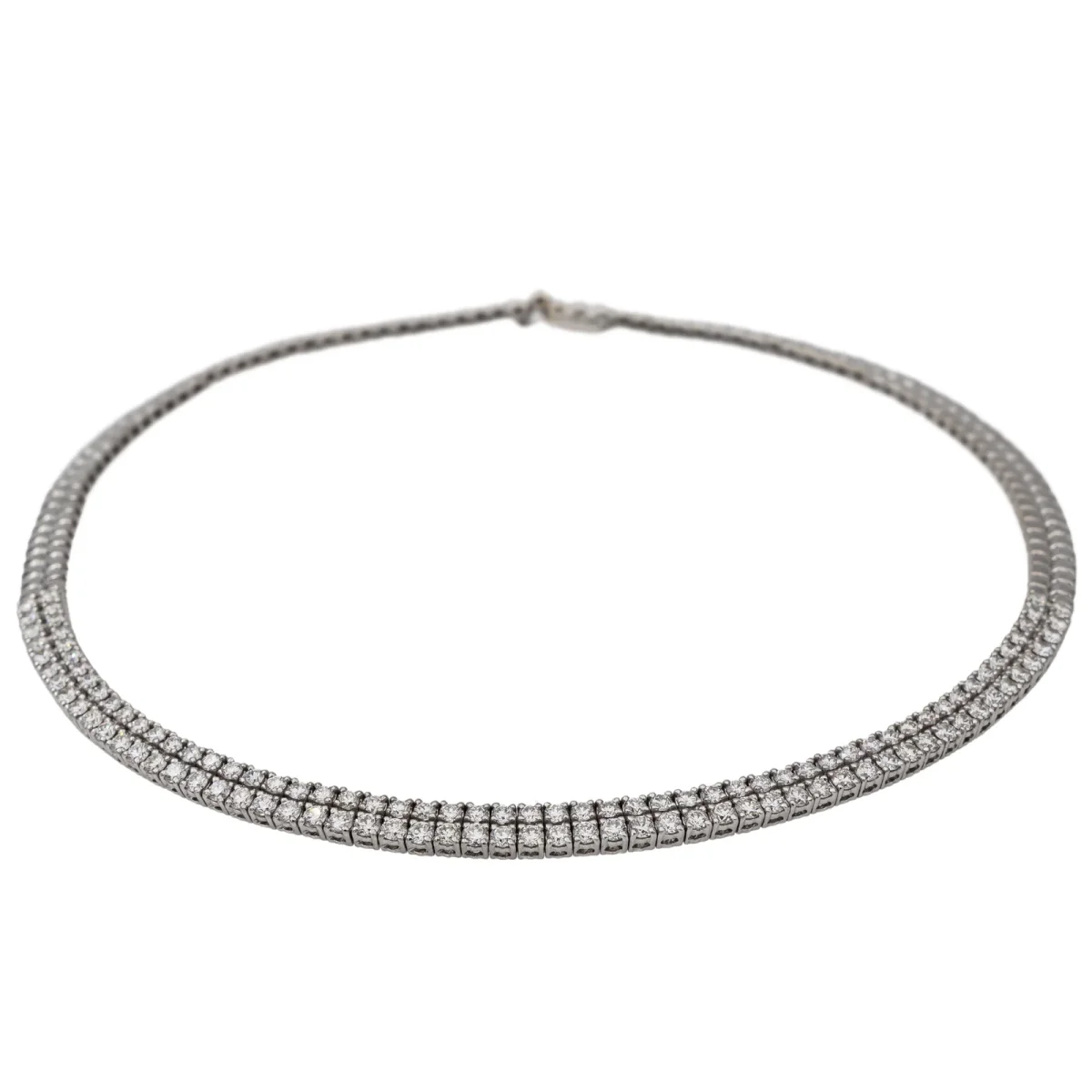 Collier rivière, double ligne de diamants, en or blanc 750 millièmes (18 carats), serti de 112 diamants sur deux rangs, taille brillant environ G/VS, 56 diamants d’environ 0,03 ct chacun, et 56 diamants d’environ 0,04 ct chacun, poids total diamants: environ 3,92 cts, longueur: 40,5 cm, largeur: 0,62 cm, fermoir avec huit de sécurité, poids total: 61,45 g, poinçon hibou, excellent état