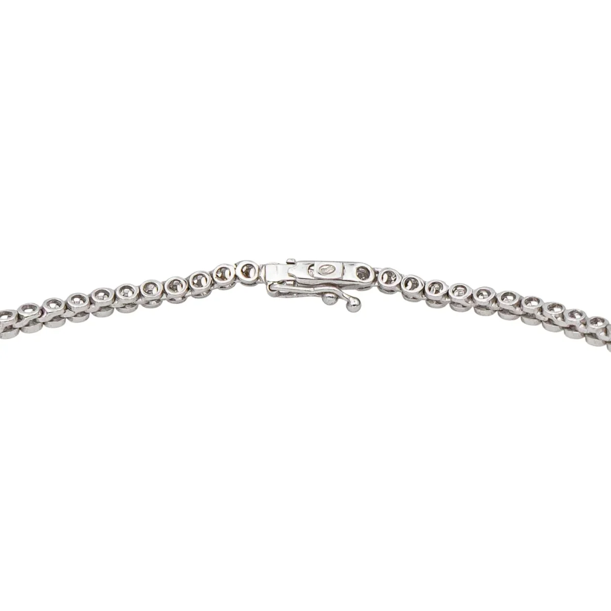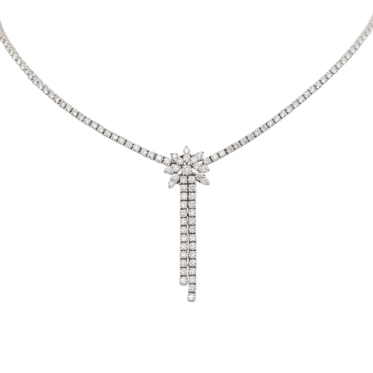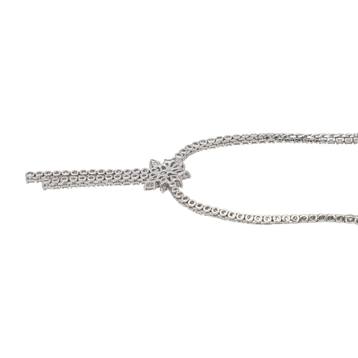 Collier en or blanc 750 millièmes (18 carats), motifs géométriques sertis de 119 diamants, taille brillant, un diamant environ H-SI, d’un poids d’environ 0,11 ct, 118 diamants, environ G-VS, poids total environ 4,72 cts, (chaque diamants d’un poids d’environ 0,04 ct), poids total de diamants environ 4,83 cts, longueur : 41,50 cm, largeur de la chaîne : 0,24 cm, longueur de la partie comprenant les motifs : 4,73 cm, largeur : 1,40 cm, poids total : 25,64 g, poinçon hibou, excellent état