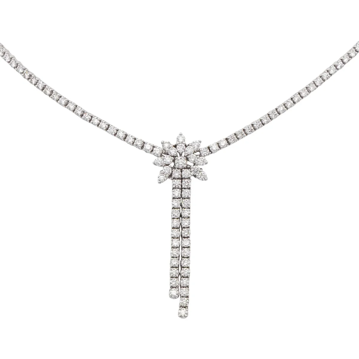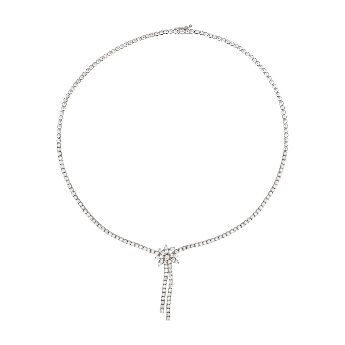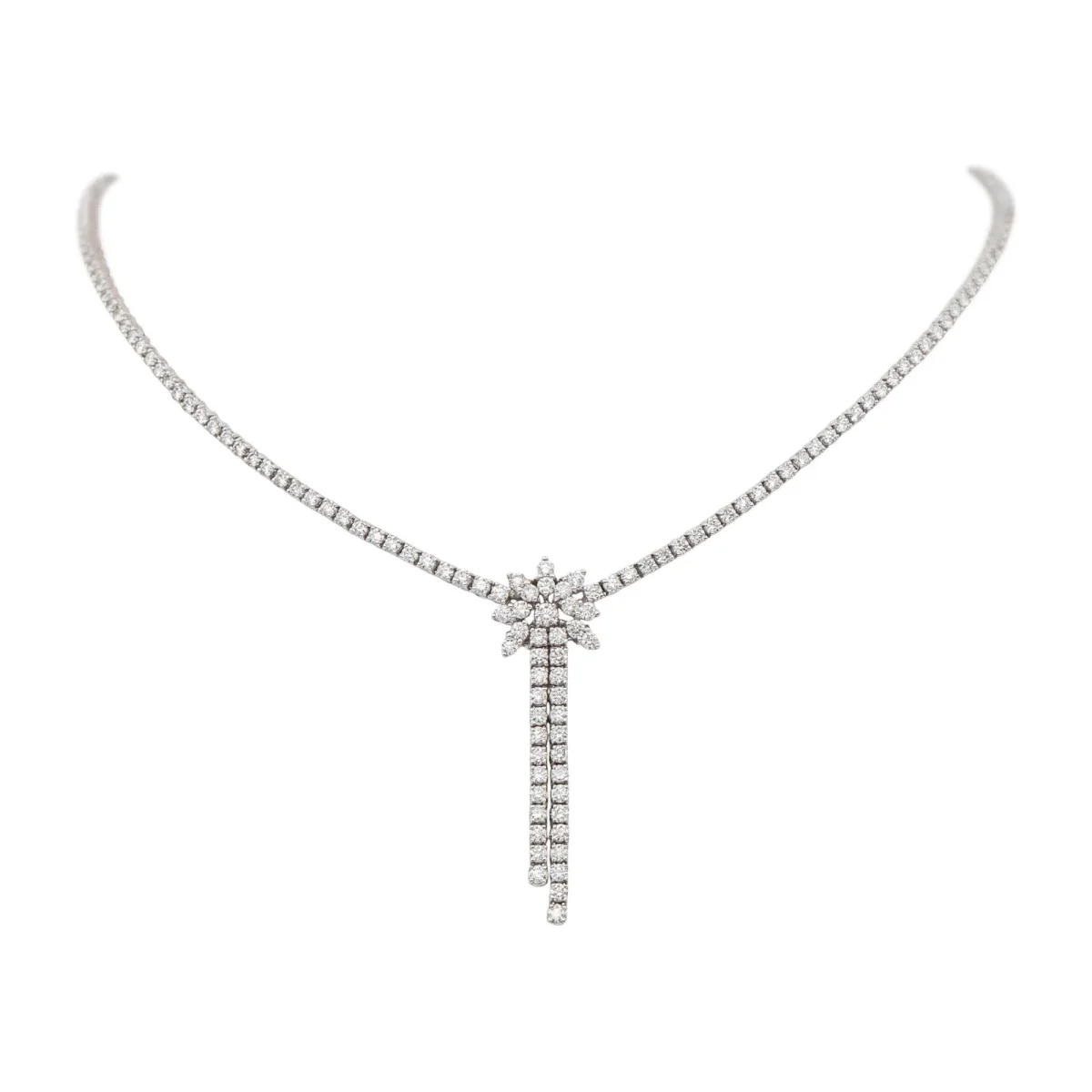 Collier en or blanc 750 millièmes (18 carats), motifs géométriques sertis de 119 diamants, taille brillant, un diamant environ H-SI, d’un poids d’environ 0,11 ct, 118 diamants, environ G-VS, poids total environ 4,72 cts, (chaque diamants d’un poids d’environ 0,04 ct), poids total de diamants environ 4,83 cts, longueur : 41,50 cm, largeur de la chaîne : 0,24 cm, longueur de la partie comprenant les motifs : 4,73 cm, largeur : 1,40 cm, poids total : 25,64 g, poinçon hibou, excellent état