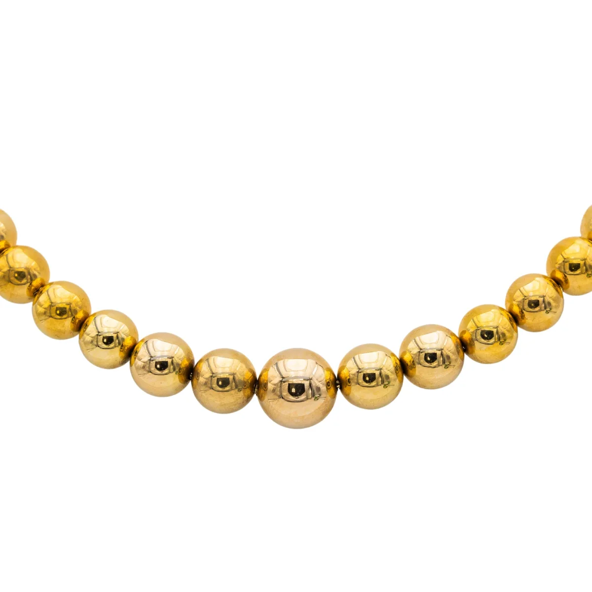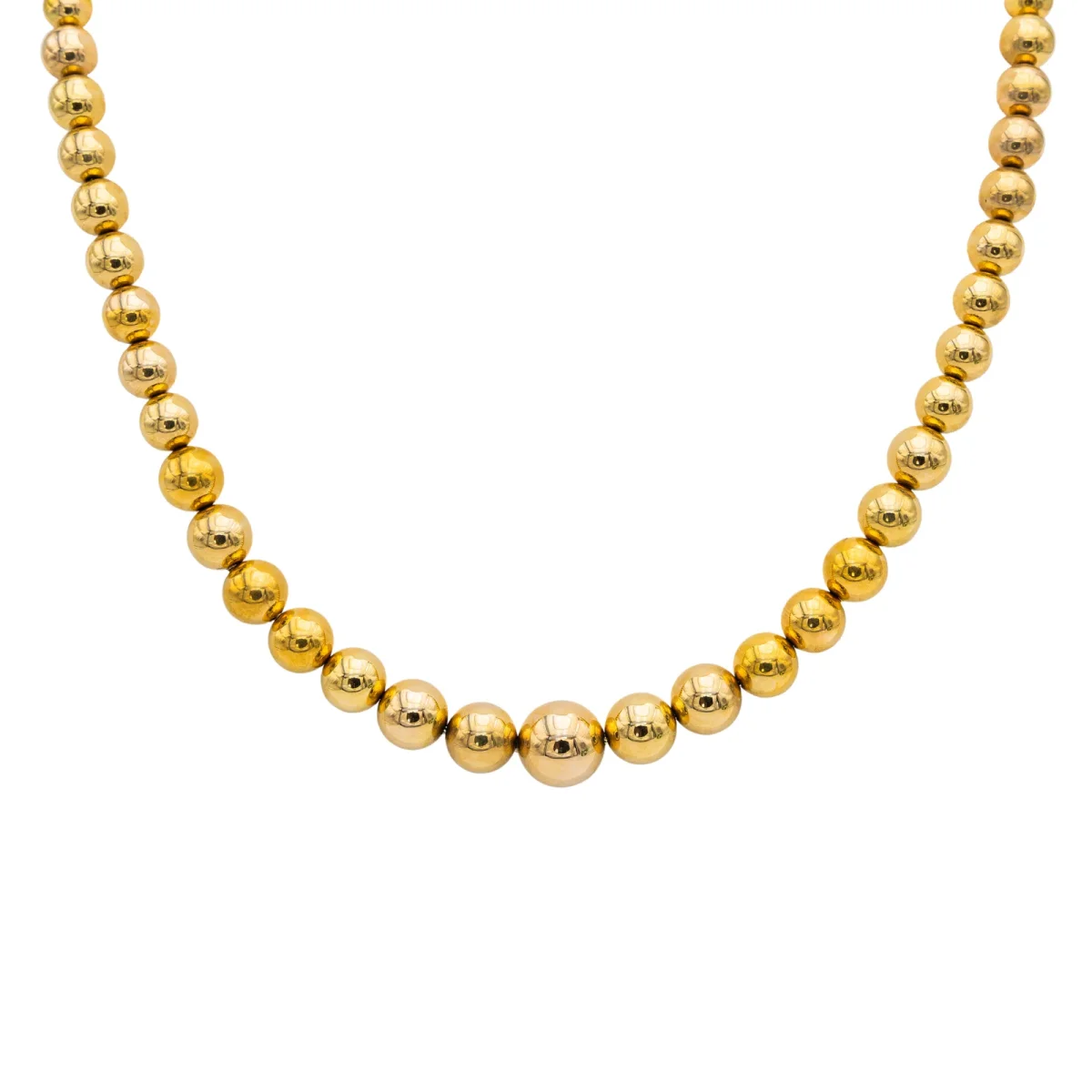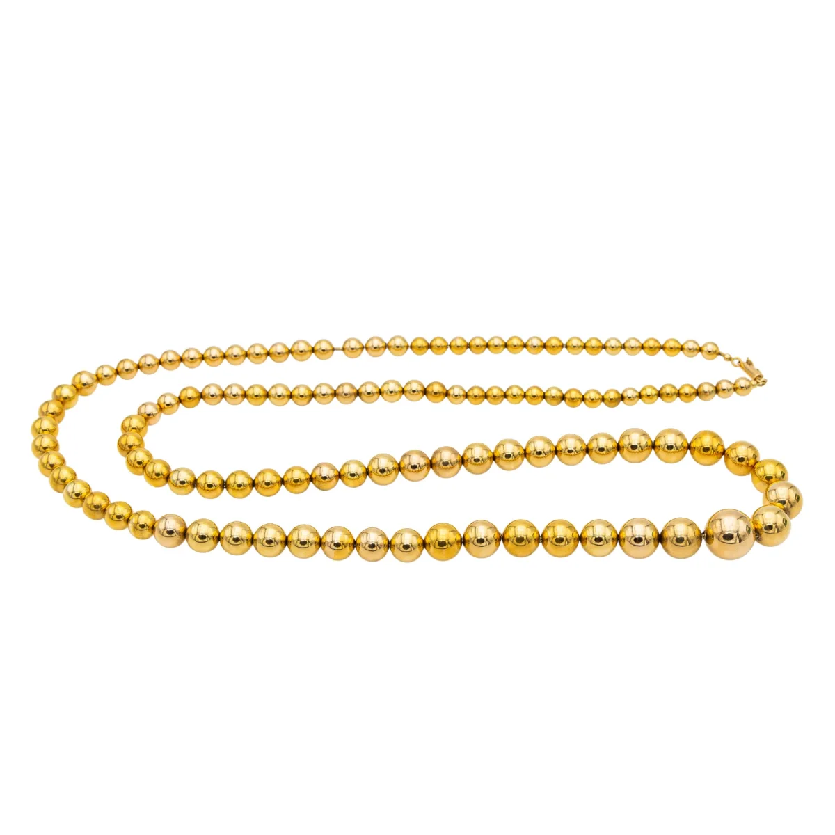 Collier sautoir boules, en or jaune 750 millièmes (18 carats), en chute, longueur: 82,00 cm, largeur max: 1,21 cm, margeur min: 0,53 cm, fermoir avec huit de sécurité, poids total: 46,46 g, poinçon tête d’aigle, excellent état