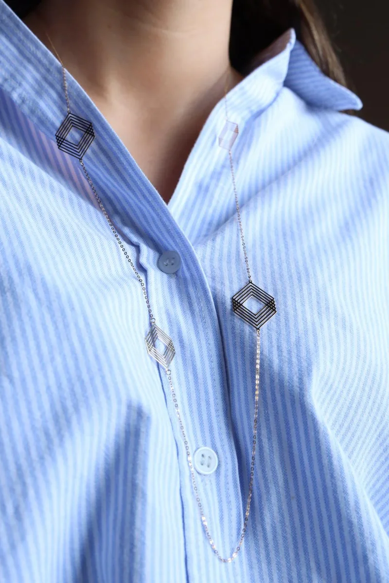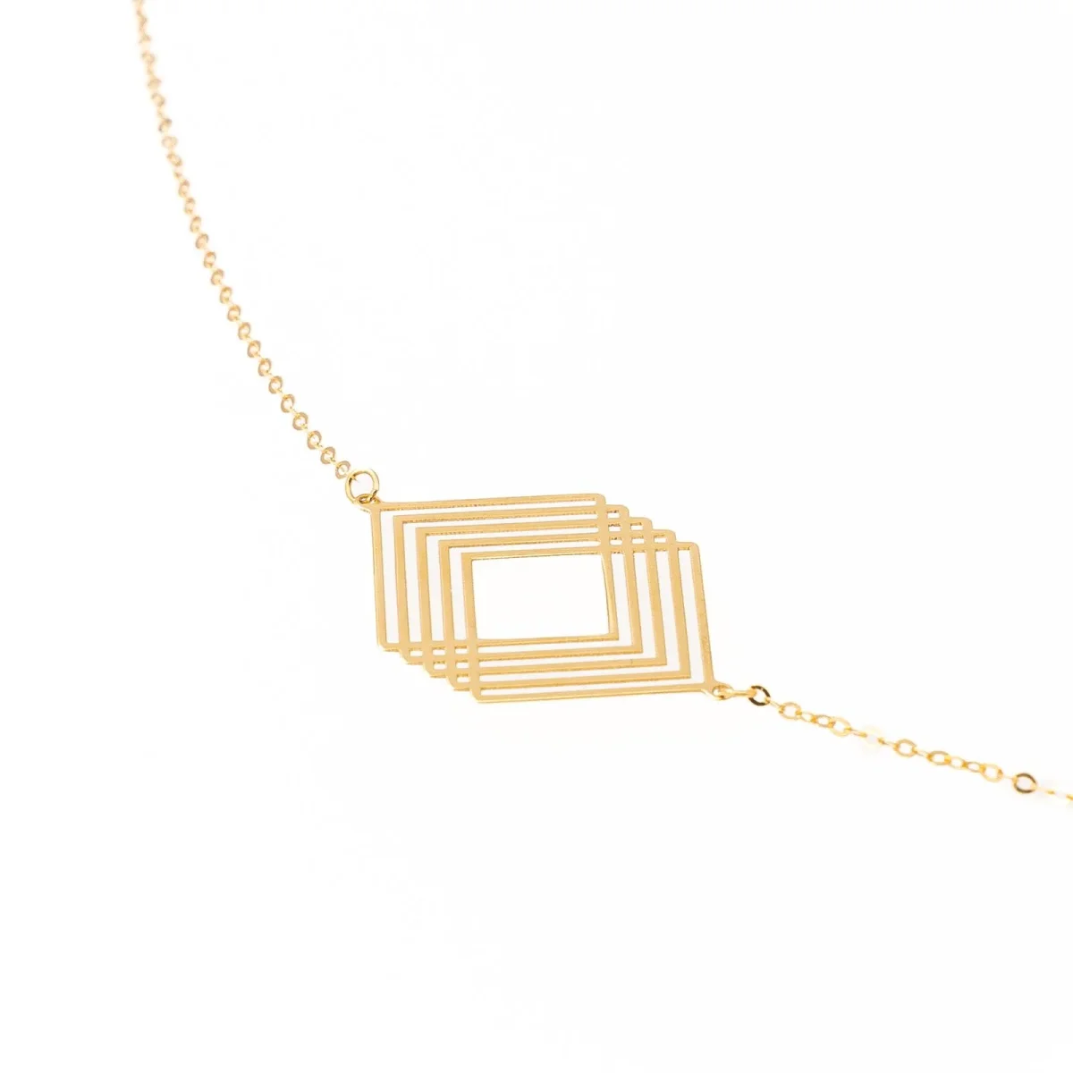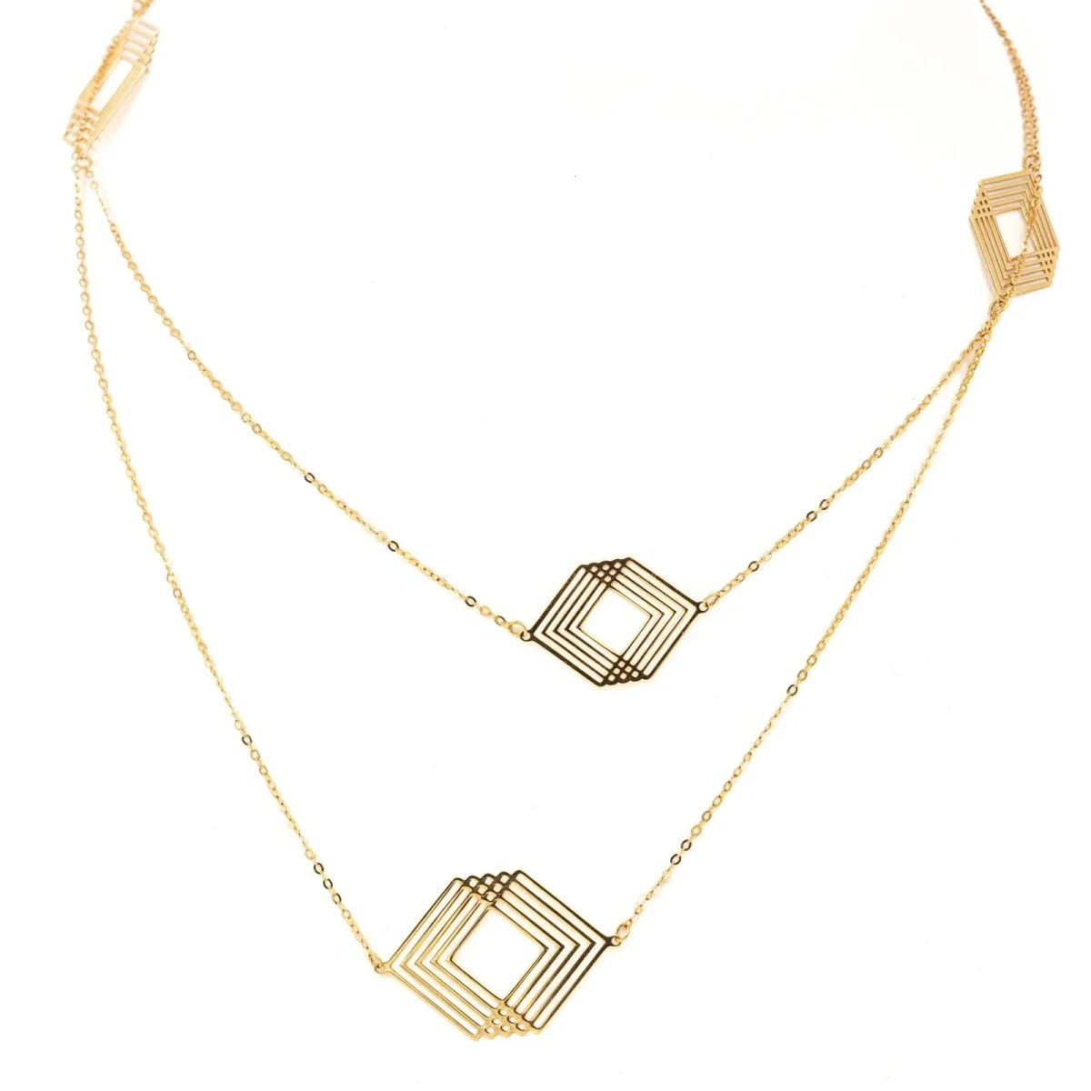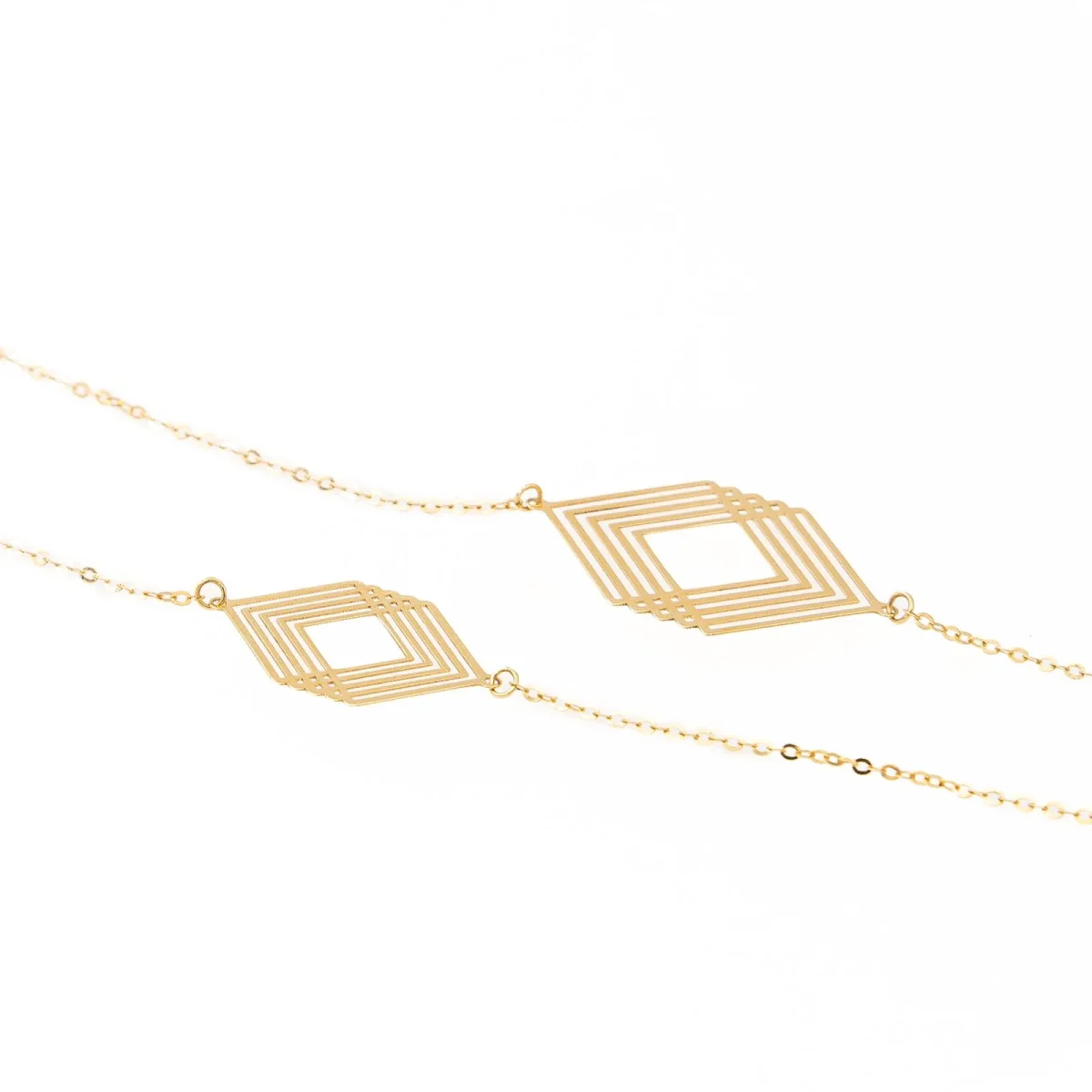 Collier sautoir en or jaune 750 millièmes (18 carats) testé, maille forçat limée, doté de 4 motifs géométriques de 2 dimensions différentes, premières dimensions : 2,10 cm x 1,40 cm, deuxièmes dimensions: 2,75 cm x 1,80 cm, longueur: 80 cm, Poids total: 2,77 g, Excellent état