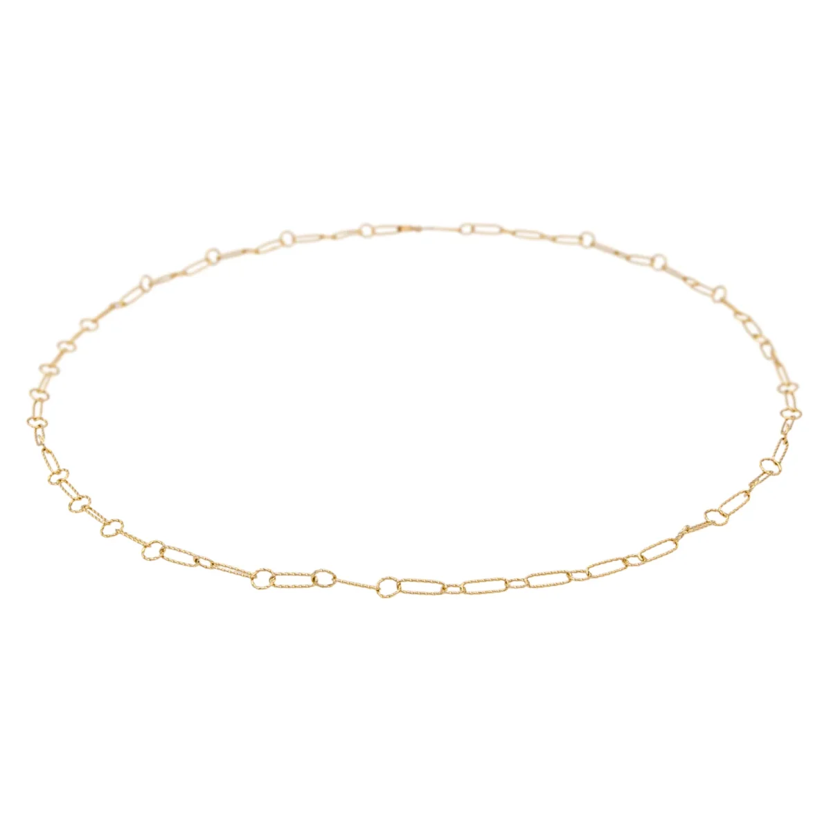 Chaîne sautoir en or jaune 750 millièmes (18 carats), maille filigrane, longueur : 71 cm, largeur : 0,34 cm, poids total : 12,44 g, poinçon tête d’aigle, excellent état