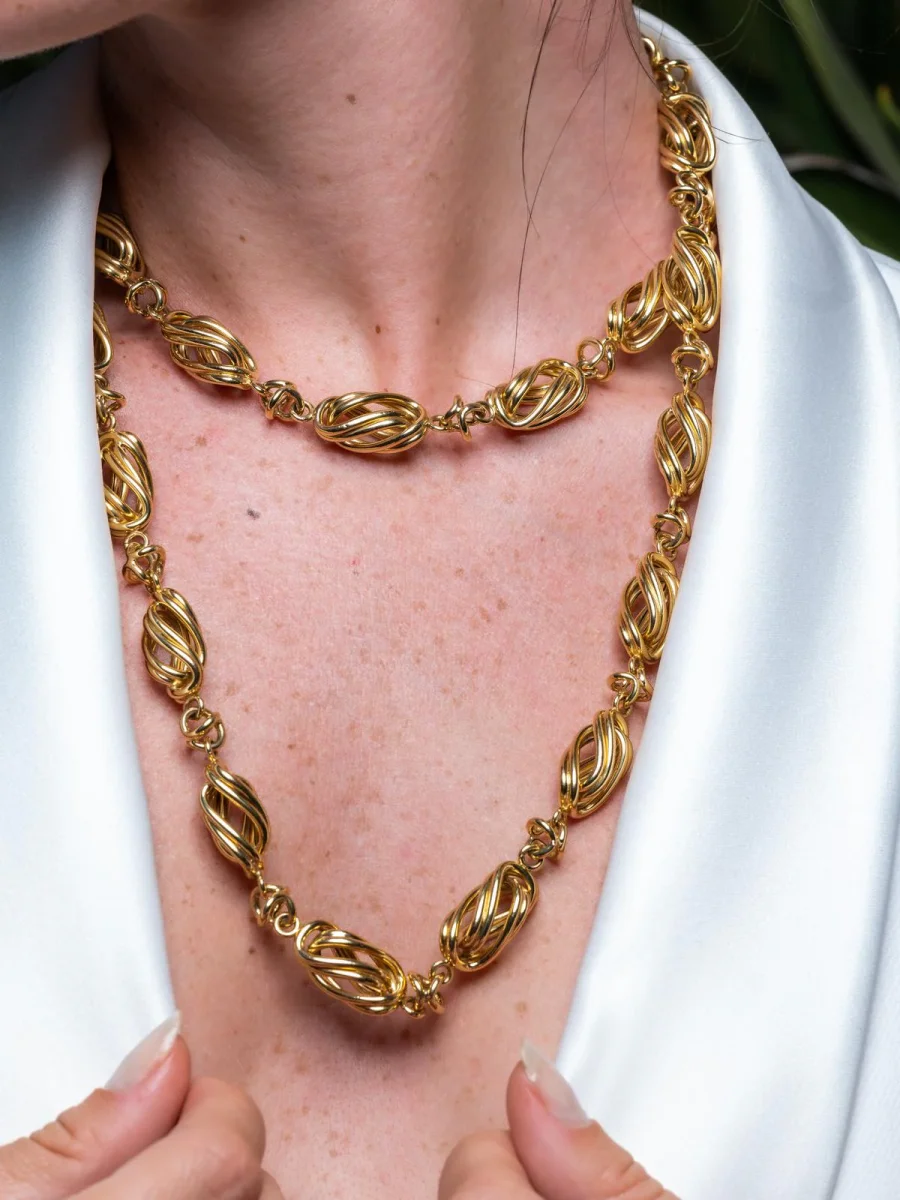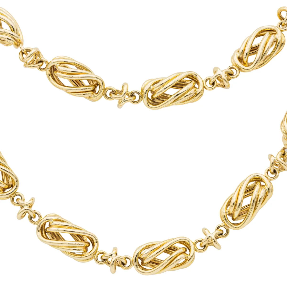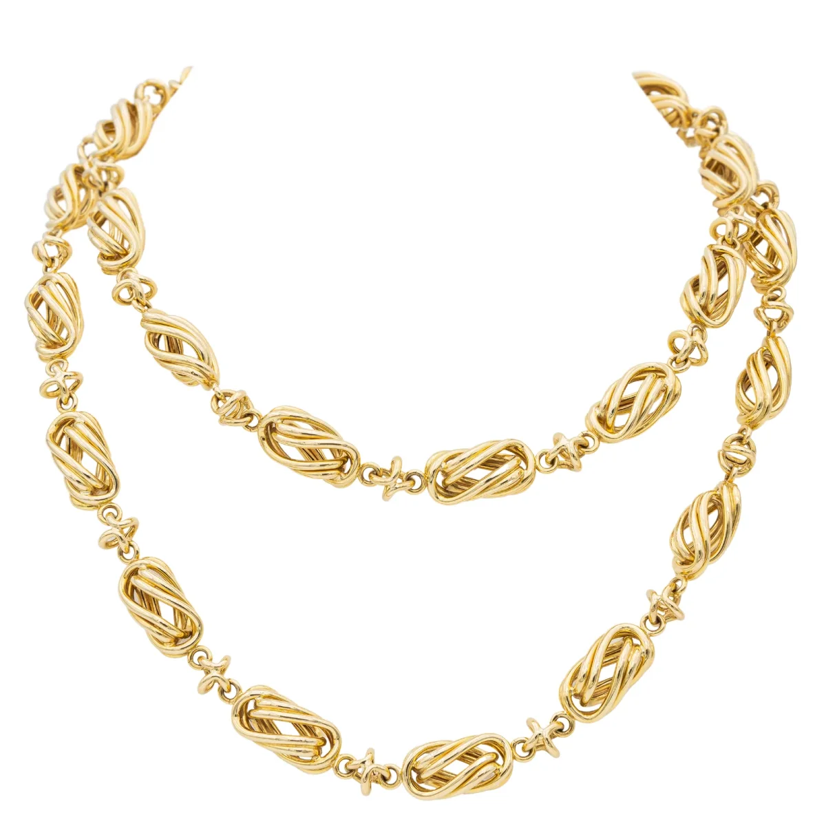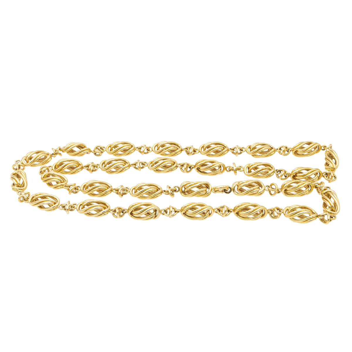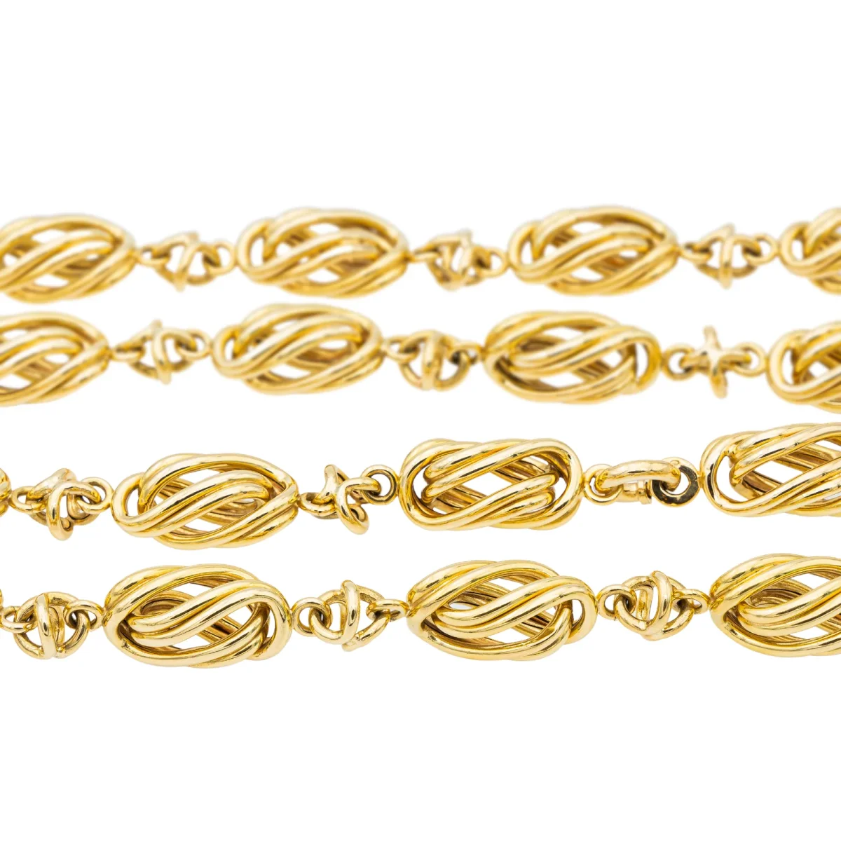 Magnifique collier en or jaune 750 millièmes (18 carats), sautoir de 102 cm de longueur, largeur: 1,16 cm, peut se porter en un ou deux tours, poids total: 108,68 g, poinçonné, excellent état