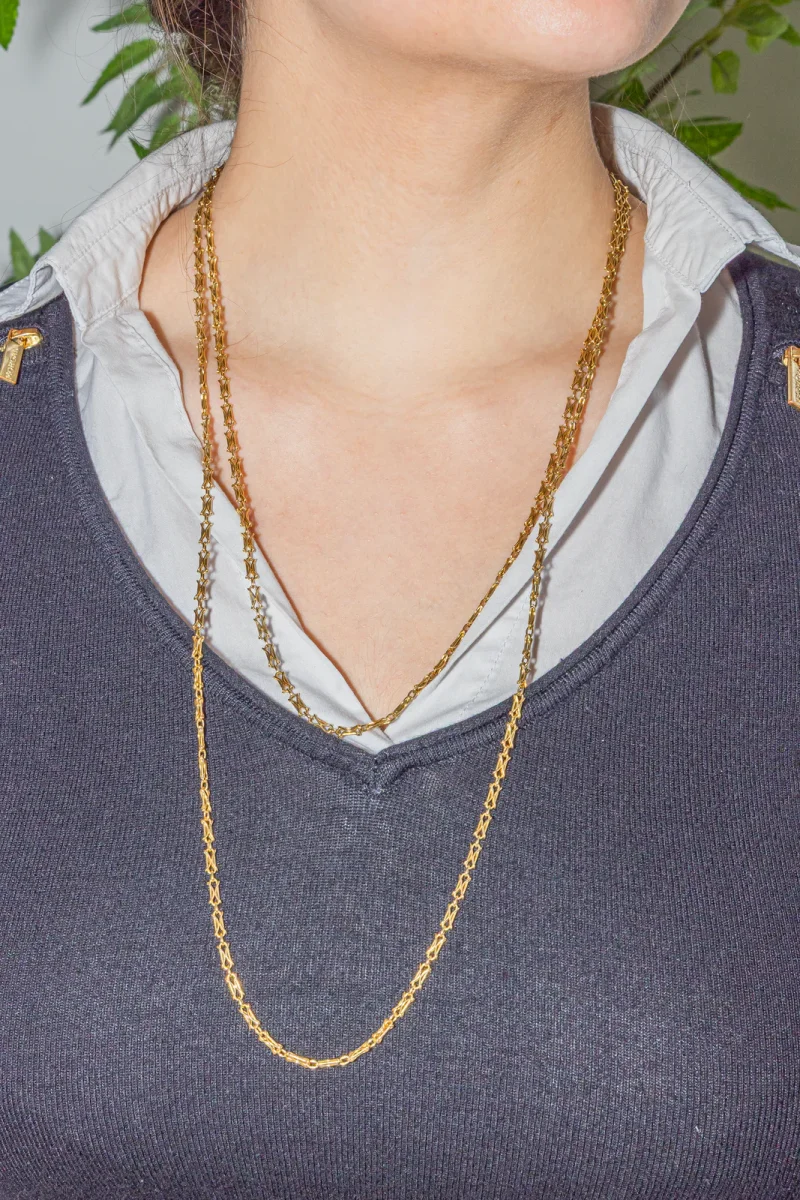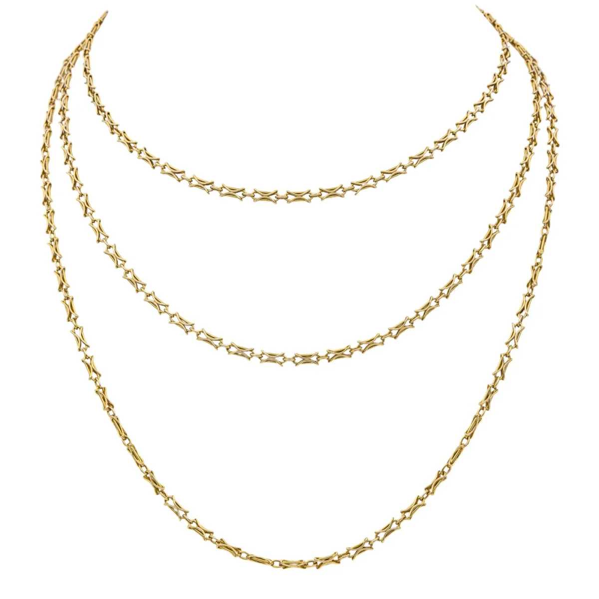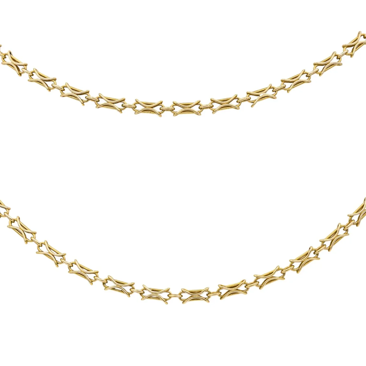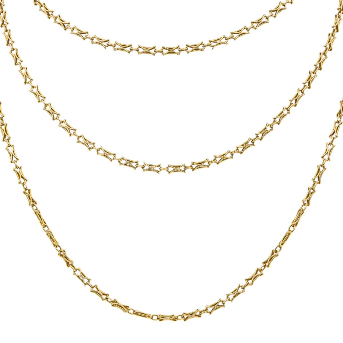 Collier en or jaune 750 millièmes (18 carats), sautoir de longueur: 142 cm, largeur: 0,38 cm, peut se porter en plusieurs tours, poids total: 38,71 g, poinçon tête d’aigle, excellent état