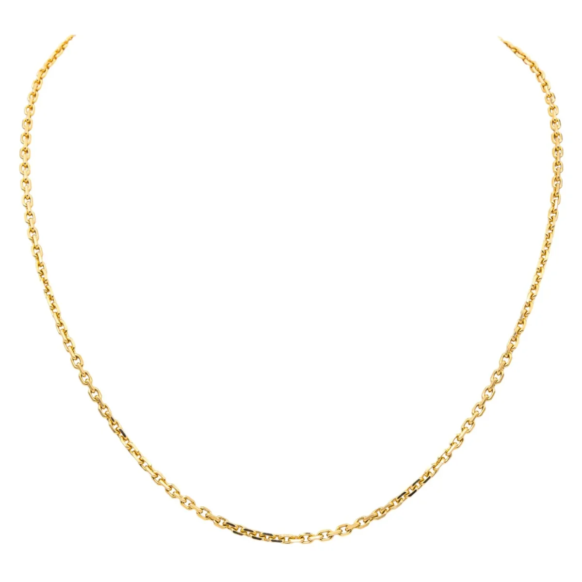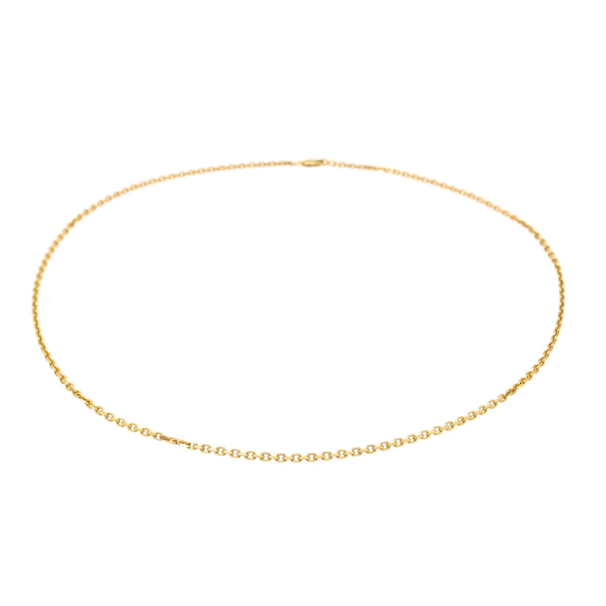Chaîne en or jaune 750 millièmes (18 carats), maille forçat, longueur : 67 cm, largeur : 0,27 cm, fermoir à mousqueton, poids total : 25,88 g, poinçon tête d’aigle, excellent état