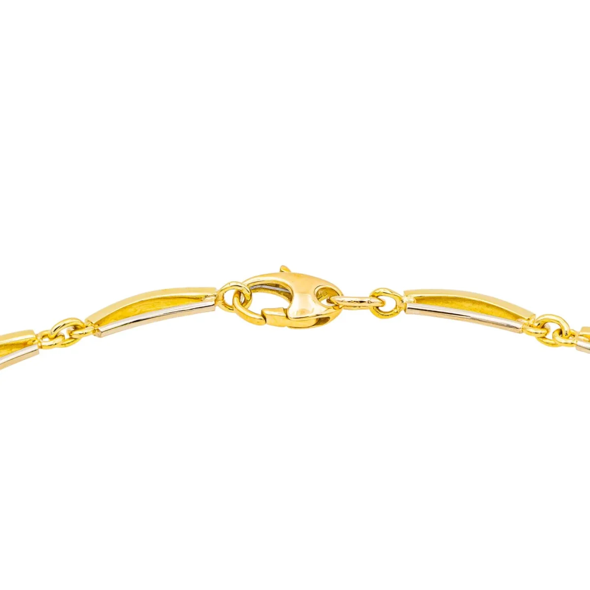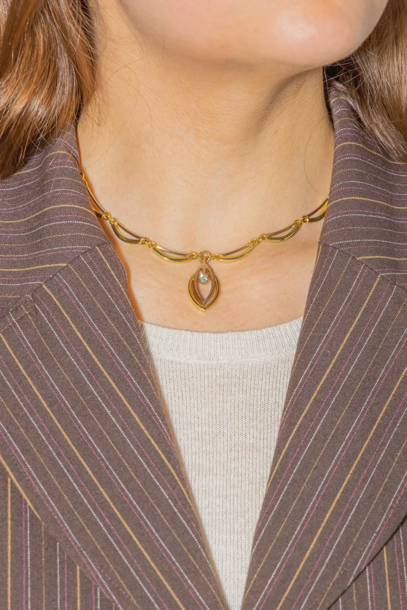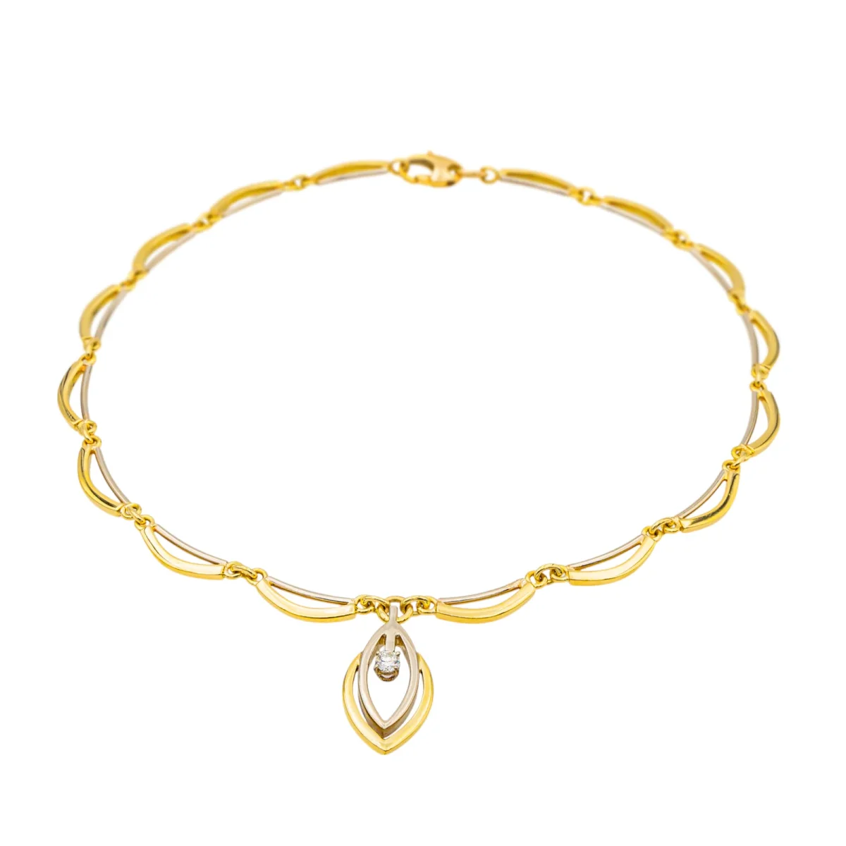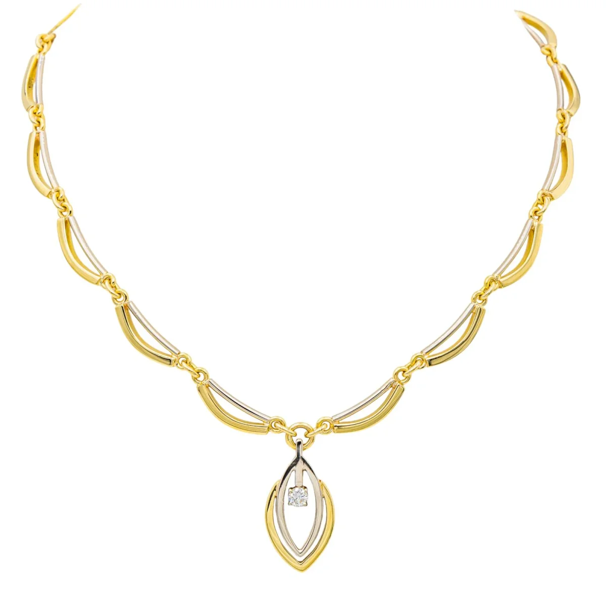 Collier en or jaune et blanc 750 millièmes (18 carats), serti d’un diamant, taille brillant, environ H-VS, d’un poids d’environ 0,23 ct, longueur : 40,00 cm, largeur de la chaîne : 0,56 cm, longueur du motif : 2,78 cm, largeur : 1,44 cm, poids total : 40,72 g, poinçon hibou, excellent état