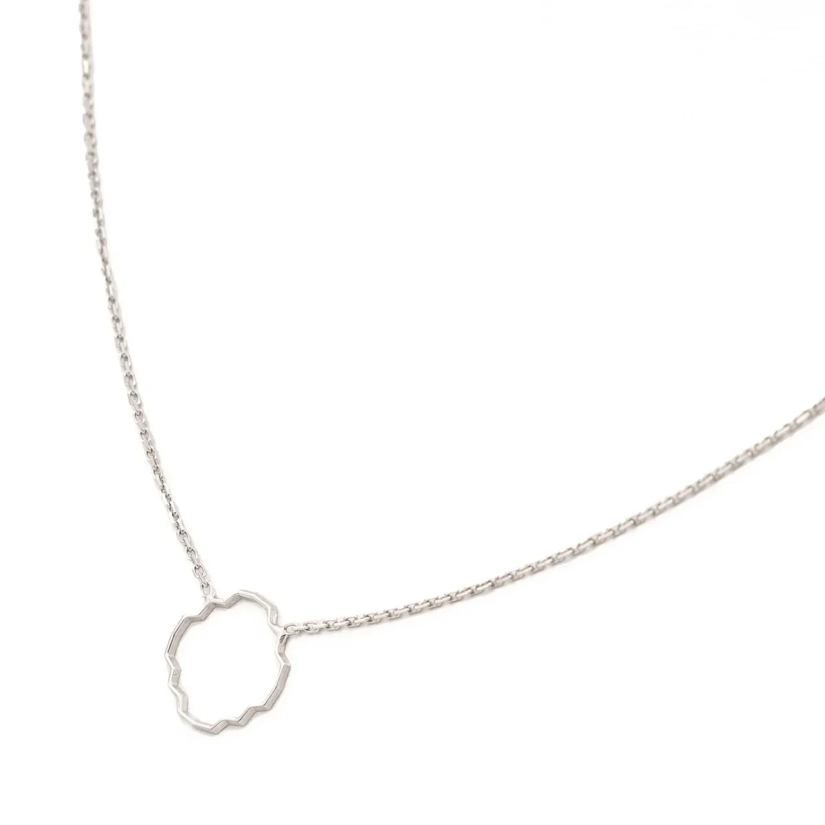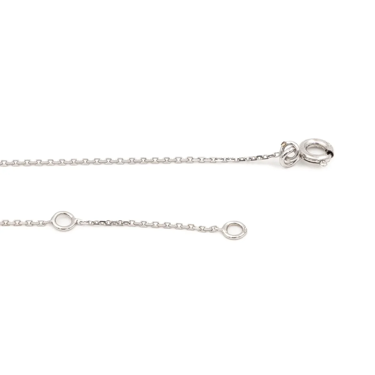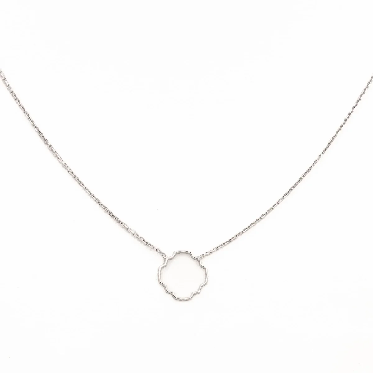 Collier en or blanc 750 millièmes (18 carats), motif graphique en tranparence sur chaîne en maille forçat, dimensions du motif: 1 cm x 1 cm, largeur de la chaîne: 0,7 mm, longueur collier: 40 cm avec anneau intermédiaire à 38 cm, poids total: 1,53 g, poinçon tête d’aigle, état neuf