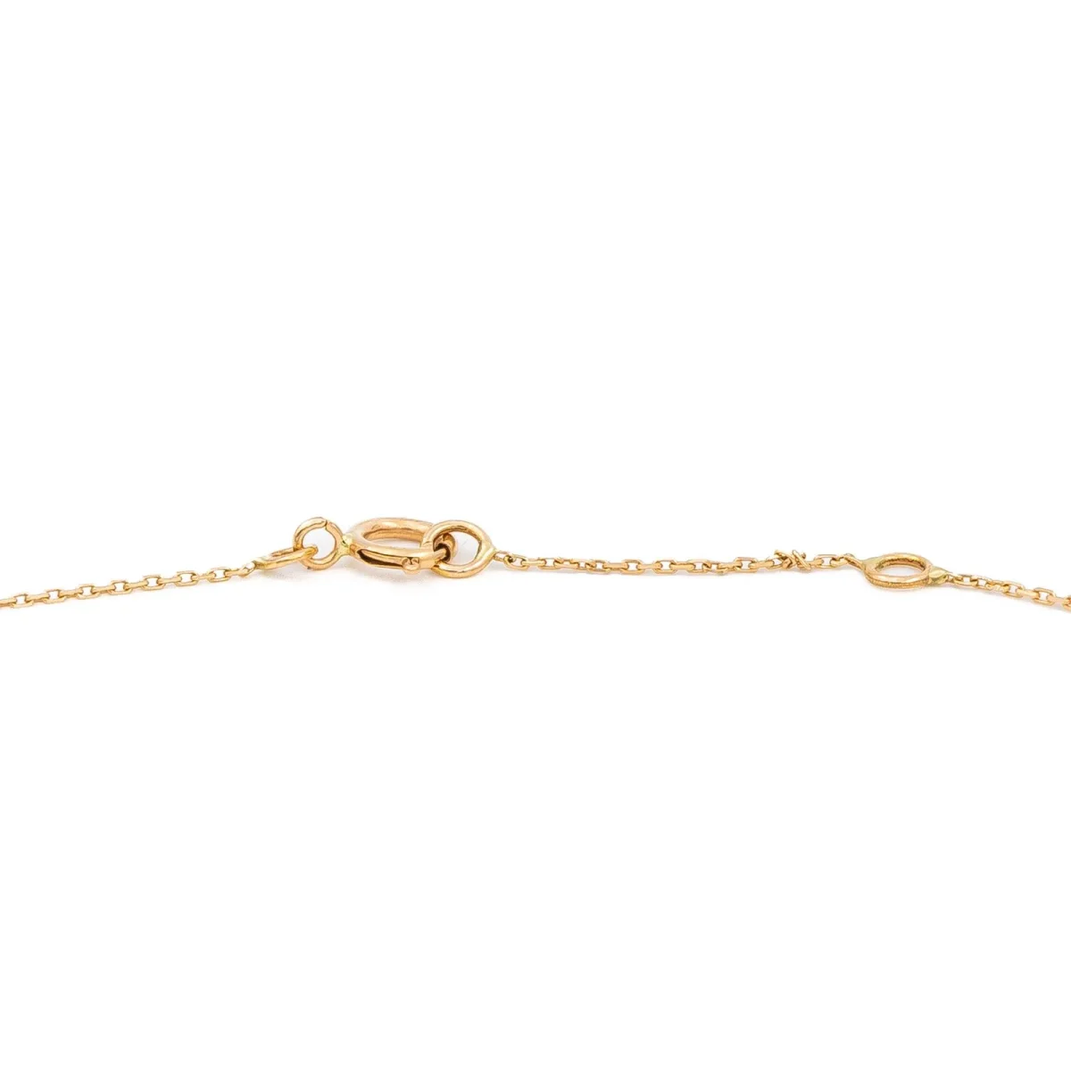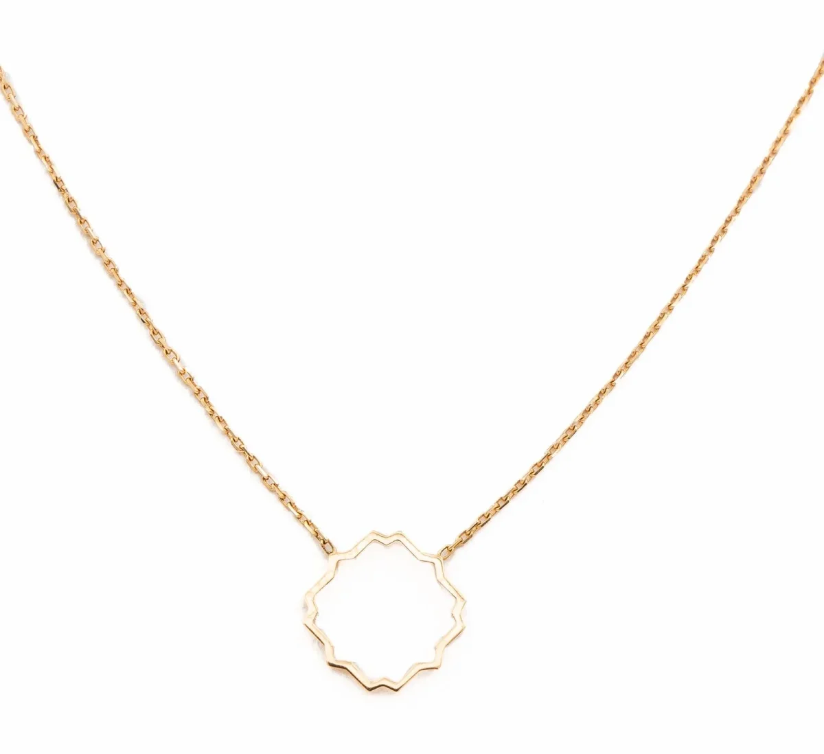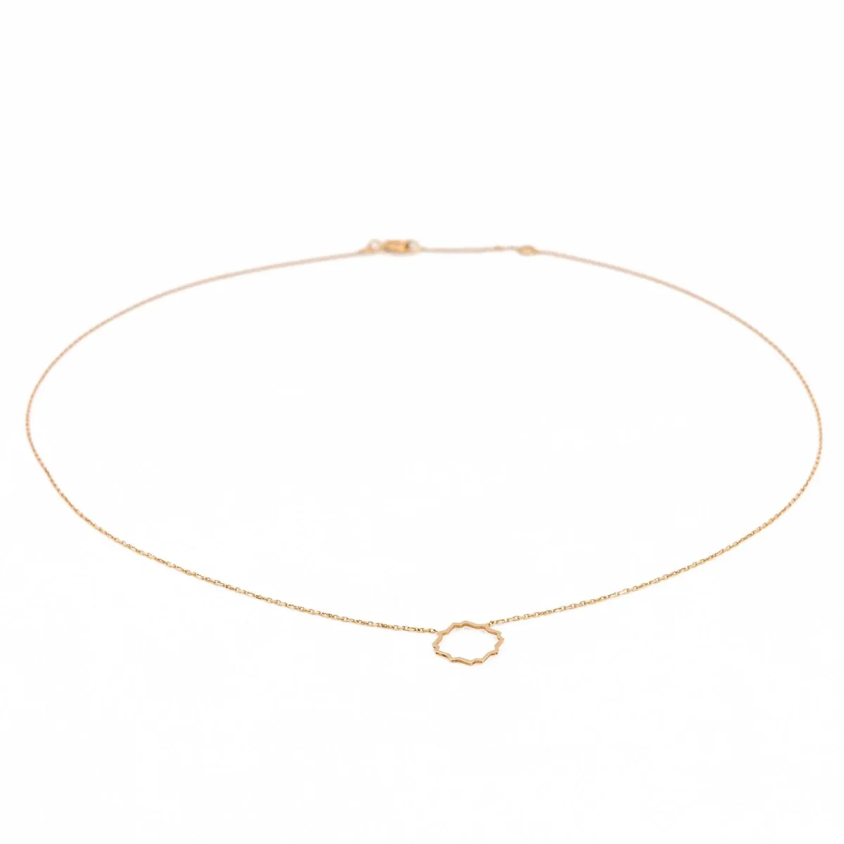 Collier en or rose 750 millièmes (18 carats), motif graphique en tranparence sur chaîne en maille forçat, dimensions du motif: 1 cm x 1 cm, largeur de la chaîne: 0,7 mm, longueur collier: 40 cm avec anneau intermédiaire à 38 cm, poids total: 1,08 g, poinçon tête d’aigle, état neuf