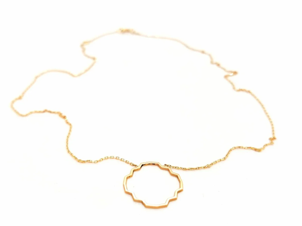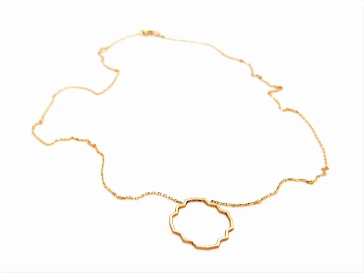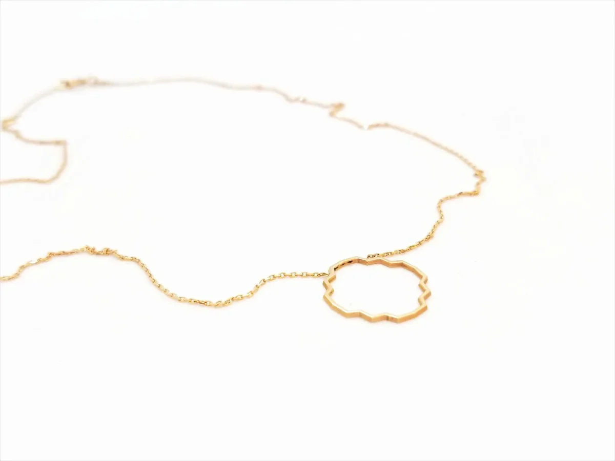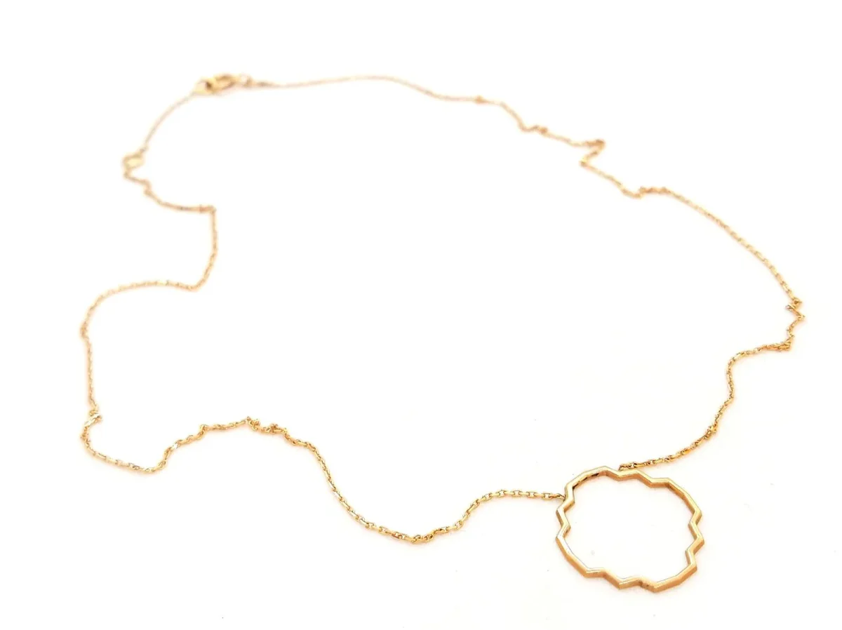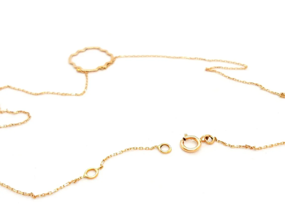 Collier en or rose 750 millièmes (18 carats), motif graphique en tranparence sur chaîne en maille forçat, dimensions du motif: 1,52 cm x 1,52 cm, largeur de la chaîne: 0,7 mm, longueur collier: 40 cm avec anneau intermédiaire à 38 cm, poids total: 1,29 g, poinçon tête d’aigle, état neuf