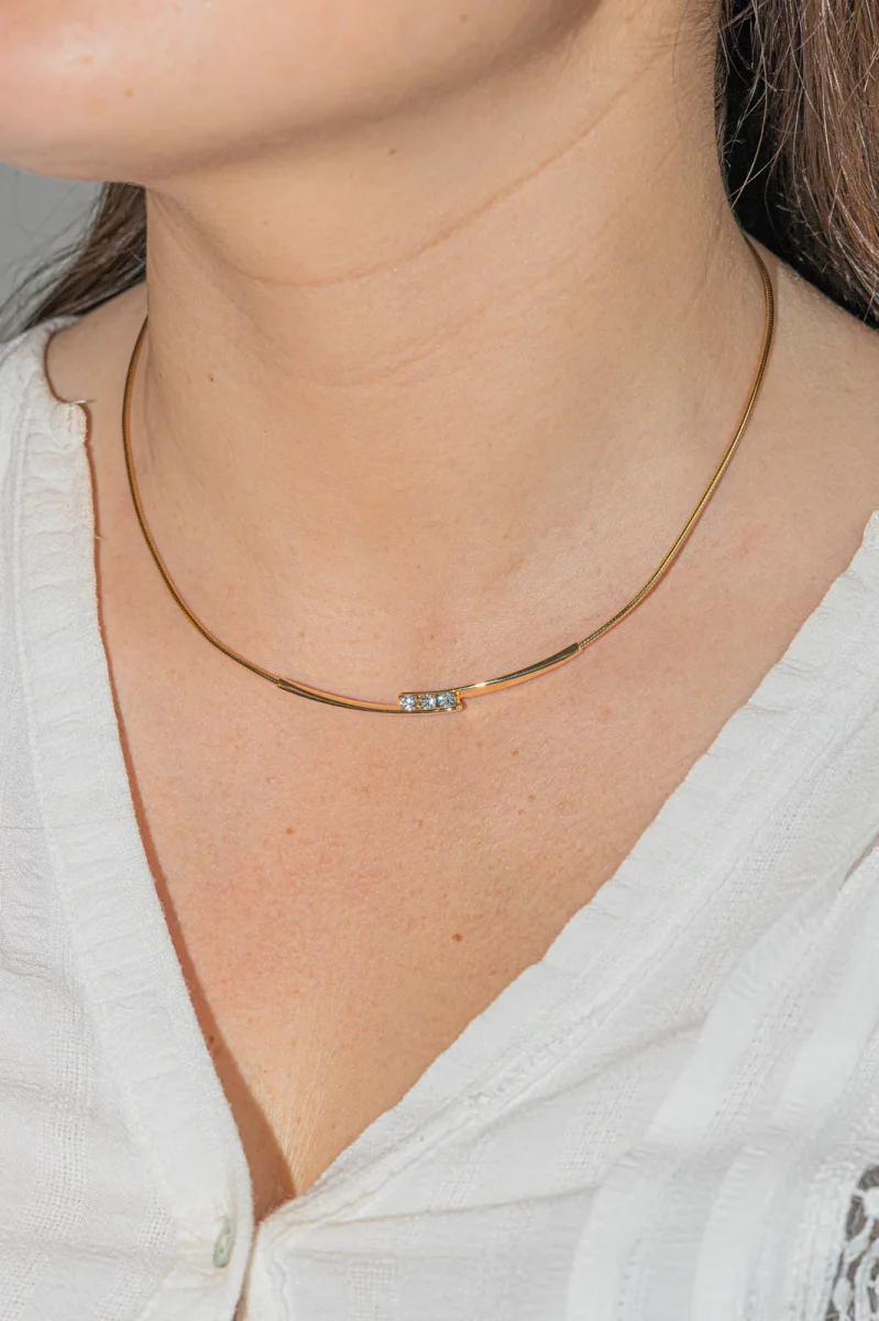 Collier trilogie en or jaune 750 millièmes (18 carats), motifs sertis de diamants taille brillant, environ H-SI, poids total diamants : 0,33 ct, (3 diamants de 0,11 ct environ), longueur: 41,00 cm, longueur de la partie comprenant les motifs: 5,70 cm, largeur: 0,44 cm, poids total: 14,43 g, poinçon tête d’aigle, excellent état