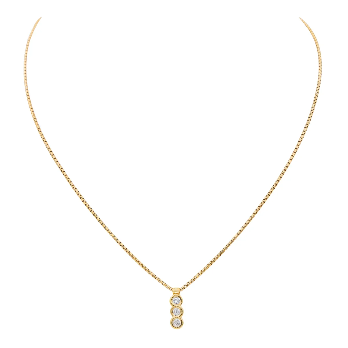 Collier en or jaune 750 millièmes (18 carats), pendentif trilogie, 3 diamants taille brillant environ H-SI, d’environ 0,11 ct chacun, poids total diamants environ 0,33 ct, maille souple, dimensions du pendentif avec la bélière: 1,48 cm, largeur: 5,00 cm, longueur de la chaine : 42,00 cm, largeur de la chaine : 0,13 cm, poids total : 6,34 g, poinçon tête d’aigle, excellent état