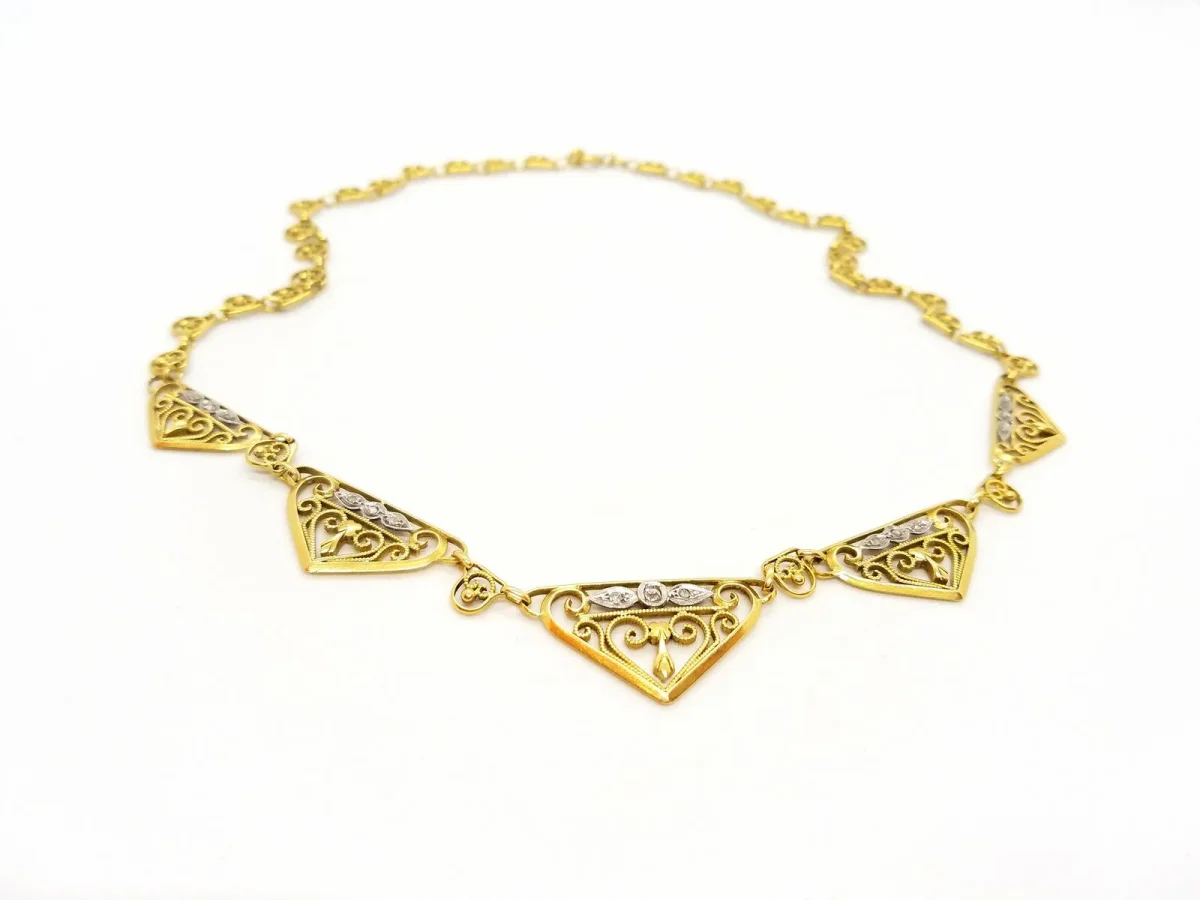 Collier vintage, en or jaune 750 millièmes (18 carats), en filigrane, 5 motifs pavés sur platine de 3 diamants chacuns, 15 diamants au total taille ancienne H-SI pour environ 0,10 ct, longueur: 44 cm, dimensions du motif central: 3 cm x 1,7 cm, poids toal: 19,32 g, poinçon tête d’aigle, excellent état