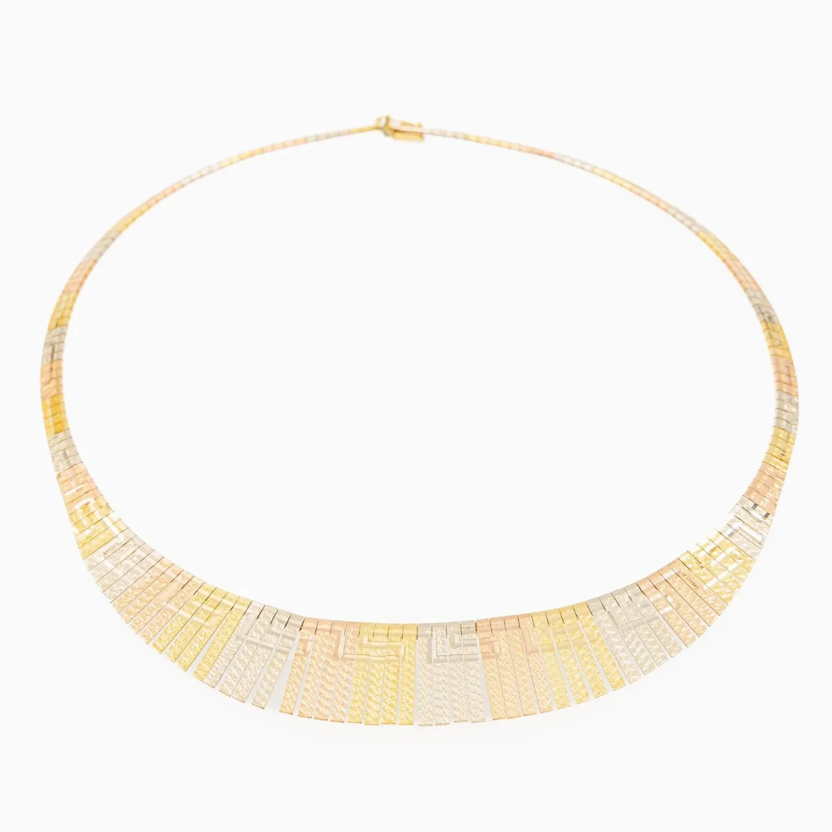 Collier en chute trois ors 750 millièmes (18 carats), longueur: 45,0 cm, largeur sur le devant: 2,14 cm, largeur au dos: 0,46 cm, épaisseur: 0,13 cm, poids total: 41,22 g, poinçon hibou, excellent état