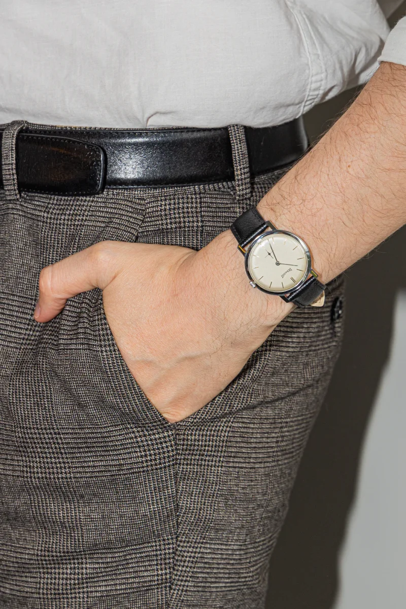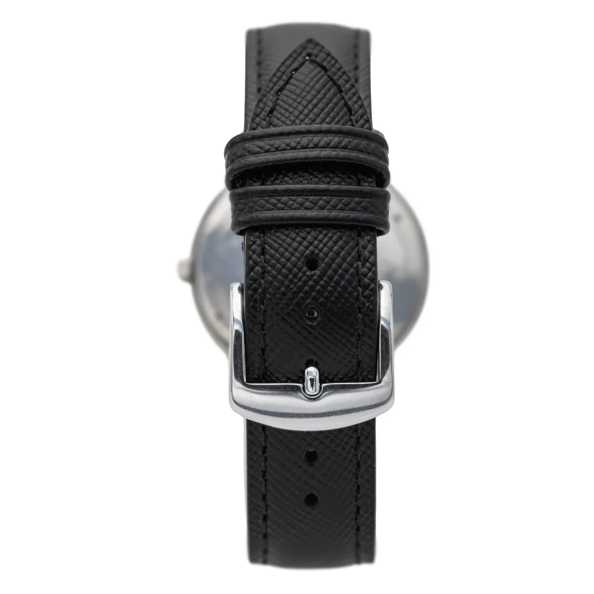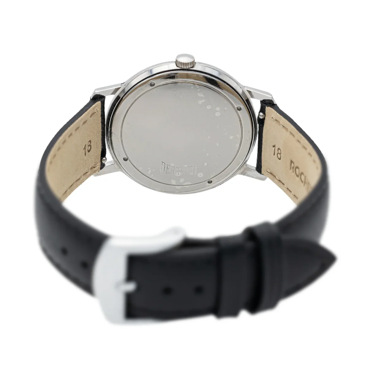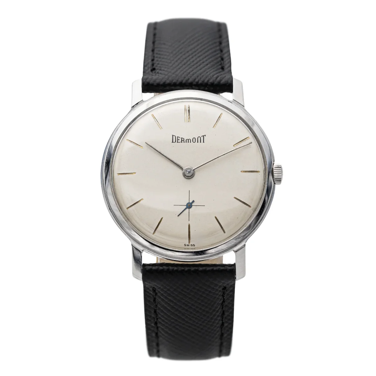 Montre Dermont acier, cadran argent à index bâton, mouvement mécanique à remontage automatique, boitier 34mm, verre saphir, bracelet cuir à boucle ardillon (Taille poignet 21cm ajustable, Largeur bracelet 1,62cm) poids total 24,21g, année 1990, Excellent état