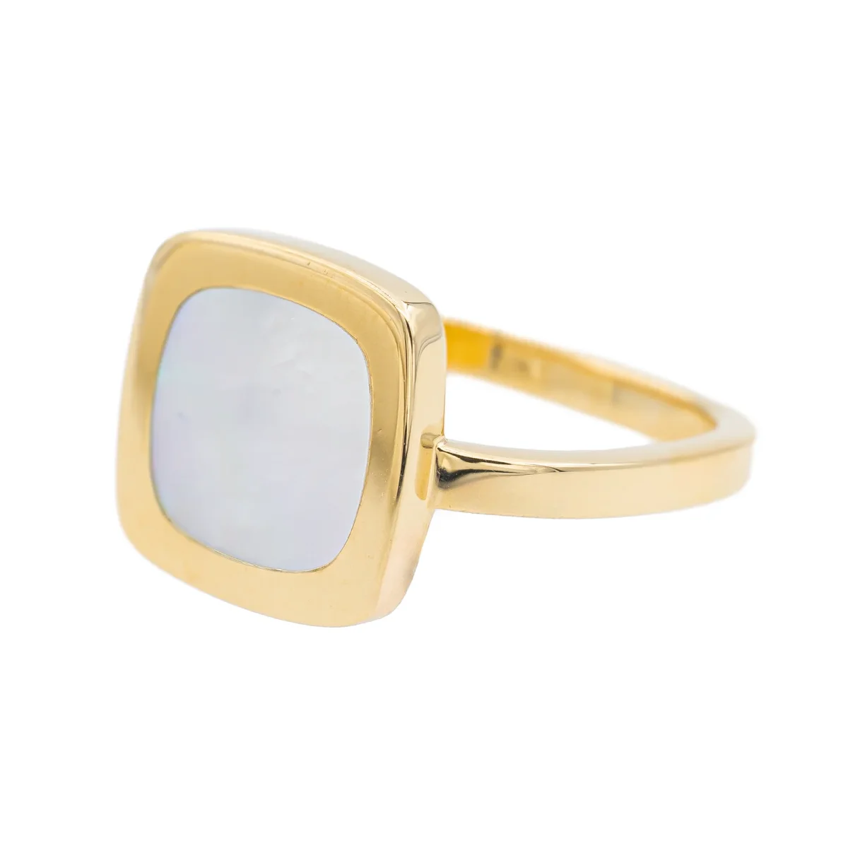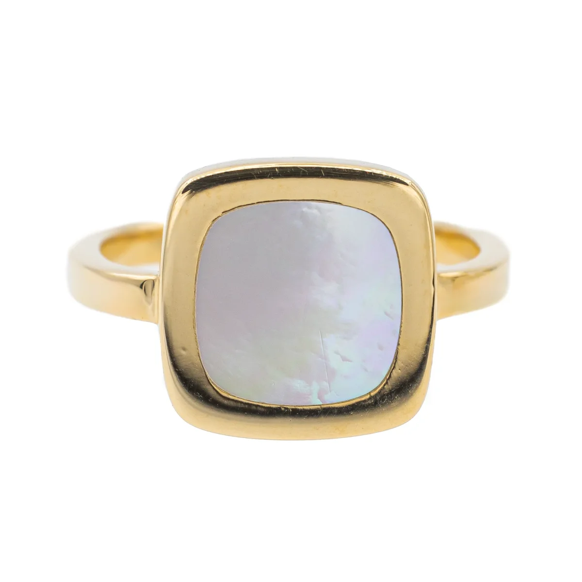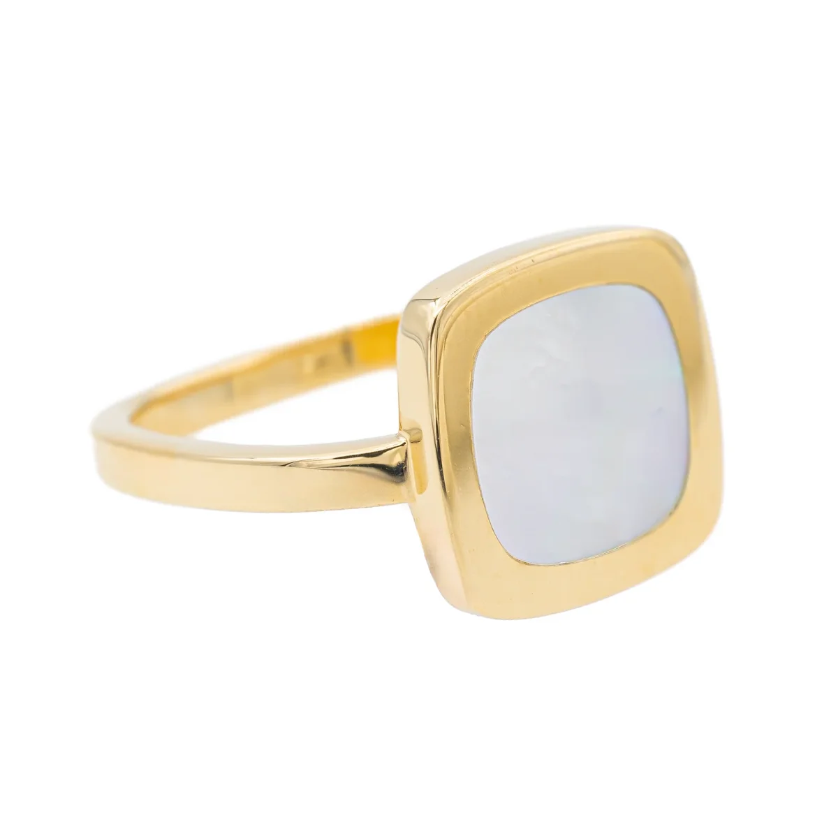 Bague signée de la Maison Dinh Van, collection « Impression », en or jaune 750 millièmes (18 carats), sertie de nacre blanche, largeur du motif sur le dessus: 1,21 cm, tour de doigt: 56, poids total: 5,73 g, poinçon tête d’aigle, excellent état