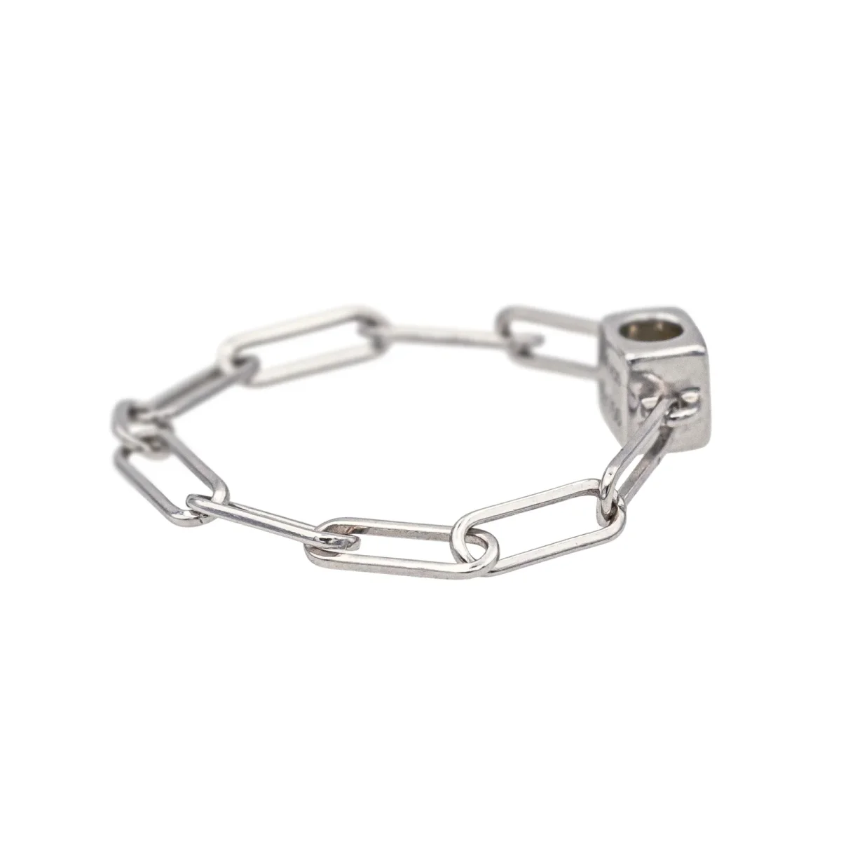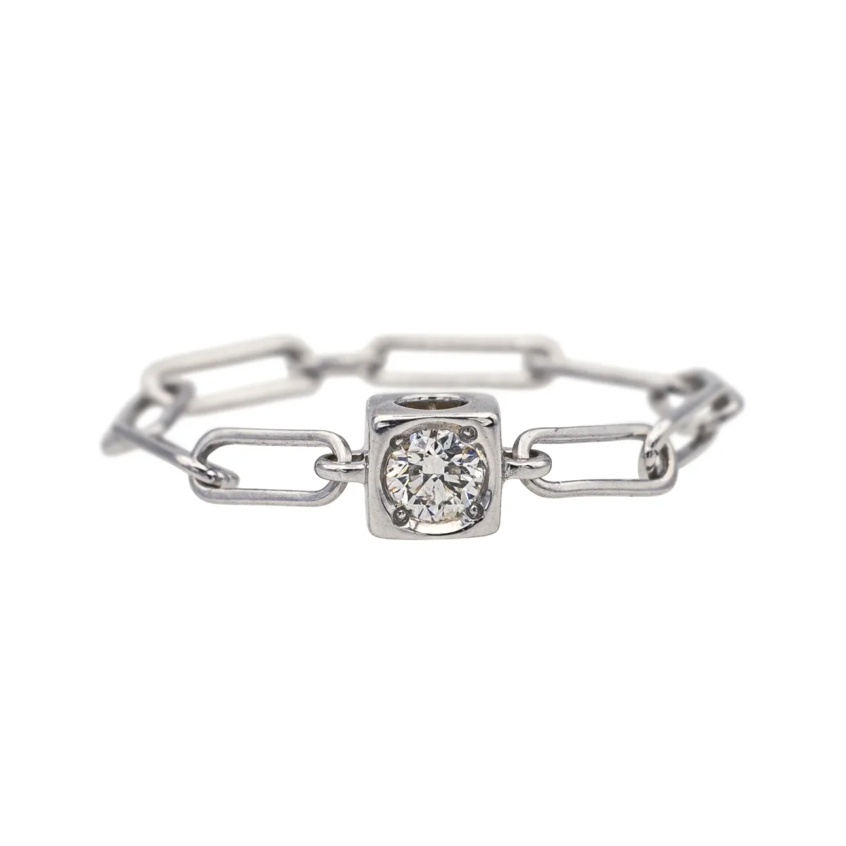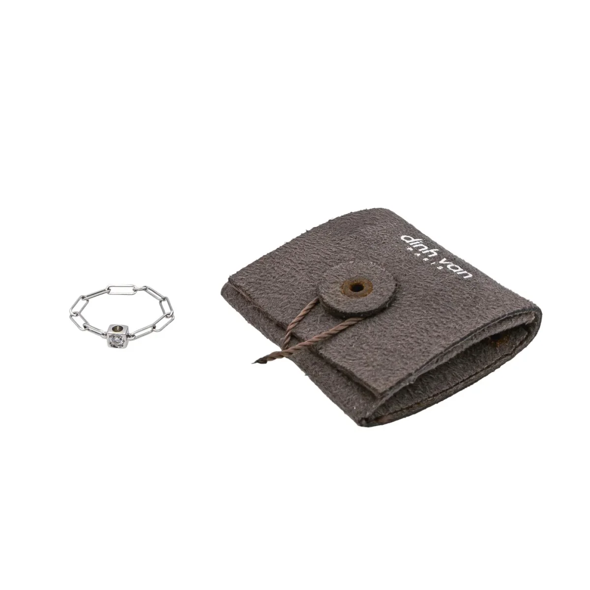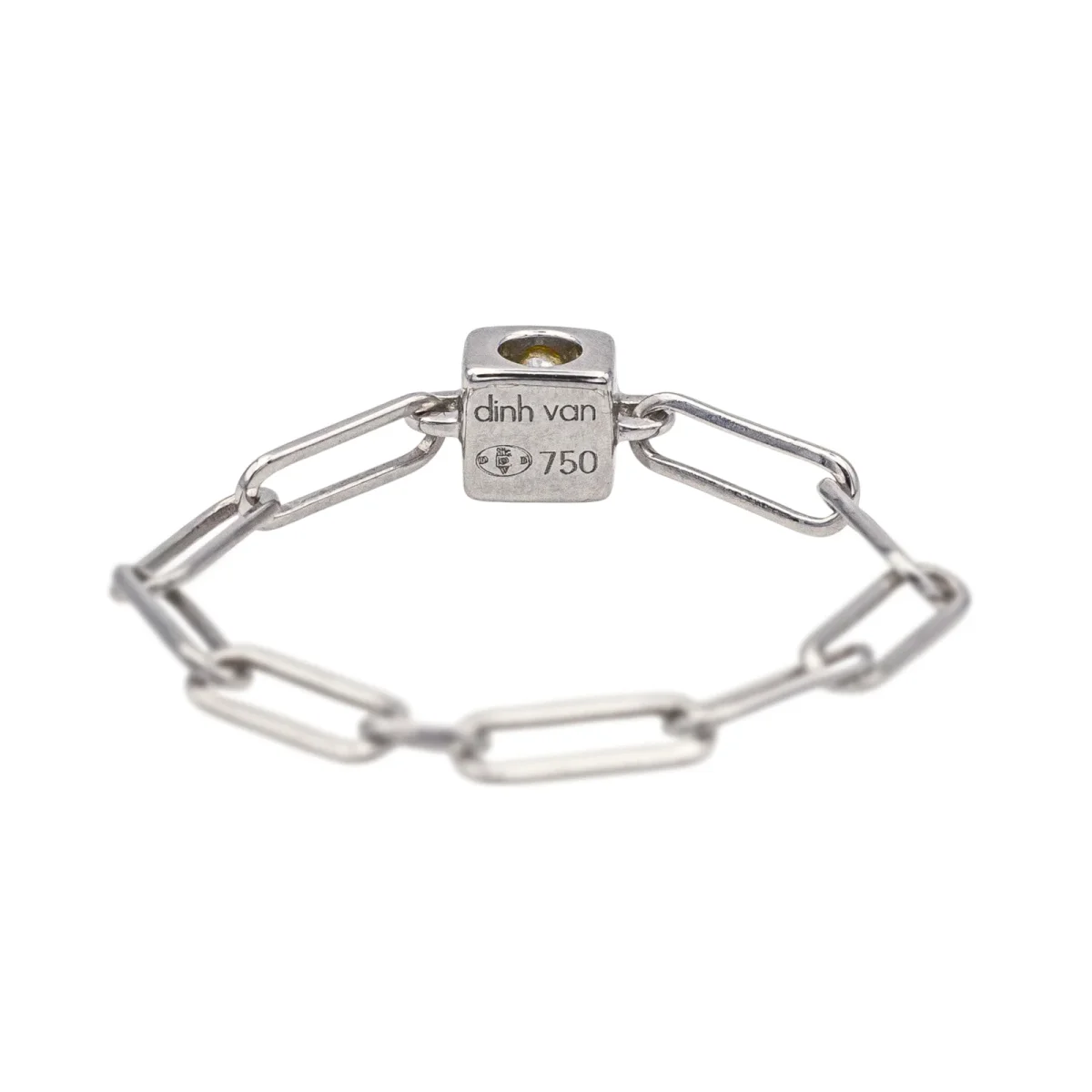 Bague signée de la Maison Dinh Van en or blanc 750 millièmes (18 carats), modèle Cube, sertie d’un diamant taille brillant environ G-VS, d’un poids total d’environ 0,06 ct, largeur sur le dessus : 0,36 cm, tour de doigt : 50, poids total : 0,70 g, vendu avec pochon, excellent état