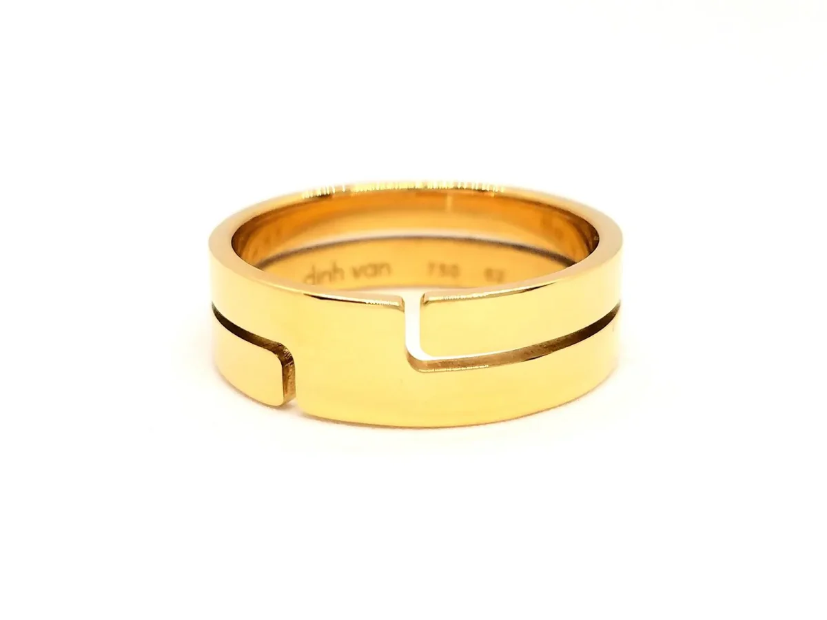 Bague signée de la maison Dinh Van, collection Seventies, moyen modèle, en or jaune 750 millièmes (18 carats), taille: 62, largeur: 0,65 cm, poinçon tête d’aigle, poids total: 9,05 g, excellent état, prix neuf: 1790€