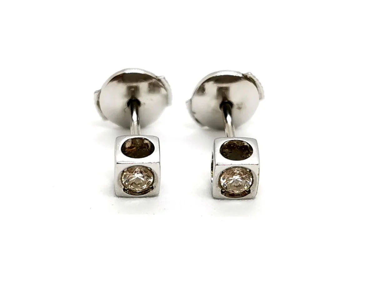 Boucles d’oreilles signées de la maison Dinh Van, Puces d’oreilles, collection Le Cube diamant, Moyen modèle, en or blanc 750 millièmes (18 carats) testé, serties de deux diamants, taille brillant, environ G/VS, d’environ 0,07 ct chacun, poids total diamants: environ 0,14 ct, dimensions: 0,35 cm x 0,35 cm, fermoir alpa, poids total: 1,16 g, excellent état