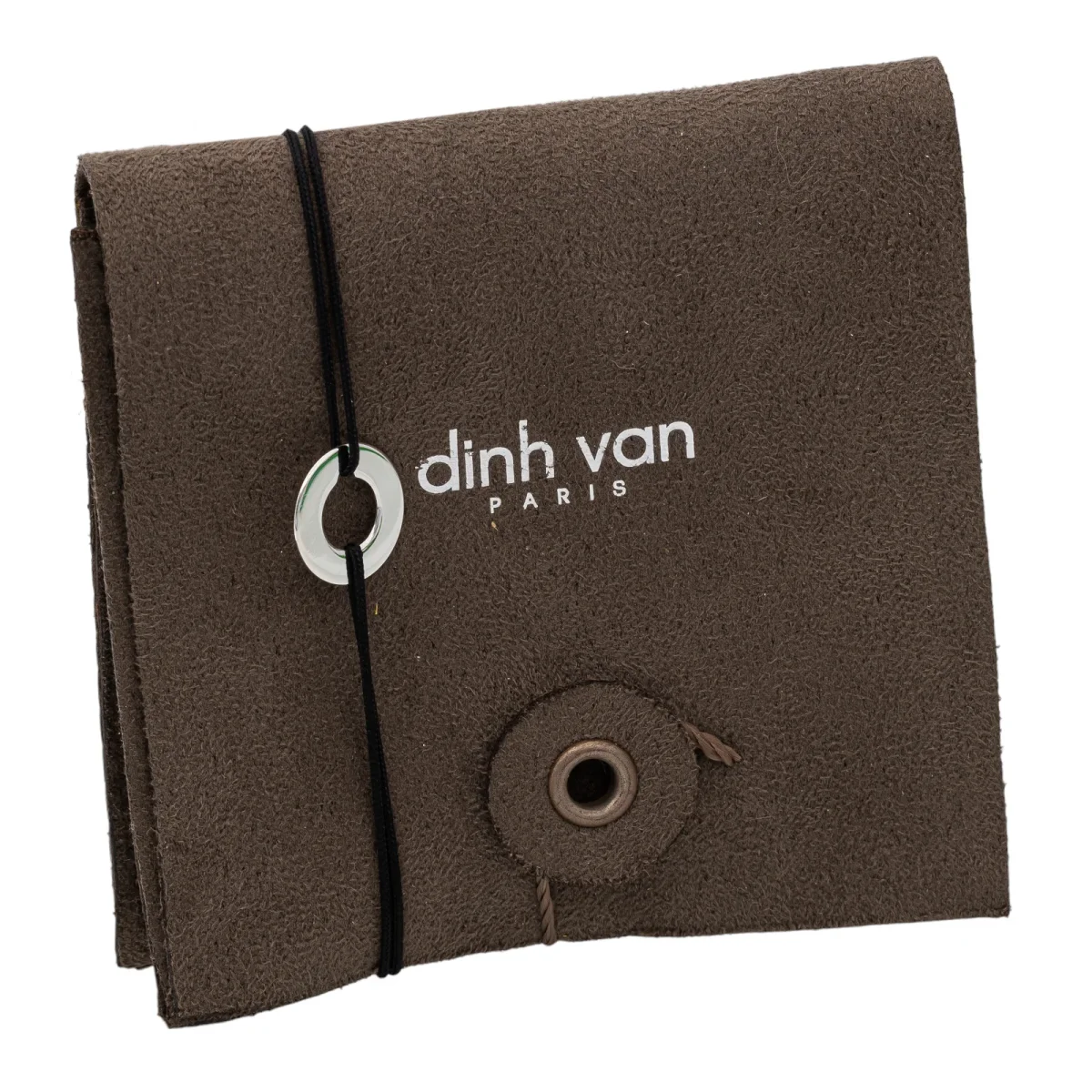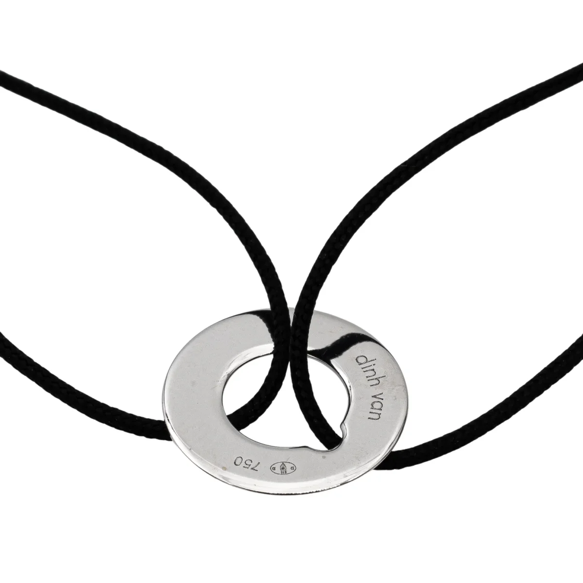 Bracelet signé de la Maison Dinh Van, petit modèle Cible, or blanc 750 millièmes (18 carats), diamètre du motif: 1,20 cm, taille ajustable grâce aux noeuds coulissants du cordon, poids total: 0,64 g, prix neuf: 350€, vendu avec l’écrin d’origine, excellent état