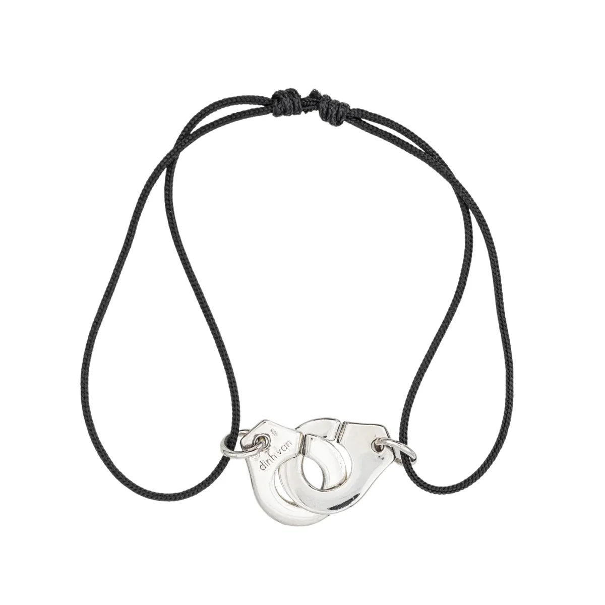 Bracelet cordon signé de la Maison Dinh Van en argent 925, modèle Menottes R12, testé, longueur : 23 cm, largeur : 1,2 cm, épaisseur : 0,12 cm, taille ajustable grâce aux nœuds coulissants du cordon, poids total : 2,62 g, excellent état