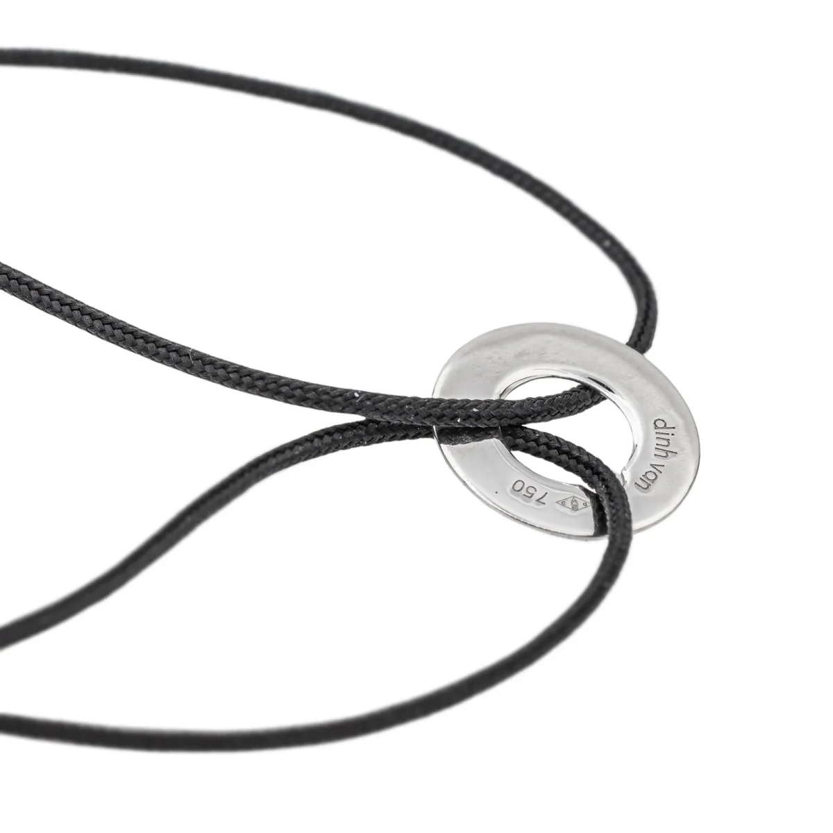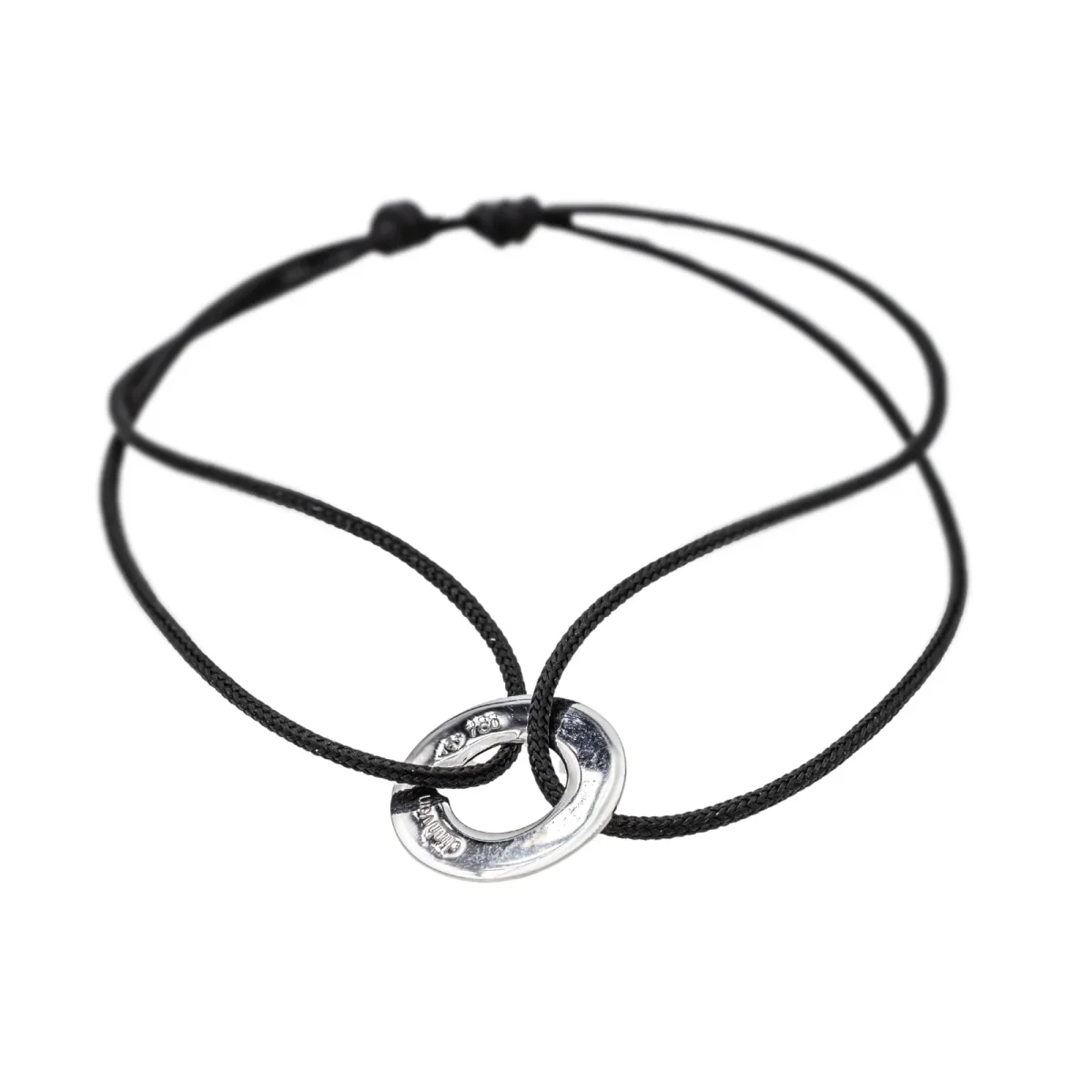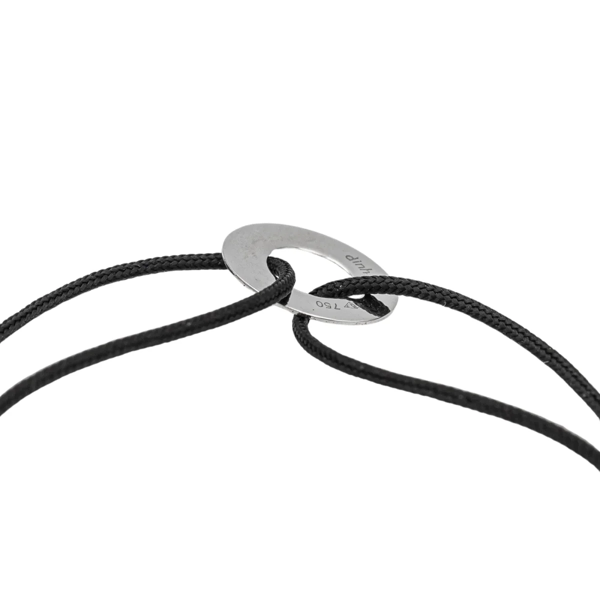 Bracelet cordon signé de la Maison Dinh Van en or blanc 750 millièmes (18 carats) testé, petit modèle cible, longueur : 15,00 cm, taille ajustable jusqu’à 26,00 cm grâce aux nœuds coulissants du cordon, largeur : 1,20 cm, épaisseur du cordon : 0,01 cm, poids total : 0,77 g, excellent état