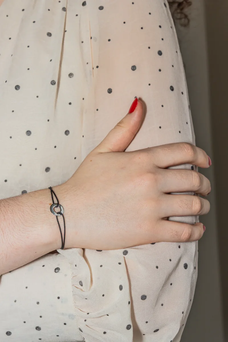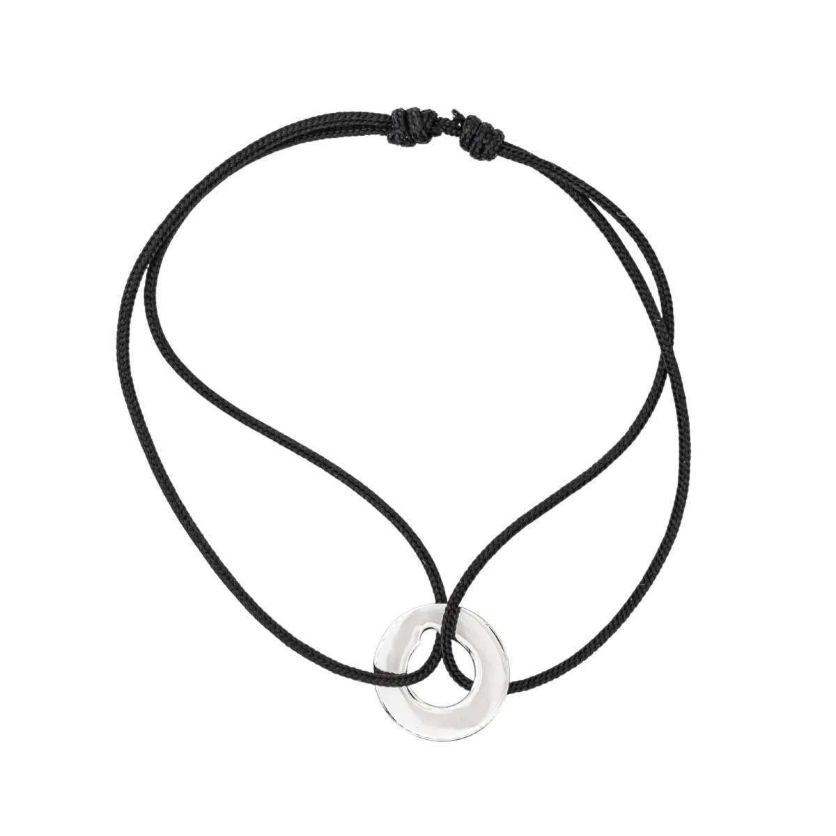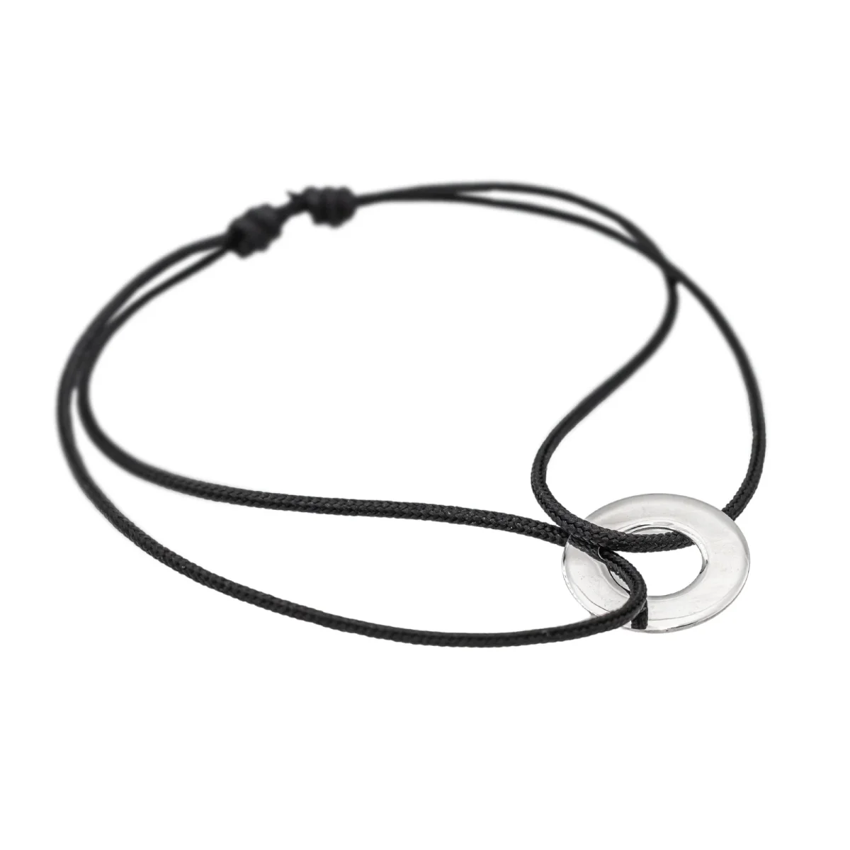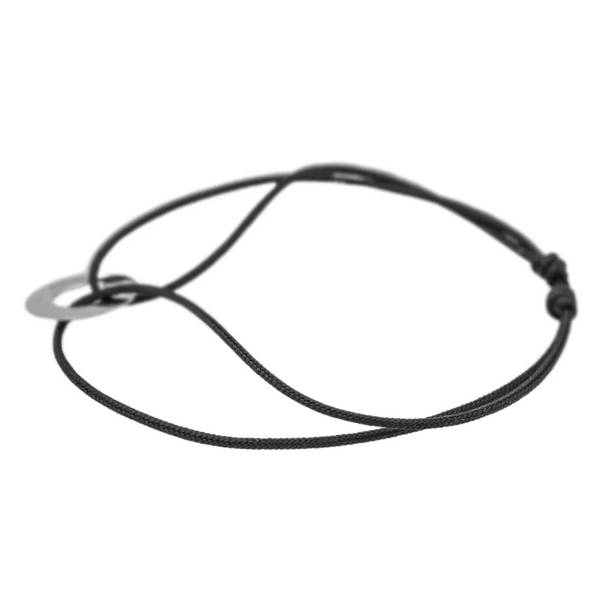 Bracelet cordon signé de la Maison Dinh Van en or blanc 750 millièmes (18 carats) testé, petit modèle cible, longueur : 15,00 cm, taille ajustable jusqu’à 26,00 cm grâce aux nœuds coulissants du cordon, largeur : 1,20 cm, épaisseur du cordon : 0,01 cm, poids total : 0,77 g, excellent état