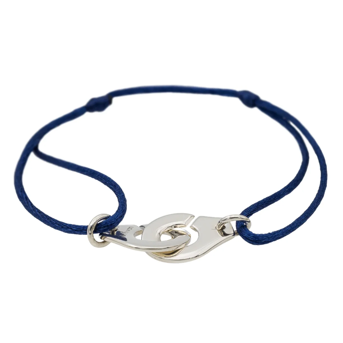 Bracelet signé de la Maison Dinh Van en argent 925 millièmes testé, modèle Menotte R12, monté sur cordon de soie bleu ajustable, dimensions de la menotte: 1,45 x 1,19 cm, dimensions du motif: 2,90 x 1,19 cm, Poids total: 2,41 g, Vendu avec sa pochette, prix du neuf: 340€, Excellent état