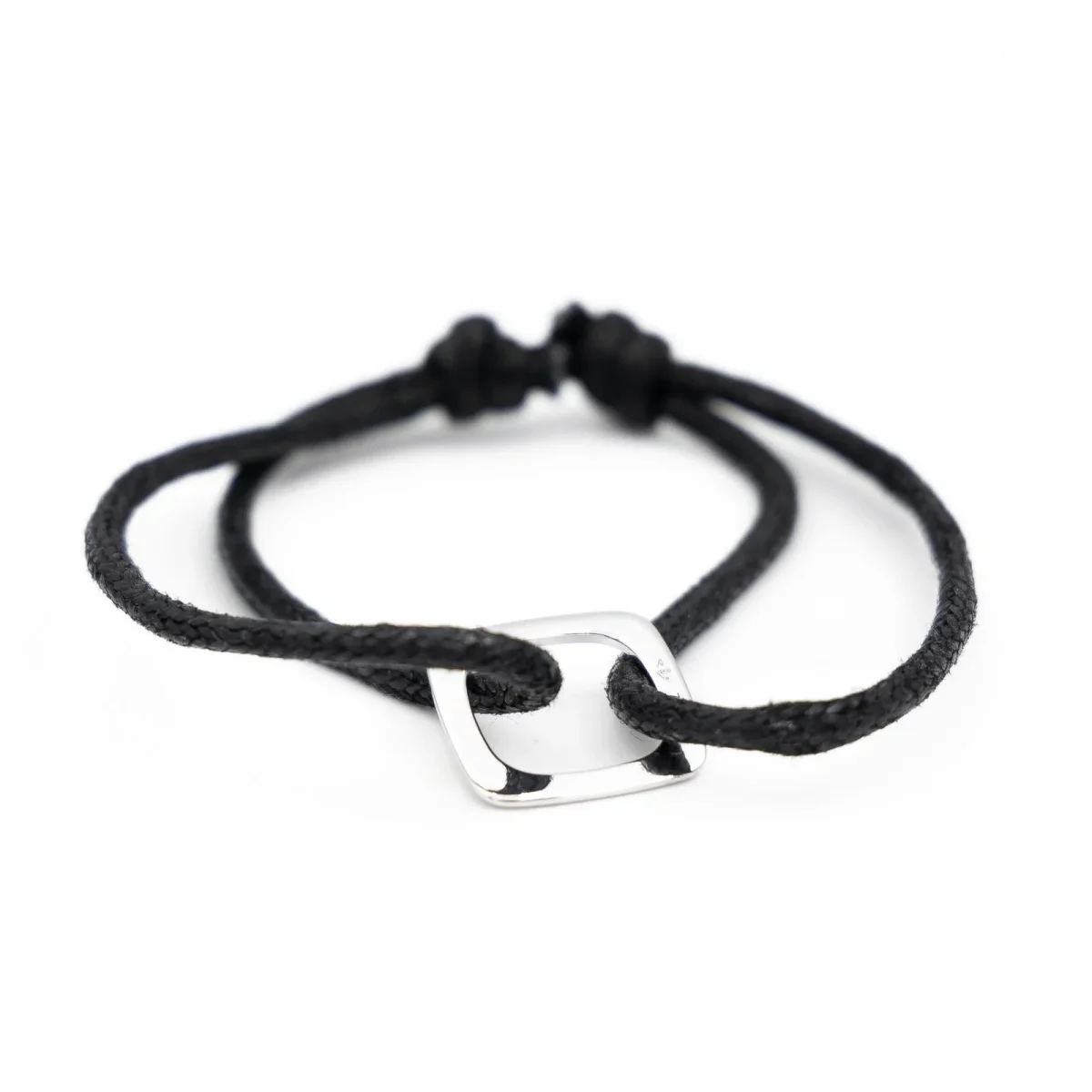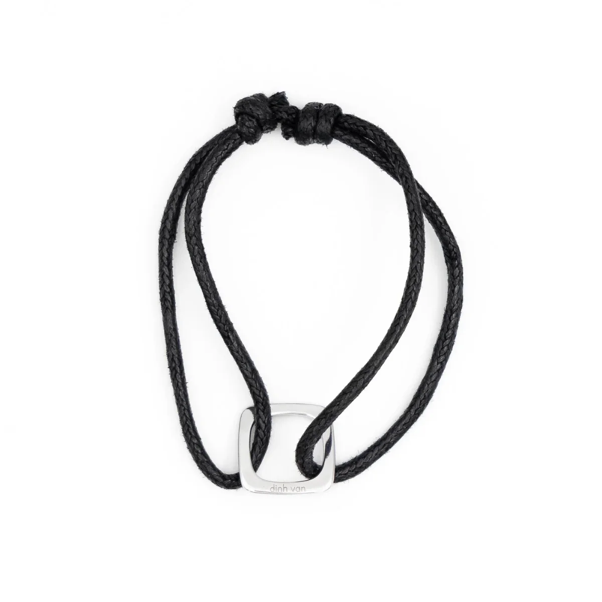 Bracelet cordon signé de la Maison Dinh Van, motif carré ajouré, en or blanc 750 millièmes (18 carats), taille ajustable, dimensions : 1,47 cm x 1,48 cm, épaisseur: 0,9 cm, poids total bracelet: 2,28 g, taille du bracelet réglable, poinçon tête d’aigle, excellent état