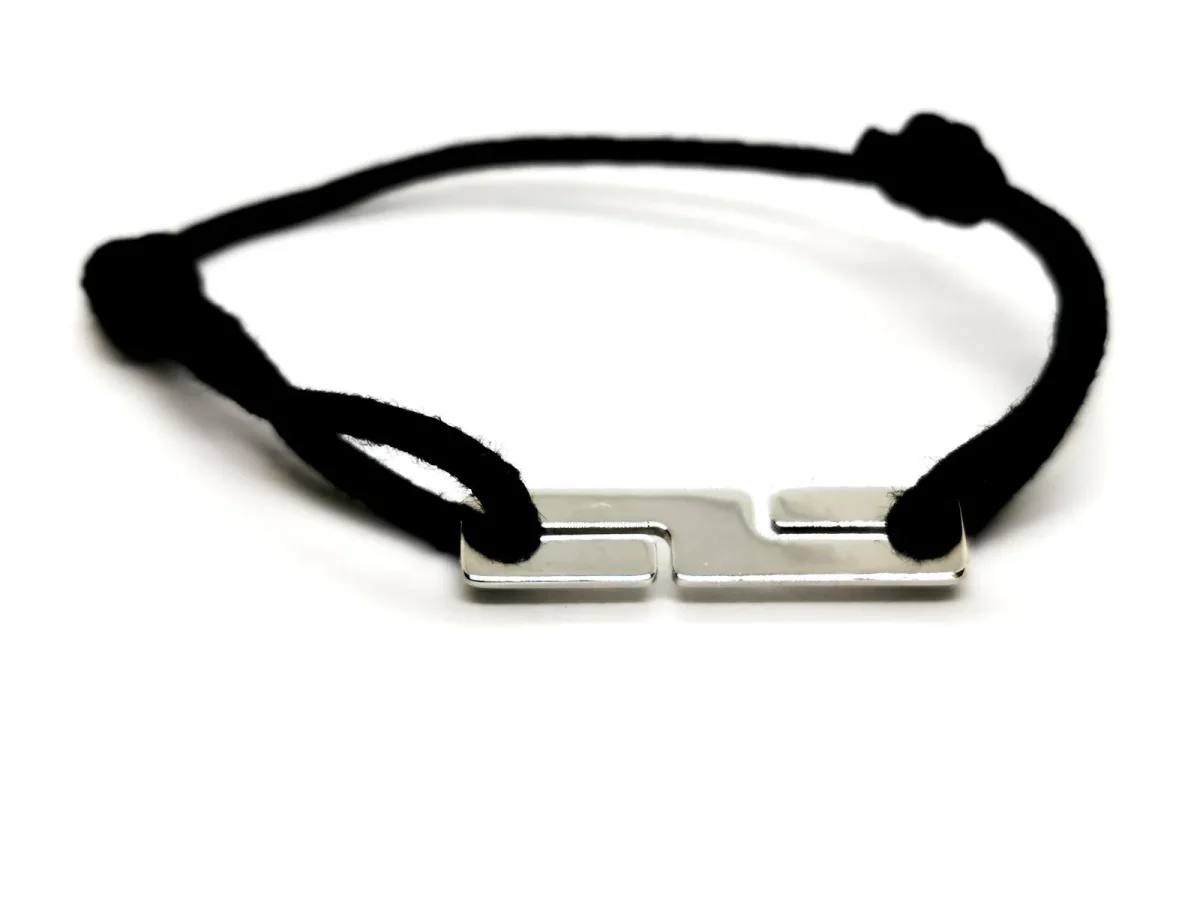 Bracelet cordon signé de la maison Dinh Van, collection Seventies, en or blanc 750 millièmes (18 carats), cordon noir taille ajustable, composé d’une plaque géométrique en forme de S, relié à chaque extrémité par un cordon noir noué, poids total: 3,05g, longueur maximale du cordon: 20,3 cm, dimensions de la plaque: 2,76 cm X 0,66 cm, signature Dinh Van légèrement estompée par le polissage, poinçon de maître Dinh Van, poinçonné tête d’aigle, prix neuf: 550€, excellent état
