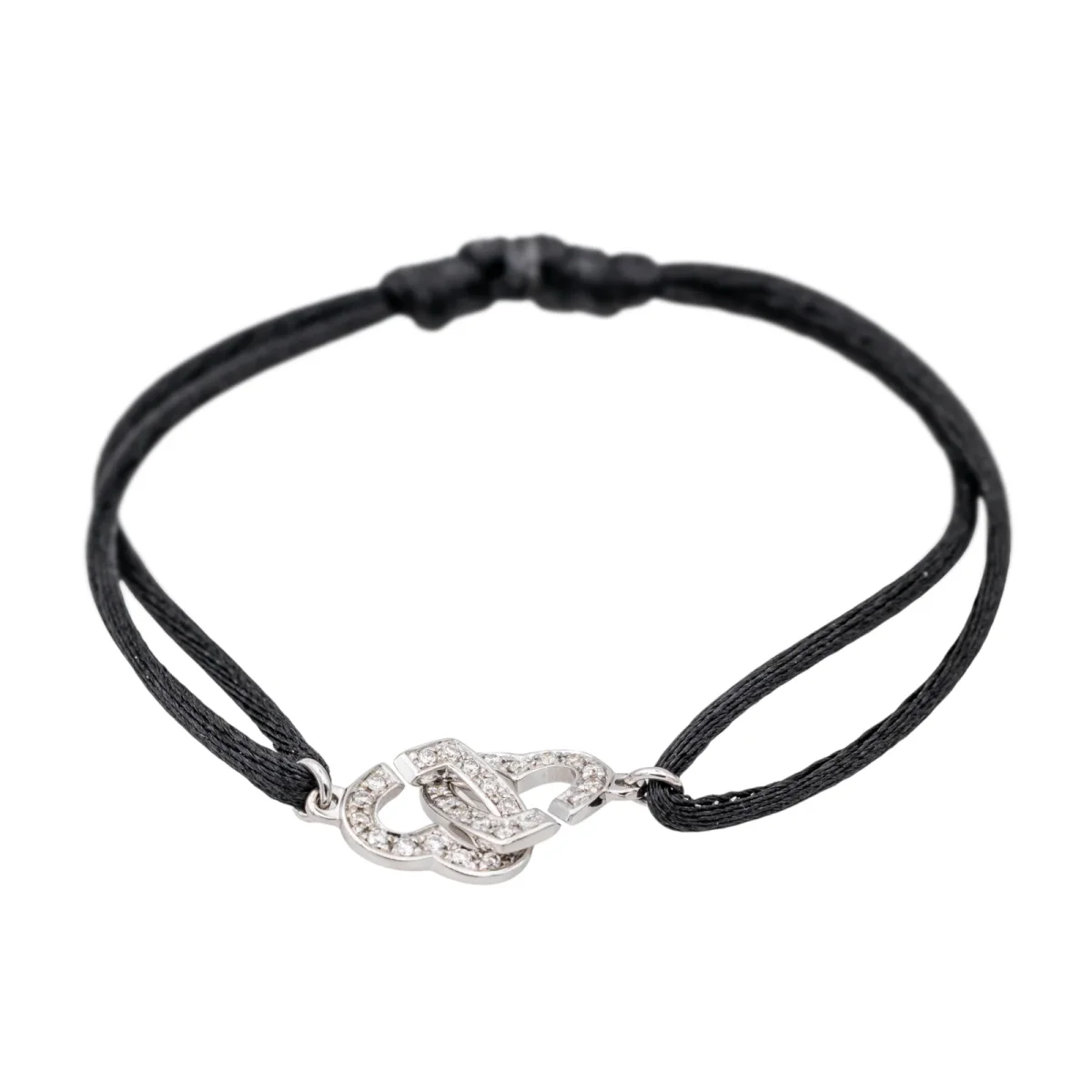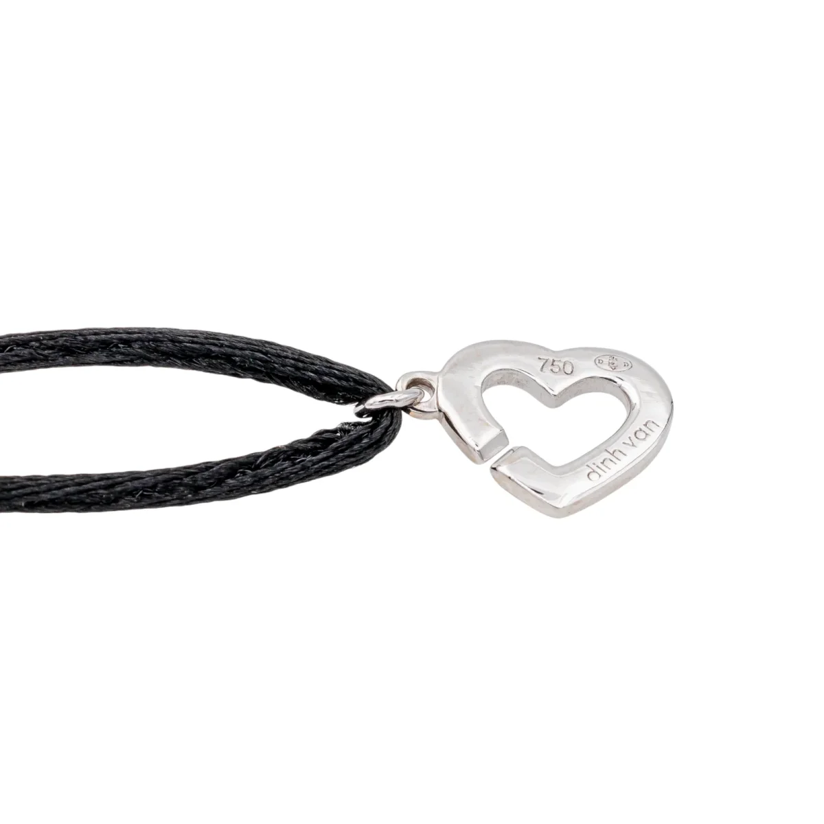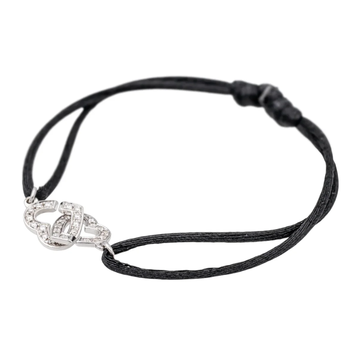 Bracelet cordon signé de la Maison Dinh Van en or blanc 750 millièmes (18 carats) testé, modèle double coeur R9, serti d’un pavage de diamants, environ H-VS, d’un poids total d’environ 0,15 ct (chaque diamant d’un poids d’environ 0,005 ct), largeur : 0,9 cm, taille ajustable grâce aux nœuds coulissants du cordon, poids total : 1,68 g, excellent état