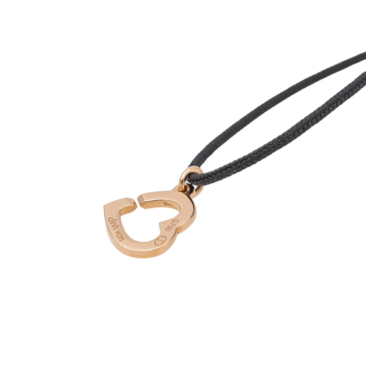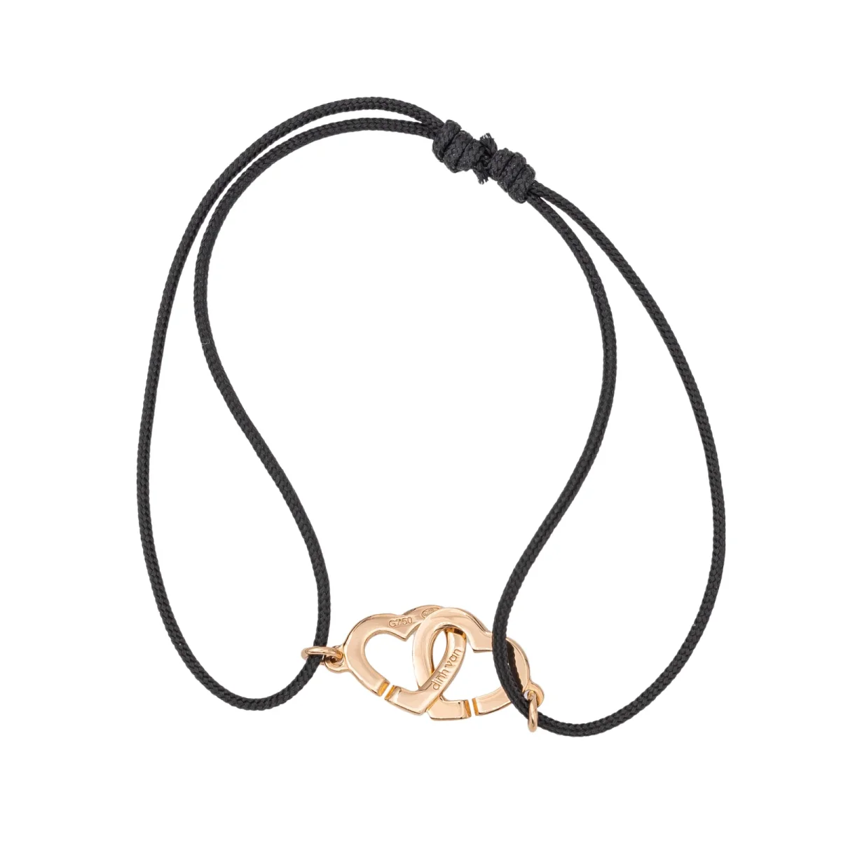 Bracelet cordon signé de la Maison Dinh Van or rose 750 millièmes (18 carats) testé, modèle Double cœurs, longueur : 15,00 cm, largeur : 0,90 cm, épaisseur du cordon : 0,08 cm, taille ajustable grâce aux nœuds coulissants du cordon jusqu’à 27,00 cm, poids total : 1,48 g, vendu avec écrin d’origine, excellent état