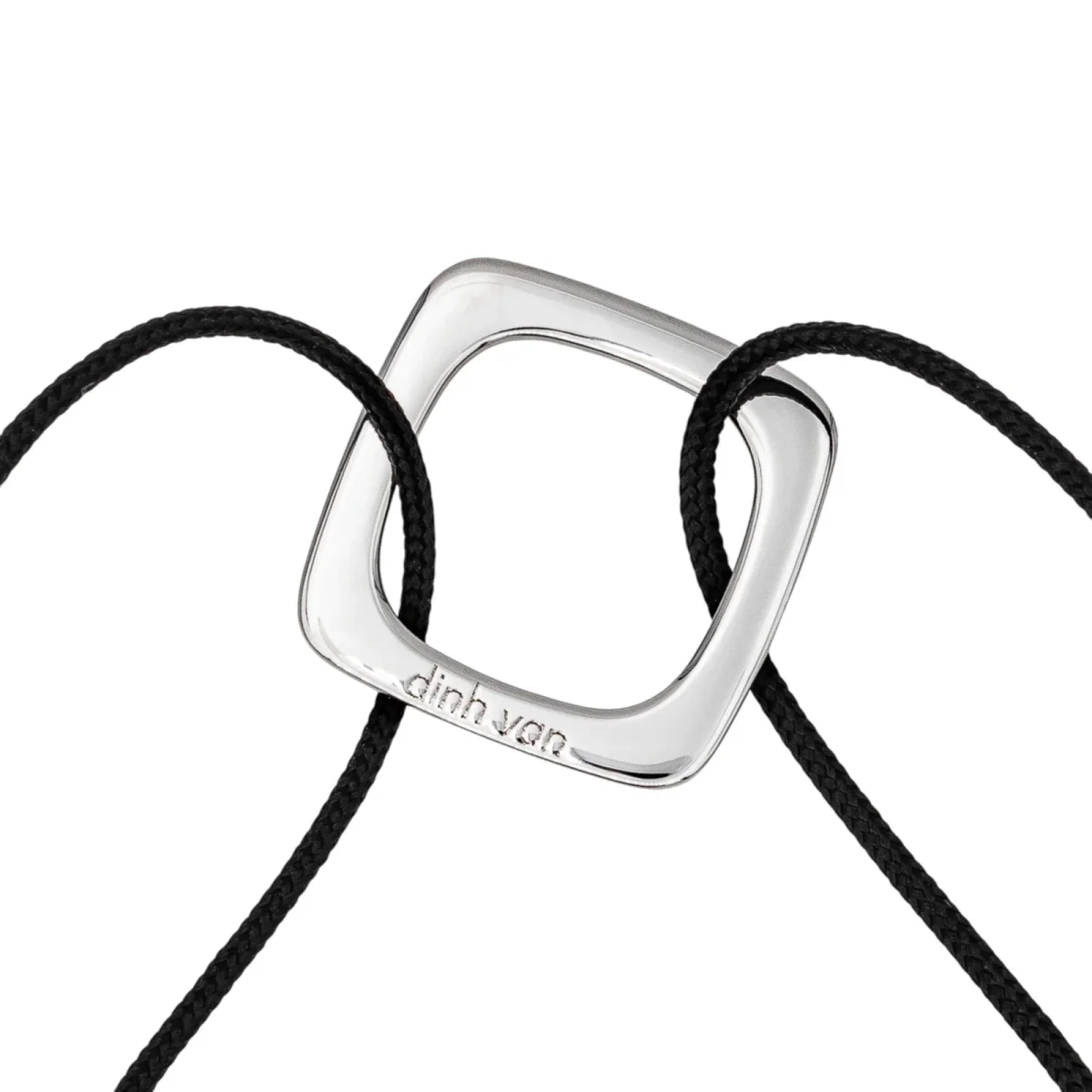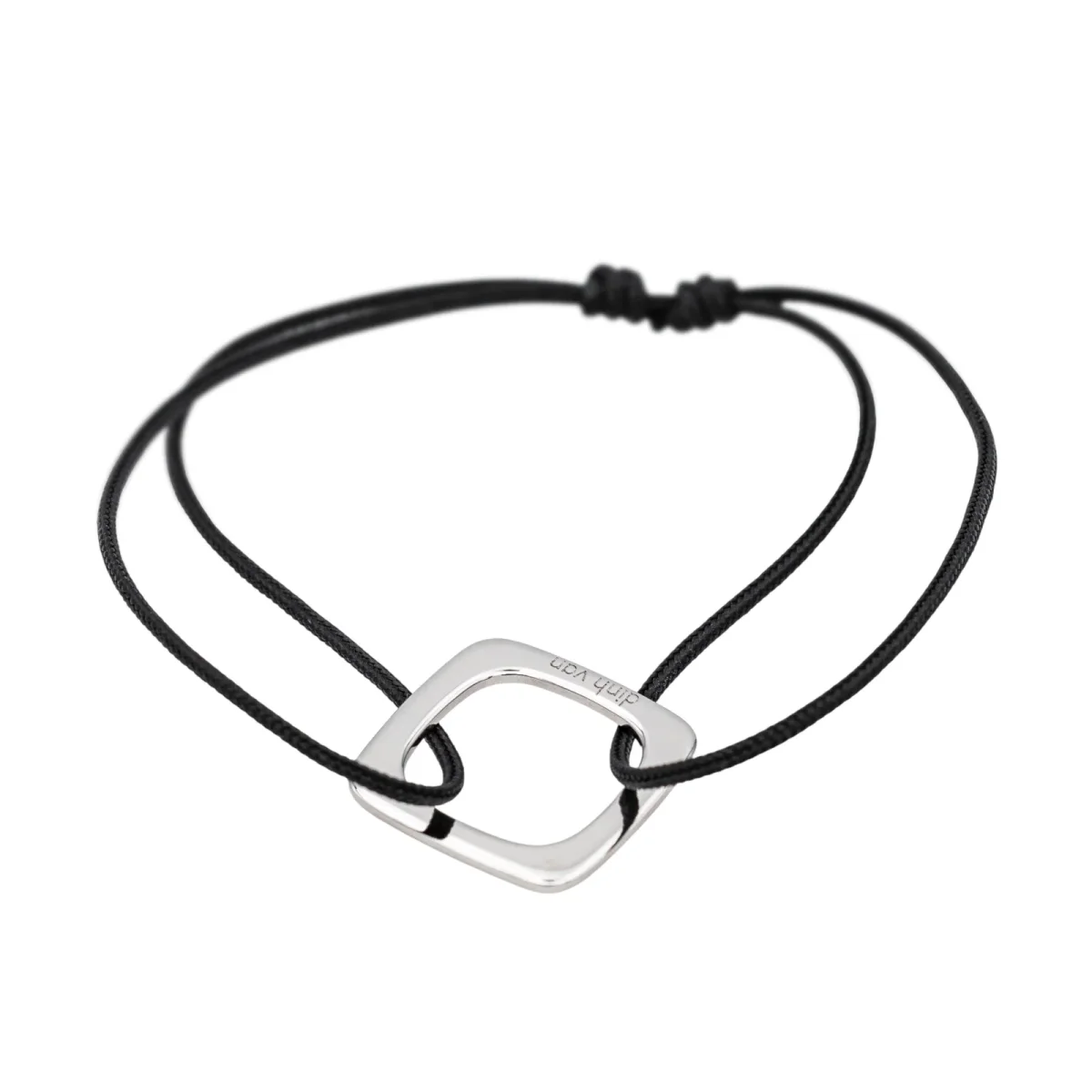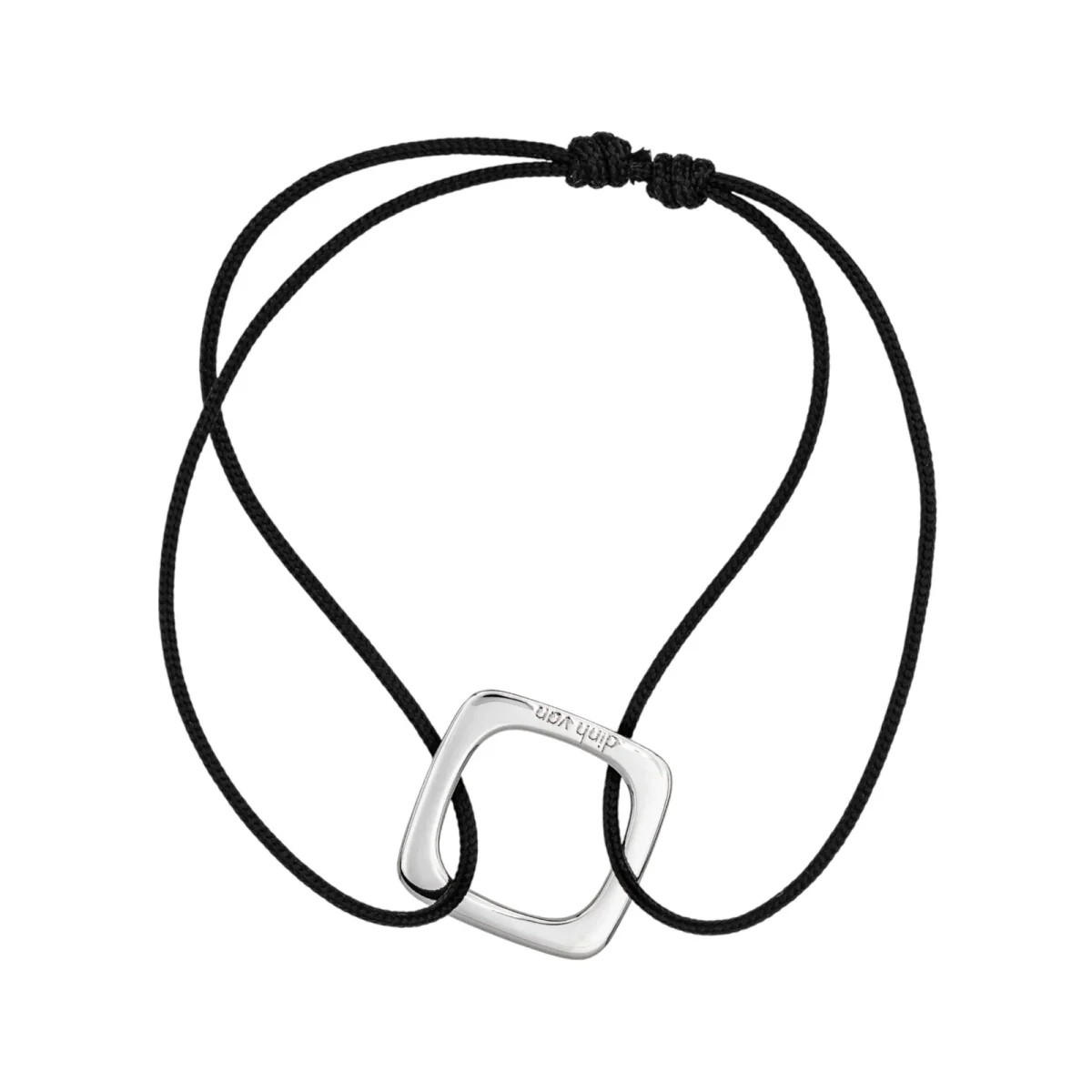 Bracelet cordon signé de la Maison Dinh Van en or blanc 750 millièmes (18 carats) testé, grand modèle impression, dimension du motif : 1,50 cm x 1,50 cm, épaisseur du cordon : 0,05 cm, longueur : 15,00 cm, taille ajustable grâce aux nœuds coulissants du cordon, poids total : 1,57 g, excellent état