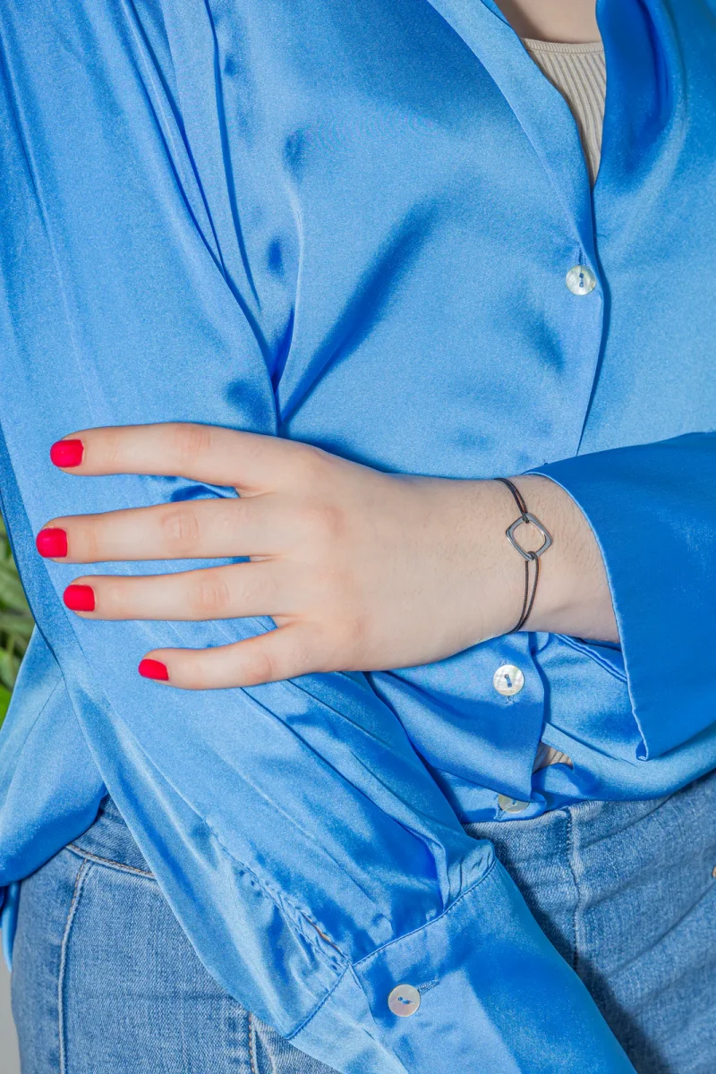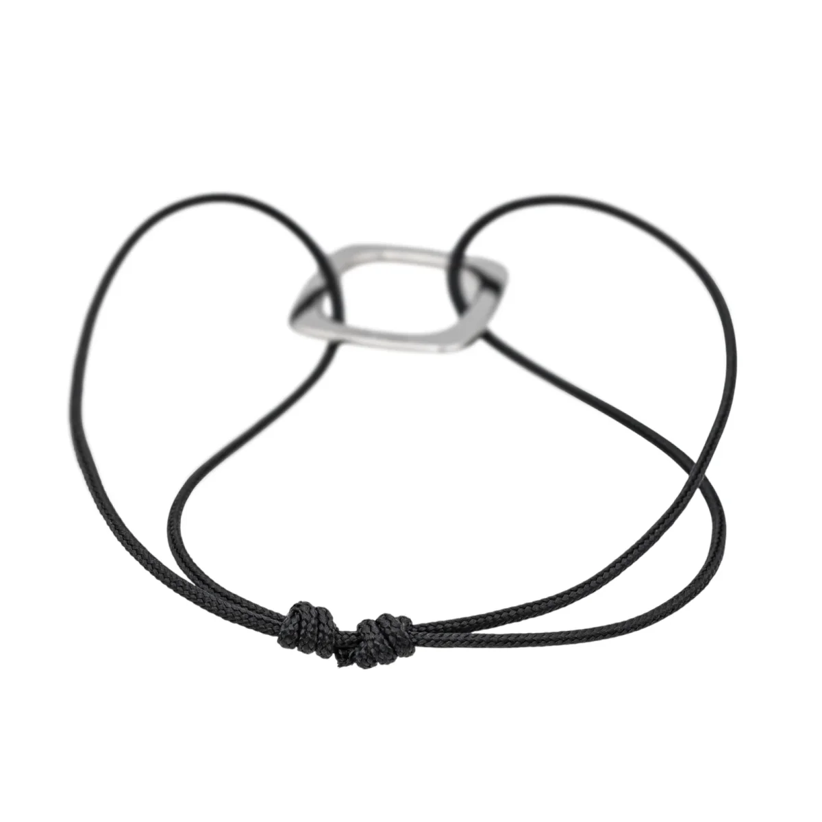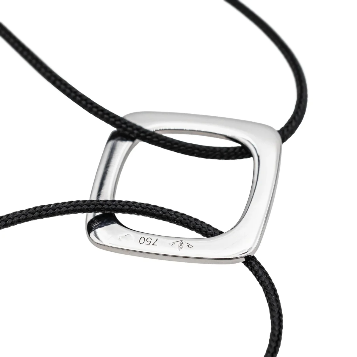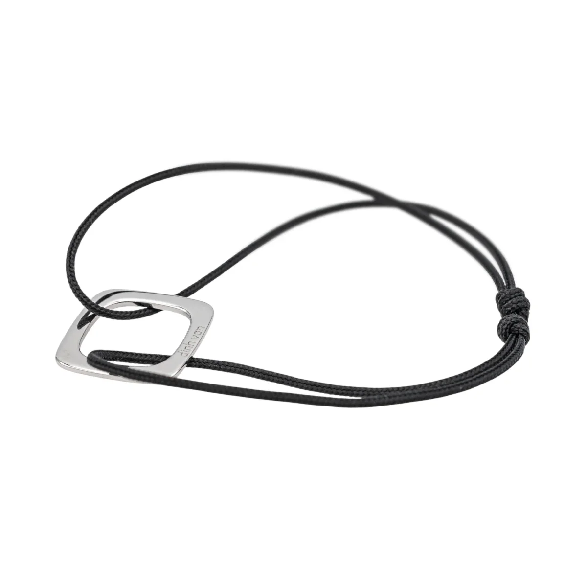 Bracelet cordon signé de la Maison Dinh Van en or blanc 750 millièmes (18 carats) testé, grand modèle impression, dimension du motif : 1,50 cm x 1,50 cm, épaisseur du cordon : 0,05 cm, longueur : 15,00 cm, taille ajustable grâce aux nœuds coulissants du cordon, poids total : 1,57 g, excellent état