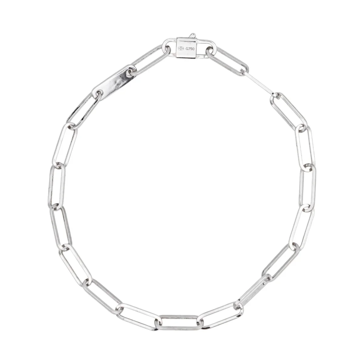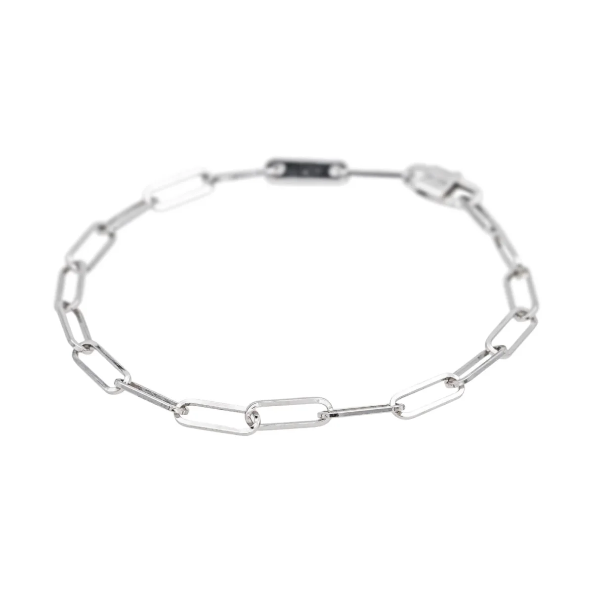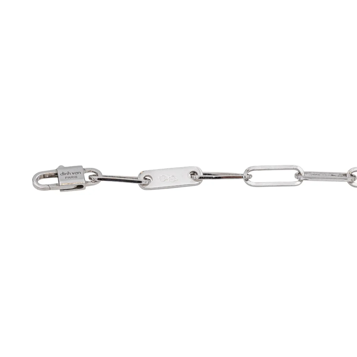 Bracelet signé de la maison Dinh Van, en or blanc 750 millièmes (18 carats) testé, modèle Maillon, longueur de la chaine : 15,5 cm, largeur : 0,31 cm, taille d’un maillon : 0,90 cm x 0,31 cm, poids total : 2,44 g, vendu avec écrin d’origine, très bon état
