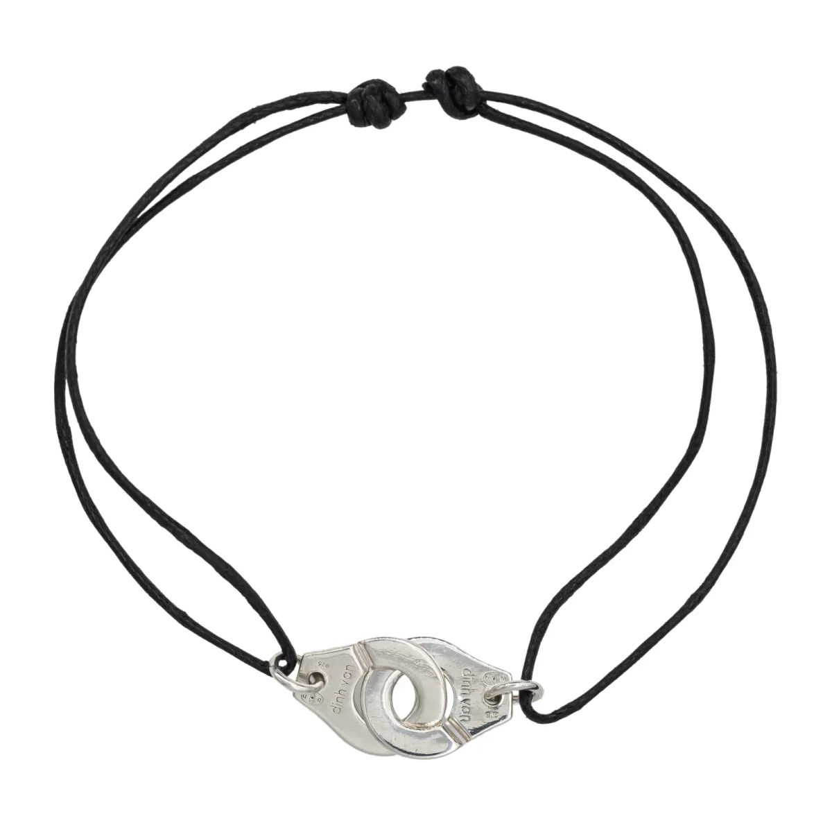Bracelet cordon Dinh Van menotte R12 argent 925 millièmes, longueur: 1,45 cm, largeur: 1,2 cm, épaisseur: 0,11 cm, taille ajustable grâce aux noeuds coulissants du cordon, poids total: 2,91 g, excellent état