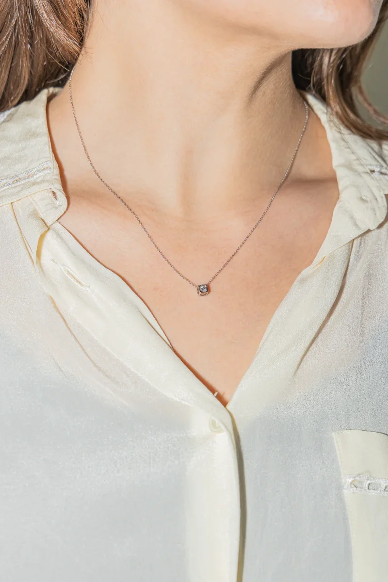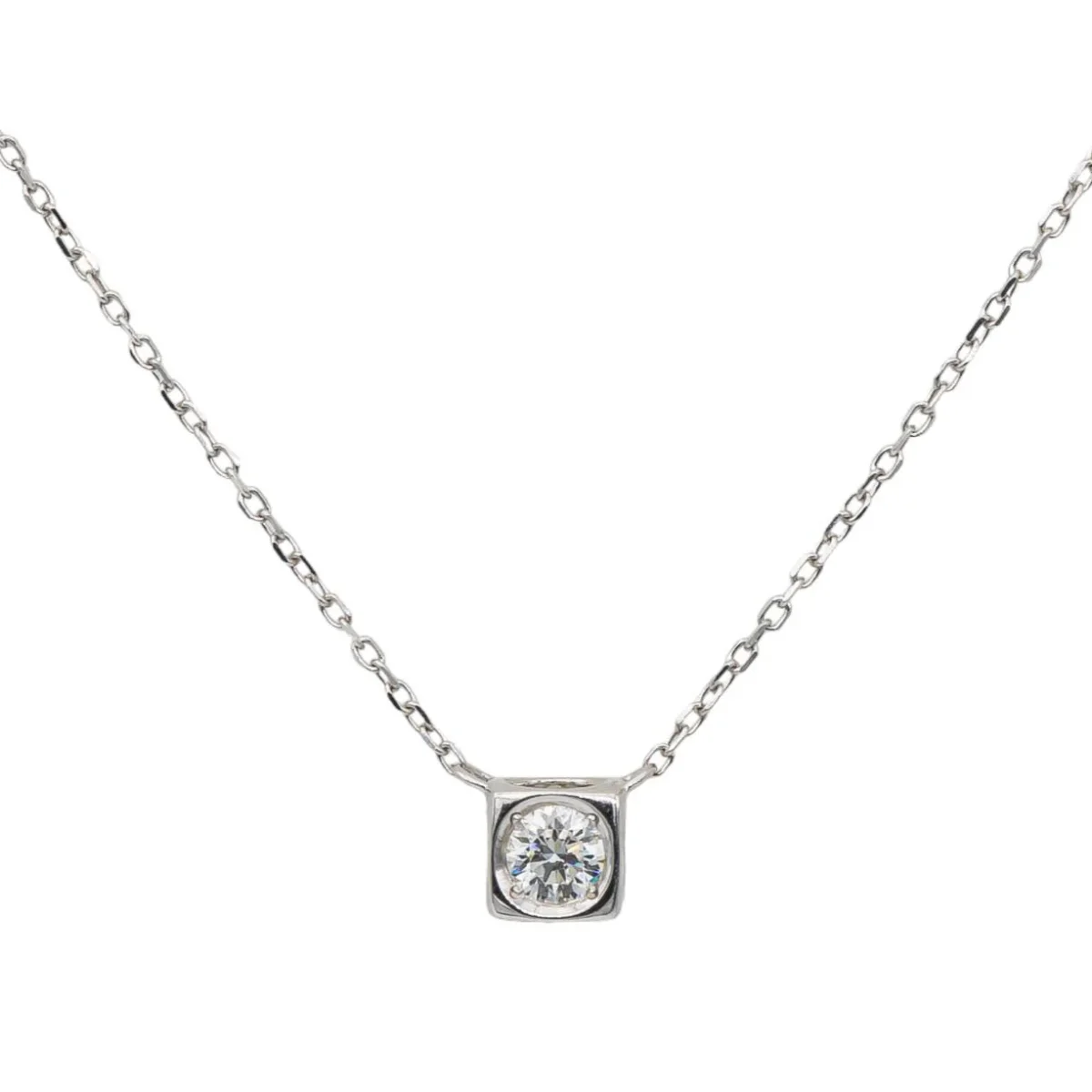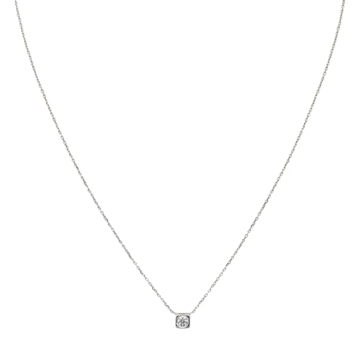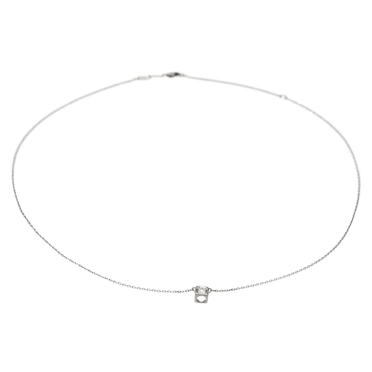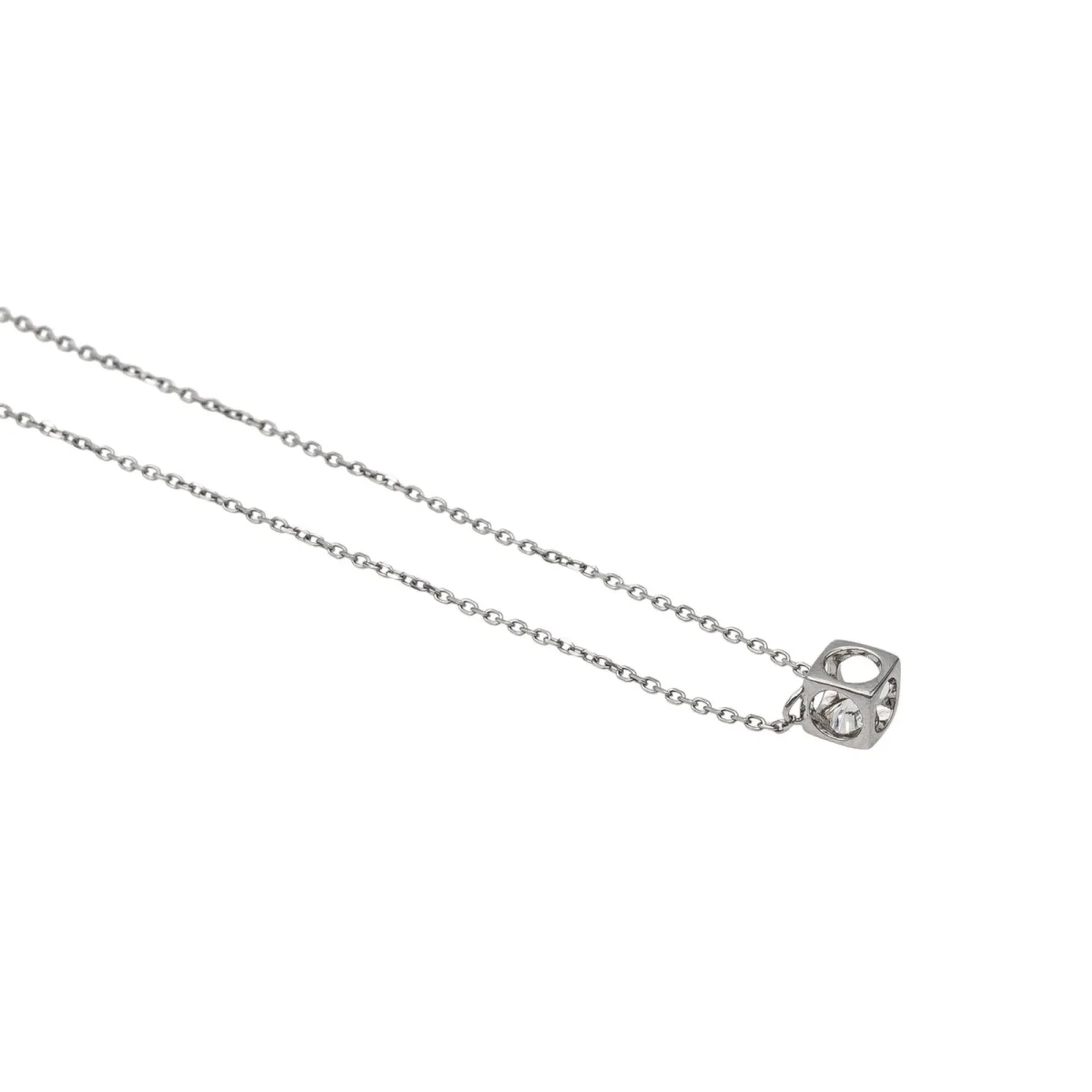 Collier signé de la Maison Dinh Van, modèle Le Cube, moyen modèle, en or blanc 750 millièmes (18 carats) testé, maille forçat, serti d’un diamant taille brillant estimé G/VS, d’un poids d’environ 0,15 ct, longueur: 45 cm, dimensions du cube: 0,46 cm x 0,46 cm, poids total: 1,64 g, excellent état