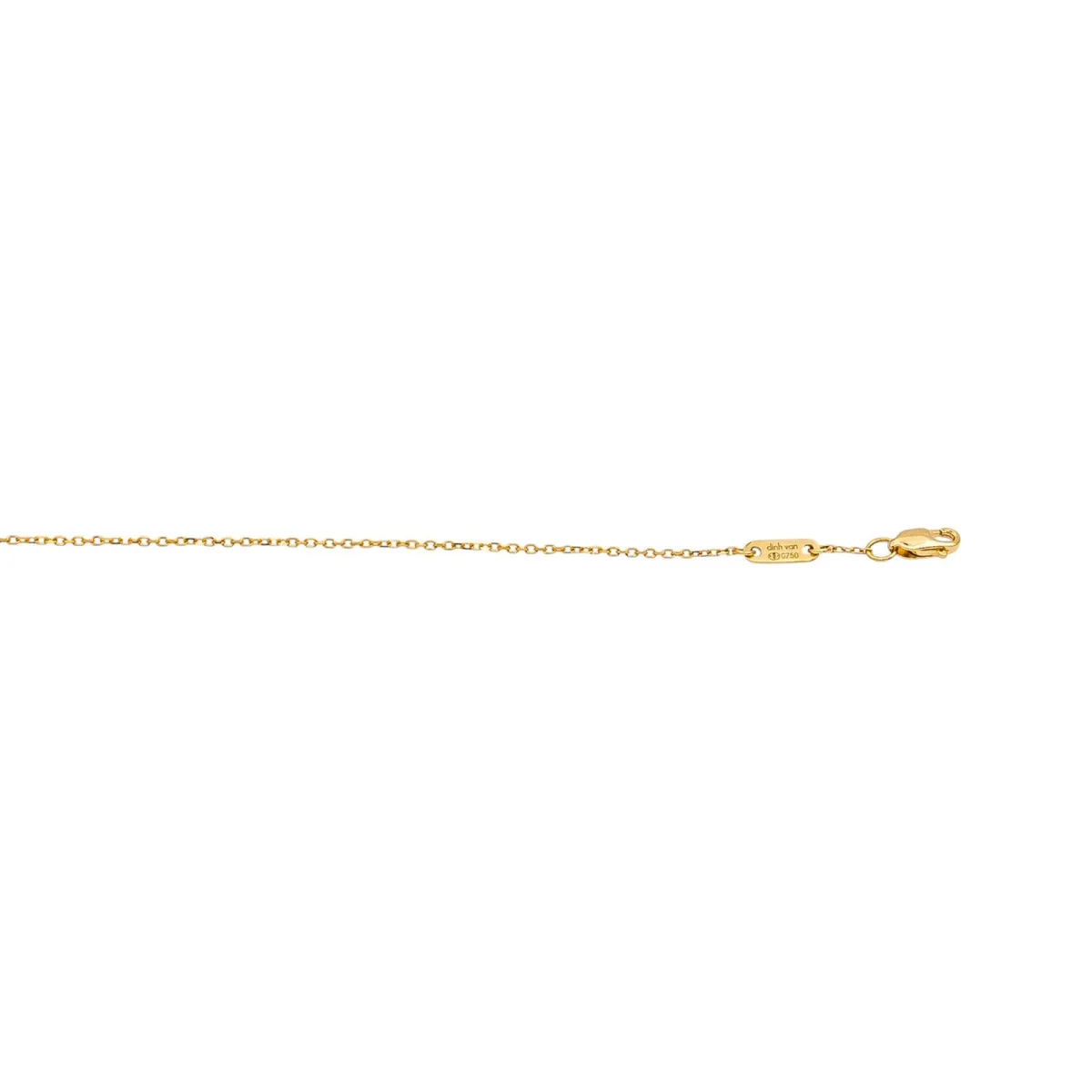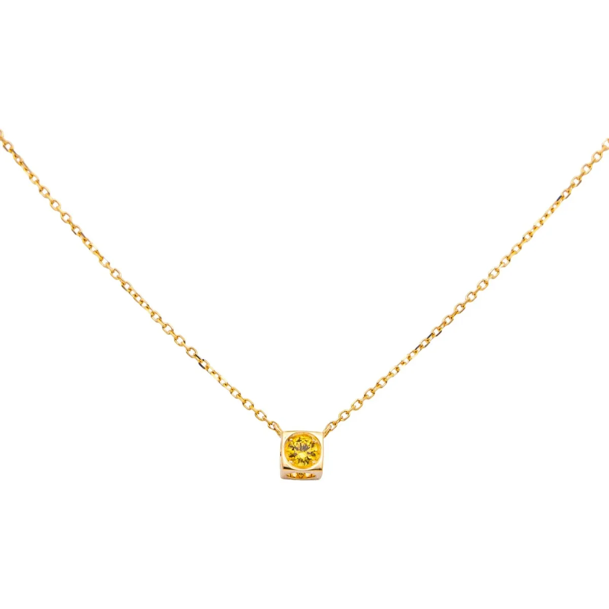 Collier signé de la Maison Dinh Van en or jaune 750 millièmes (18 carats) testé, modèle Cube, motif cube ajouré serti d’un saphir jaune, taille rond, d’un poids d’environ 0,12 cts, maille souple, longueur : 44,5 cm, poids total : 1,72 g, vendu avec Full Set d’origine et d’époque, excellent état