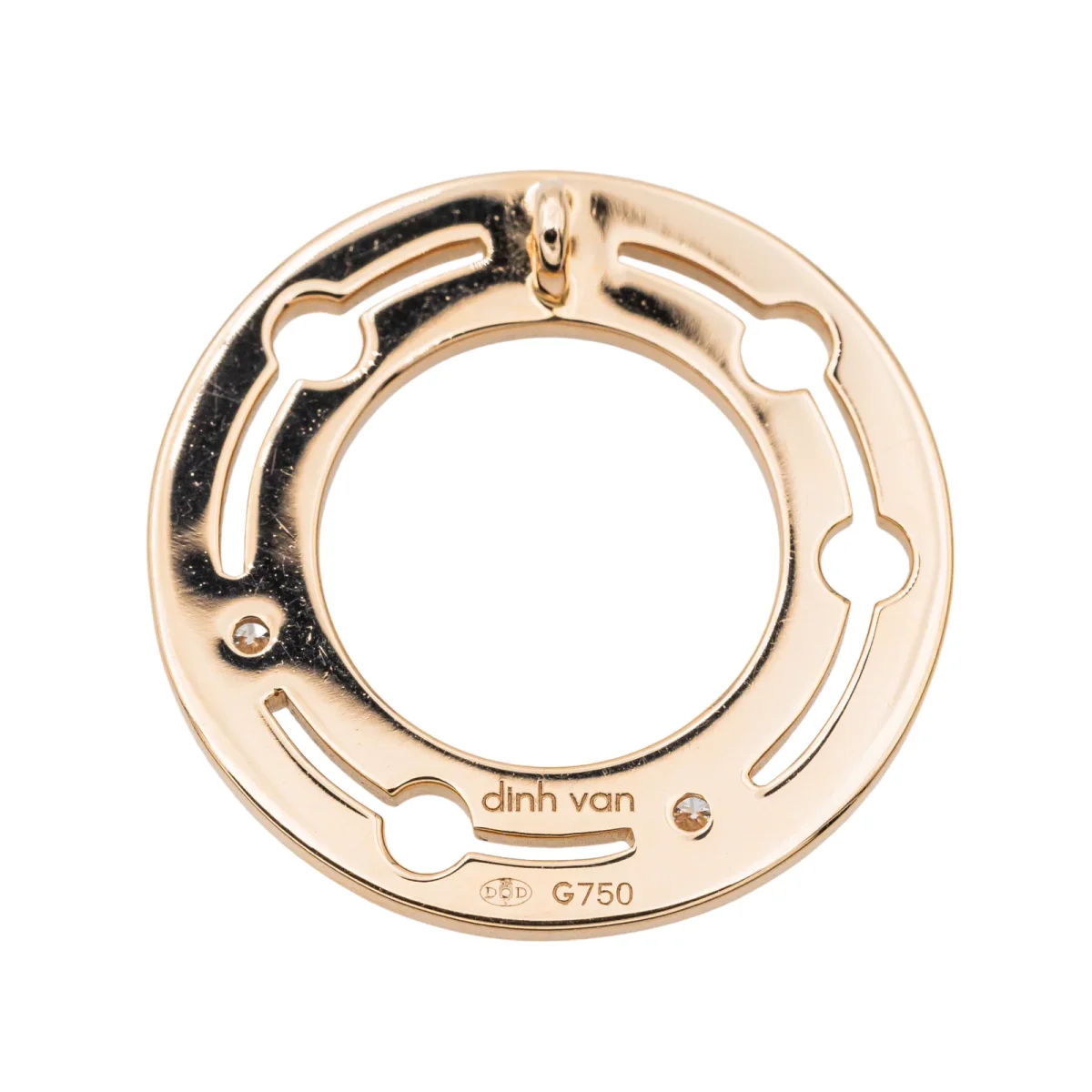 Collier signé de la Maison Dinh Van en or rose 750 millièmes (18 carats) testé, modèle Pulse, motif géométrique sertis de diamants, taille rond brillant, environ G-SI, poids total diamants : environ 0,34 cts, (56 diamants d’environ 0,005 ct chacun et 3 diamants d’environ 0,02 ct chacun), cordon noir taille réglable, longueur réglable, dimensions du pendentif: 2 cm x 2 cm, poids total : 3,49 g, excellent état