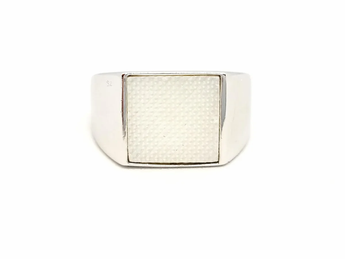 Bague homme signée de la maison Dior homme, chevalière en or blanc 750 millièmes (18 carats) et nacre blanche, tour de doigt: 61, largeur sur le dessus: 1,19 cm, poids total: 10,72 g, poinçon tête d’aigle, excellent état