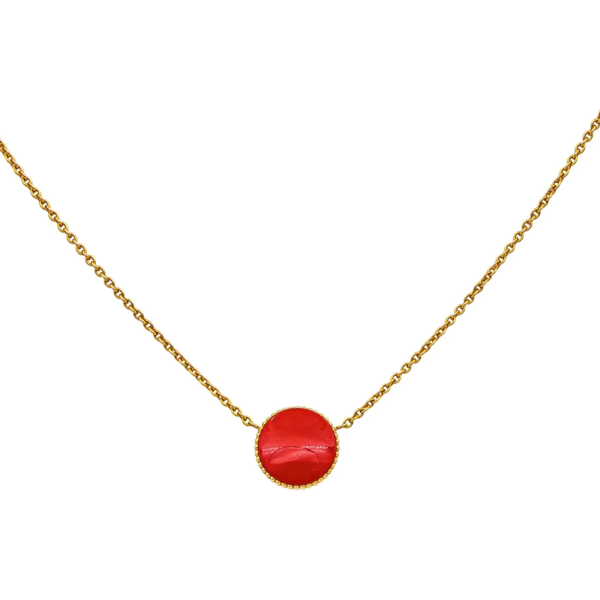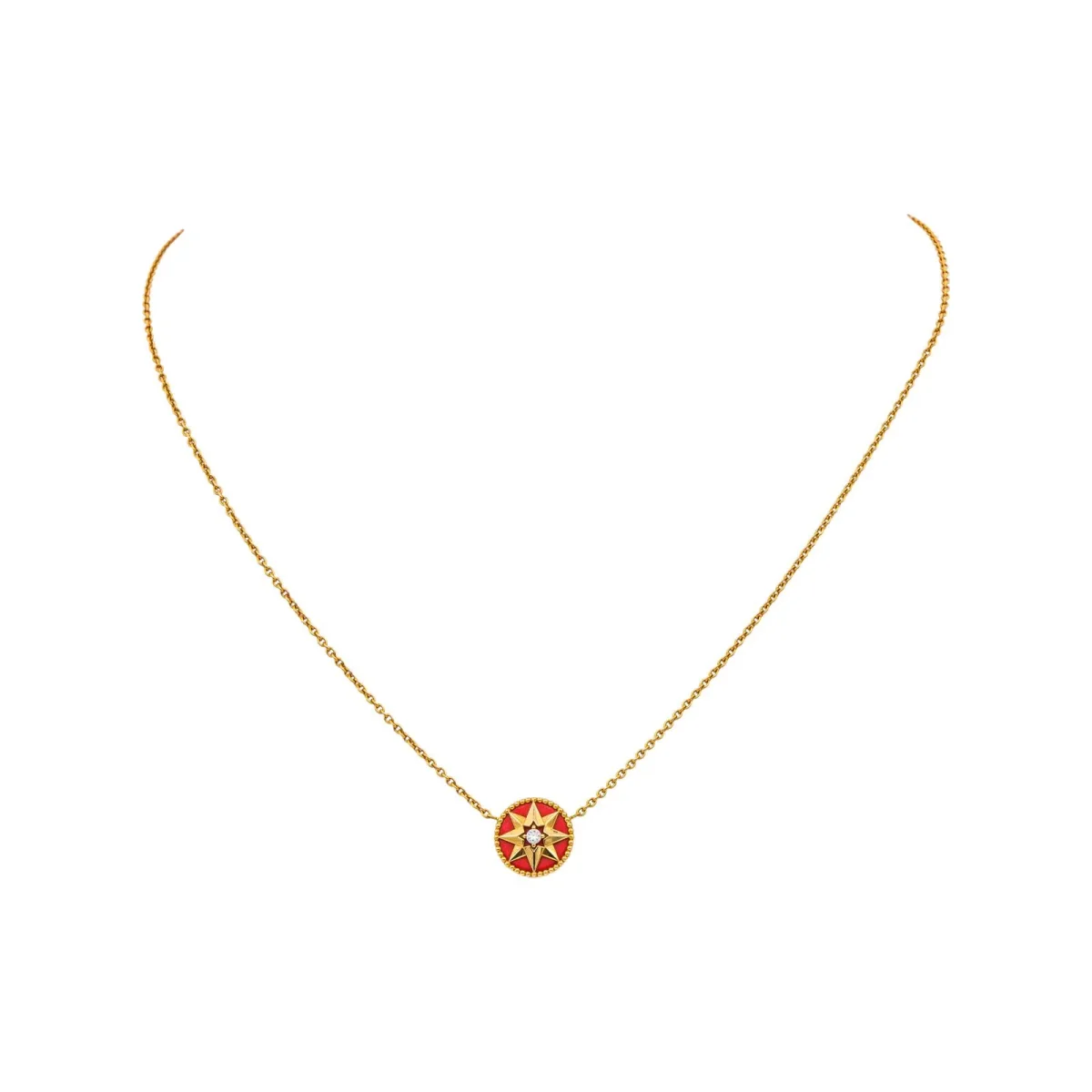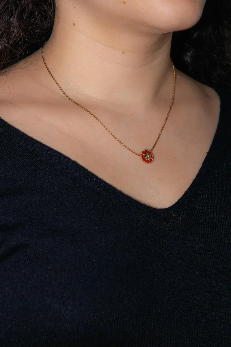 Collier signé de la Maison Dior, collection rose des vents, en Or rose 750 millièmes (18 carats), et céramique rouge, serti au centre d’un diamant taille brillant environ G/VS d’environ 0,04 ct, diamètre motif : 1,20 cm, longueur chaîne : 42,00 cm avec anneaux intermédiaire à 40,00 cm et à 38,00 cm, poids total : 3,78 g, poinçon tête d’aigle, numéroté, excellent état