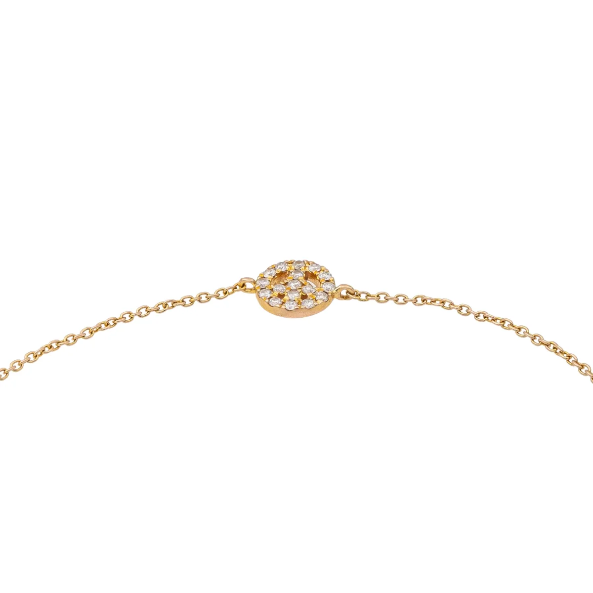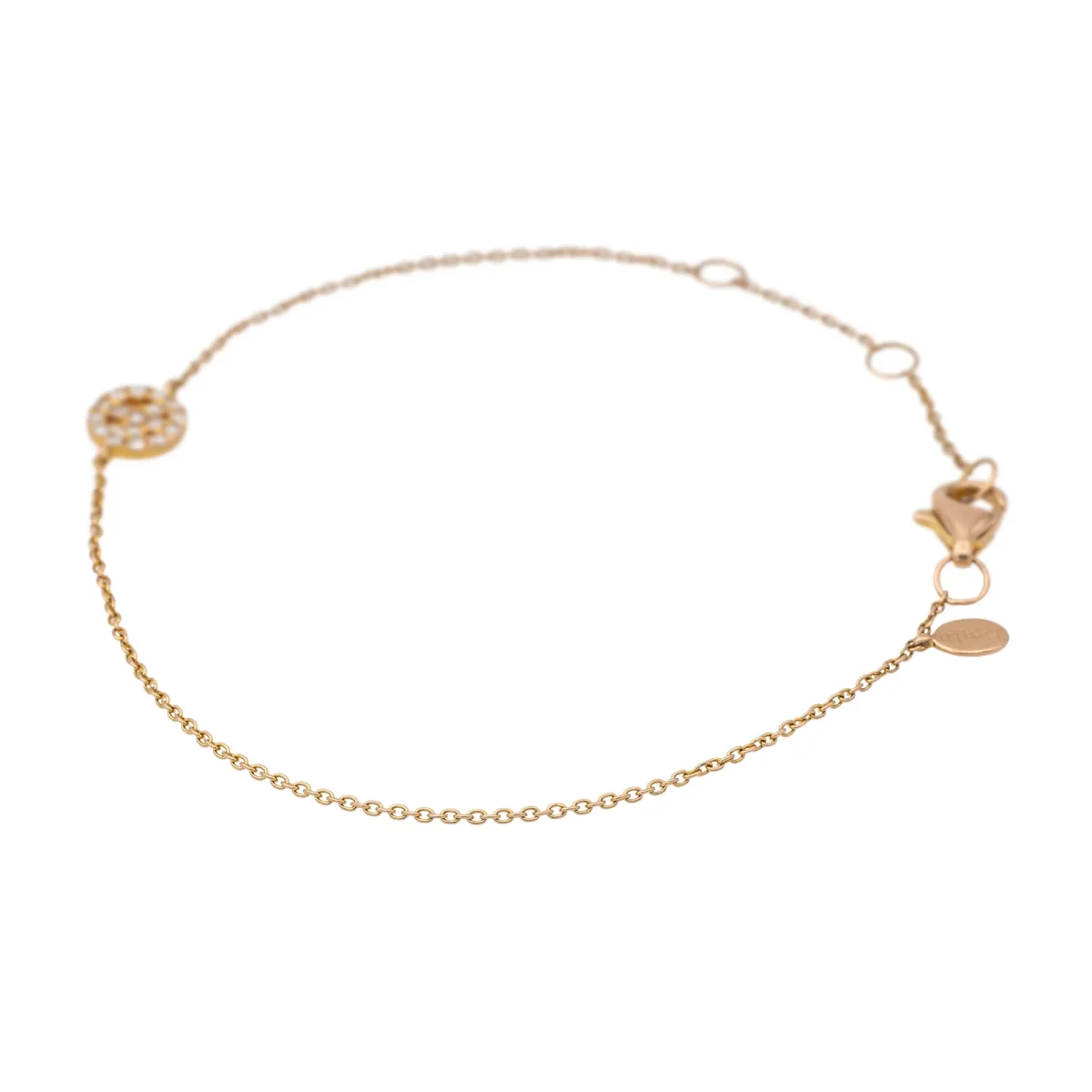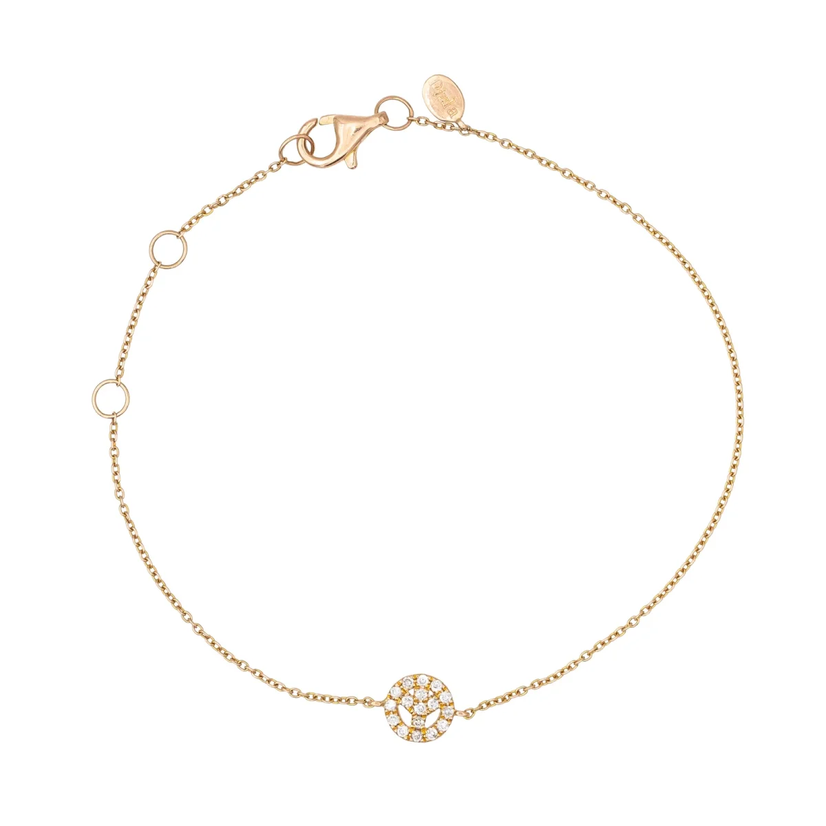 Bracelet signé de la Maison Djula, or rose 750 millièmes (18 carats) testé, motif Peace & Love, serti de 17 diamants taille brillant, environ H-VS, d’un poids total d’environ 0,085 ct, (chaque diamant d’un poids d’environ 0,005 ct), maille forçat, longueur : 17,00 cm, largeur du motif : 0,06 cm, poids total : 1,11 g, excellent état