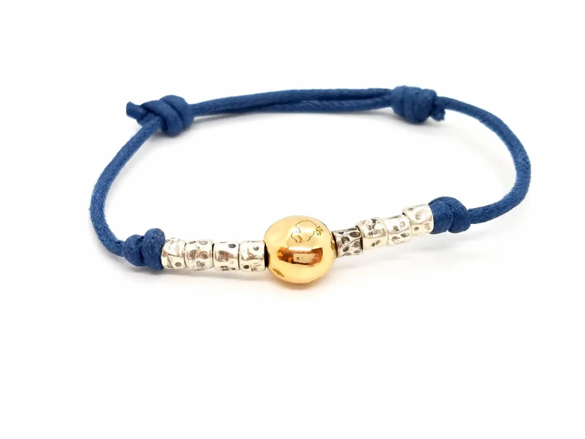 Bracelet cordon bleu signé Dodo Pomellato, composé d’une pépite en or jaune 750 millièmes (18 carats) (1 cm x 0,90 cm), 8 grains en argent (0,37 cm x 0,38 cm), poids total: 5,70 g,taille ajustable, excellent état, prix neuf: 465 €