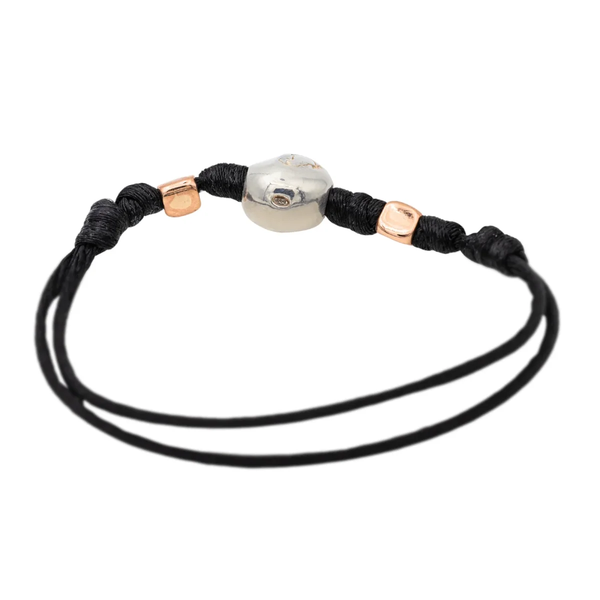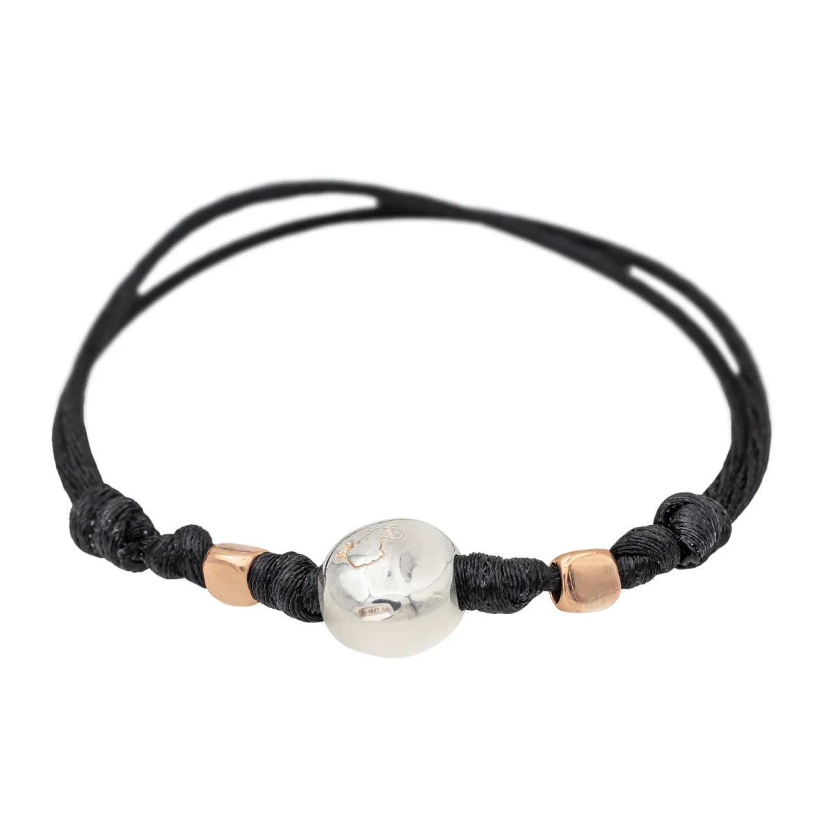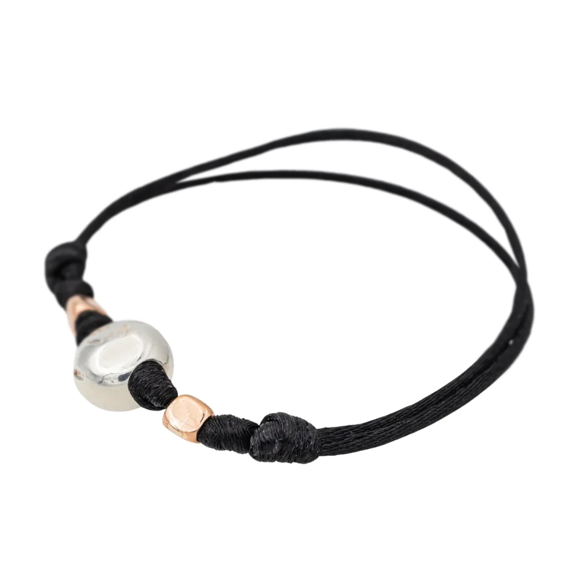 Bracelet signé de la Maison Dodo Pomellato, en or 375 millièmes (9 carats) et argent 925 millièmes testé, cordon noir ajustable, pépite en argent, 2 rondelles en Or rose, vendu avec écrin, poids total: 4,12 g, excellent état