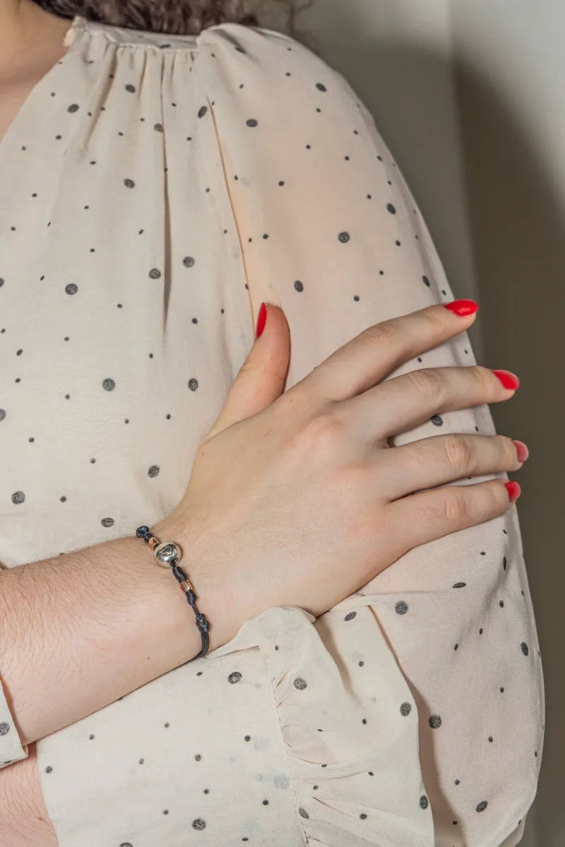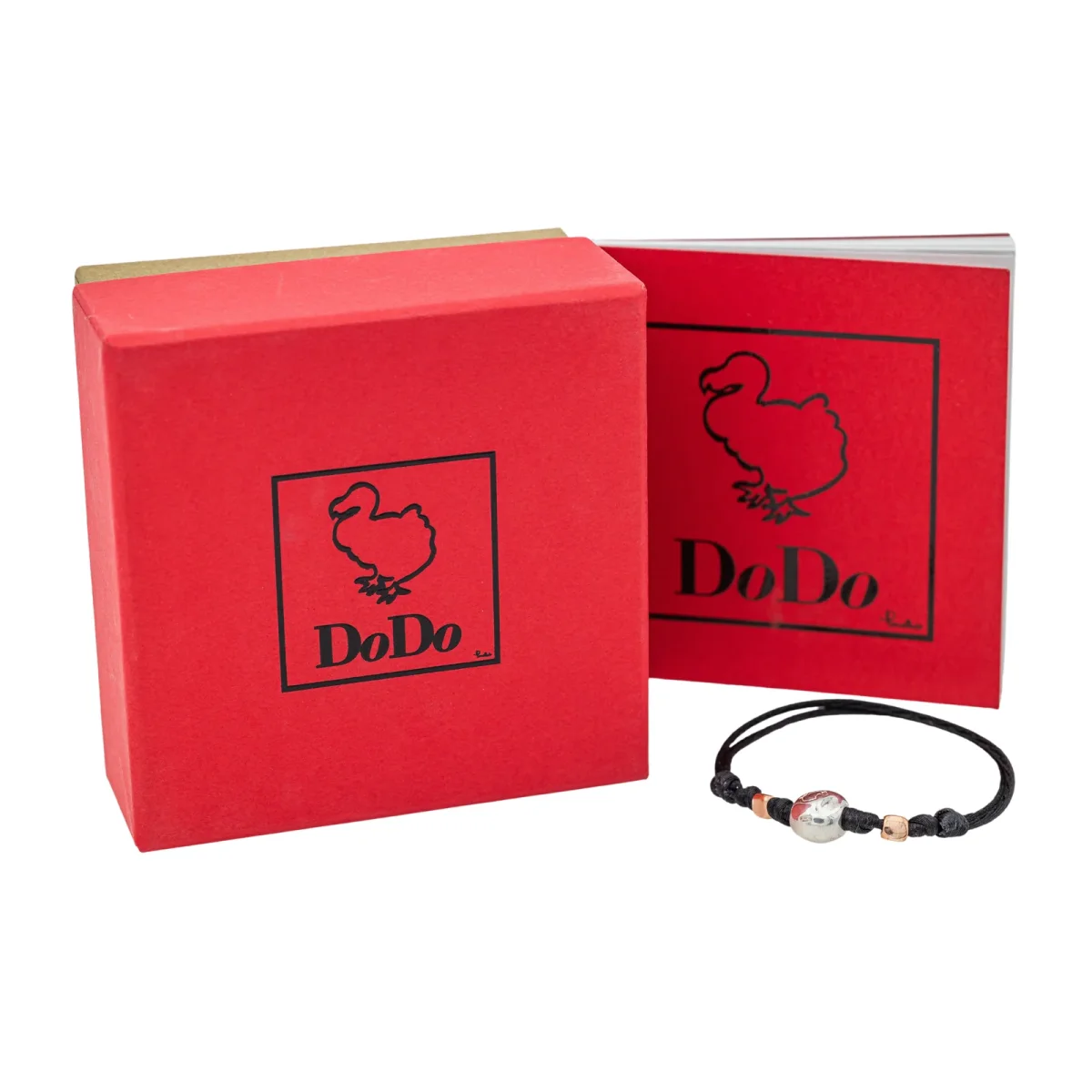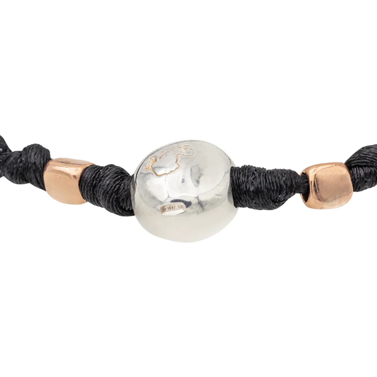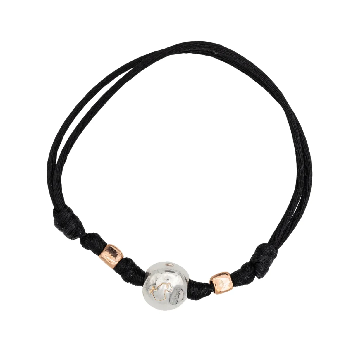 Bracelet signé de la Maison Dodo Pomellato, en or 375 millièmes (9 carats) et argent 925 millièmes testé, cordon noir ajustable, pépite en argent, 2 rondelles en Or rose, vendu avec écrin, poids total: 4,12 g, excellent état