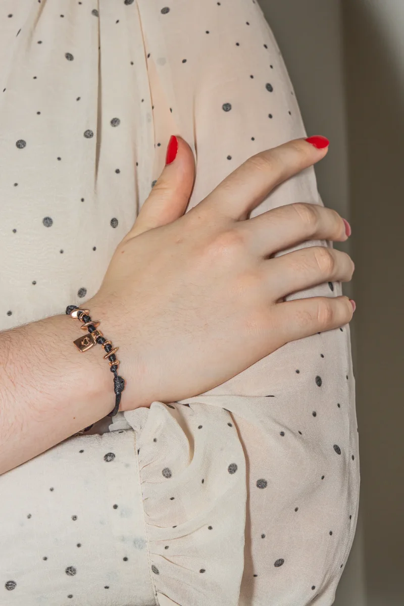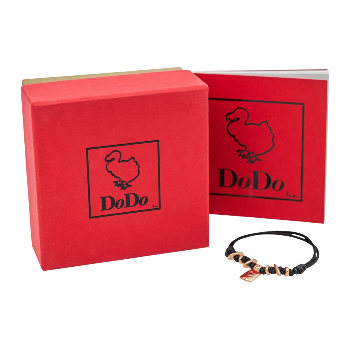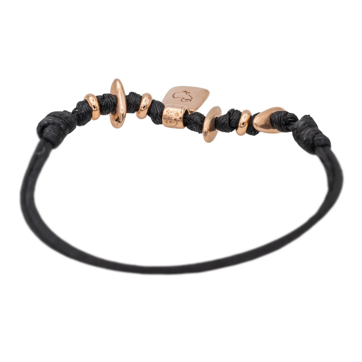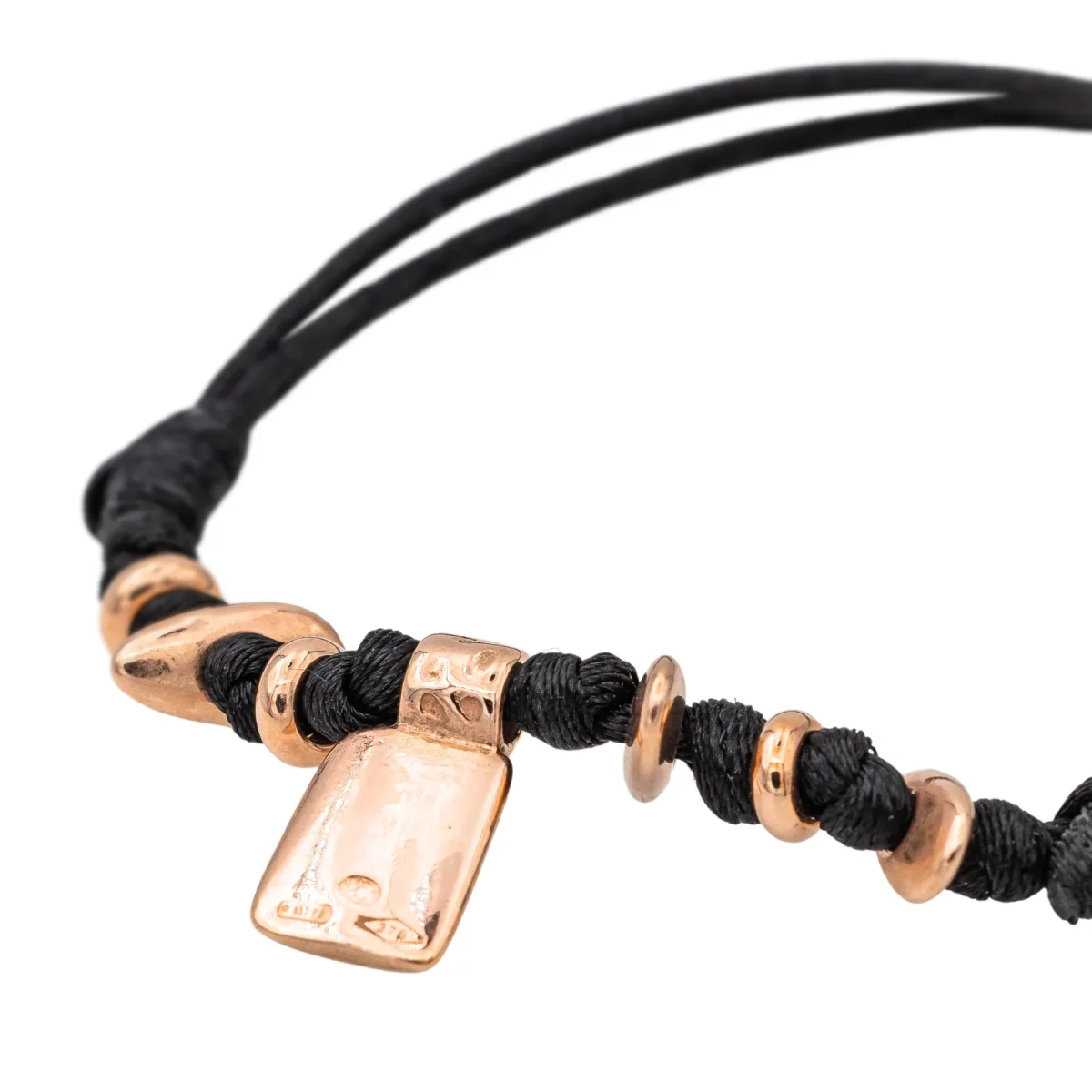 Bracelet signé de la Maison Dodo Pomellato, en or 375 millièmes (9 carats) testé, cordon noir 6 rondelles et un pendentif charm Or rose, vendu avec écrin, poids total: 3,53 g, excellent état