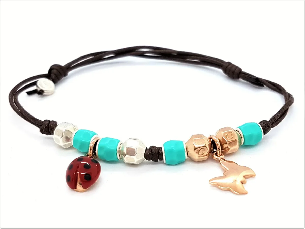 Bracelet Dodo Pomellato, double cordon fin brun, Papillon or rose 375 millièmes (9 carats) (0,8 cm), coccinelle or rose 375 millièmes (9 carats) (0,9 cm), 4 tubes turquoise, 2 grains en argent, 2 grains en or rose 375 millièmes (9 carats), Taille bracelet ajustable, Poids total: 6,30 g, état neuf, prix boutique: 490€