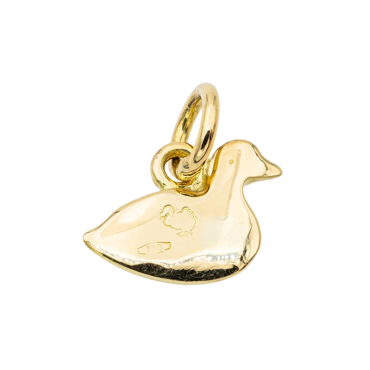 Pendentif signé Dodo Pomellato, en or jaune 750 millièmes (18 carats) testé, petit modèle canard, dimensions avec la bélière: 1,15 cm x 1.14 cm, vendu avec écrin d’origine, prix neuf 210€, poids total: 1,04 g, excellent état