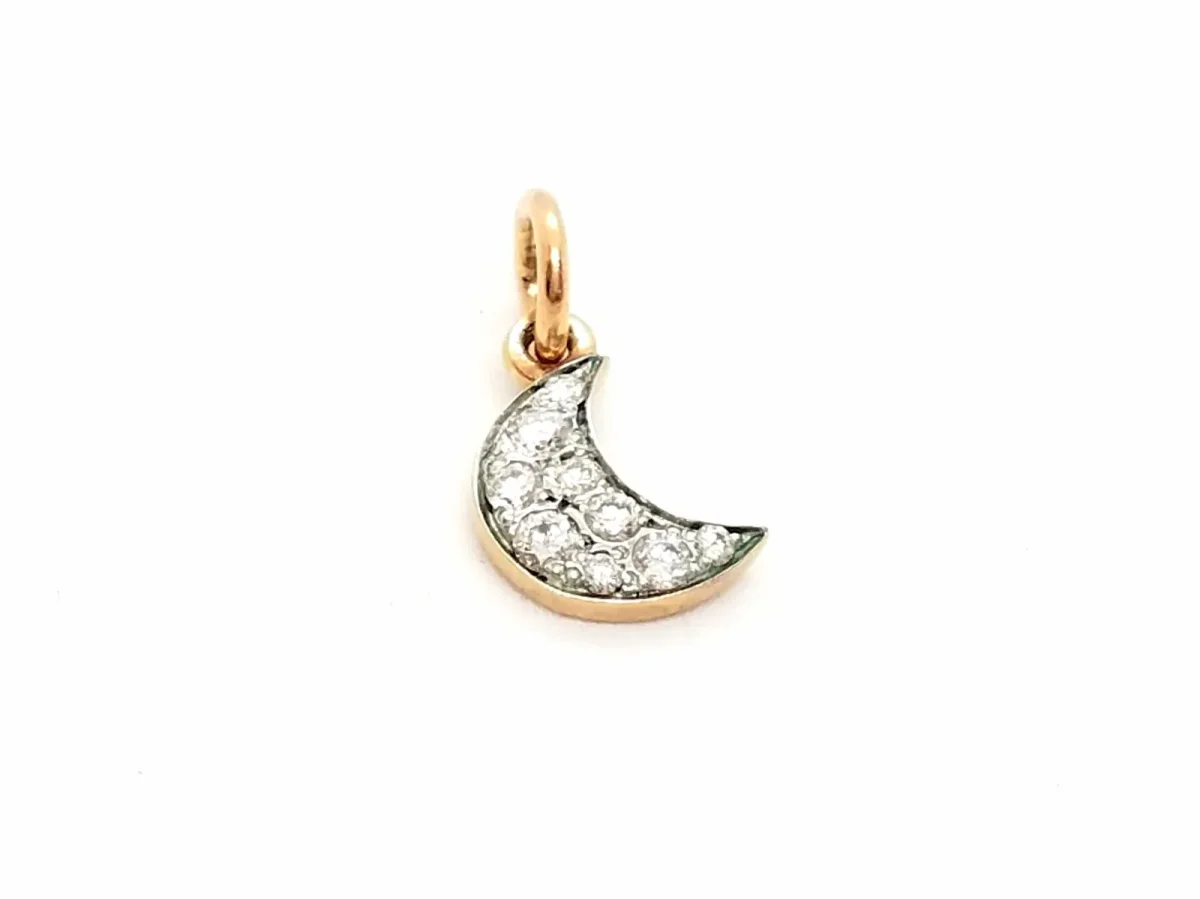Pendentif lune signé Dodo Pomellato en or rose 375 millièmes (9 carats), serties de 9 diamants taille brillant G-H V-SI pour un total d’environ 0,10 ct, dimensions: 0,82 cm x 0,70 cm, poids total: 0,61 g, excellent état, prix neuf: 625 €