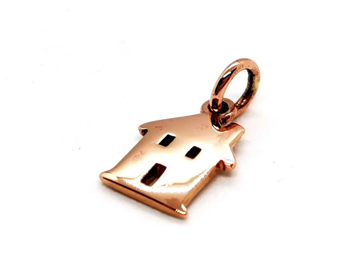 Pendentif signé de la maison Dodo Pomellato, en or rose 375 millièmes (9 carats) testé, modèle maison sweet Home, dimensions avec bélière : 1,56 cm X 0,86 cm, poids total : 0,93 g, prix du neuf : 190€, excellent état.