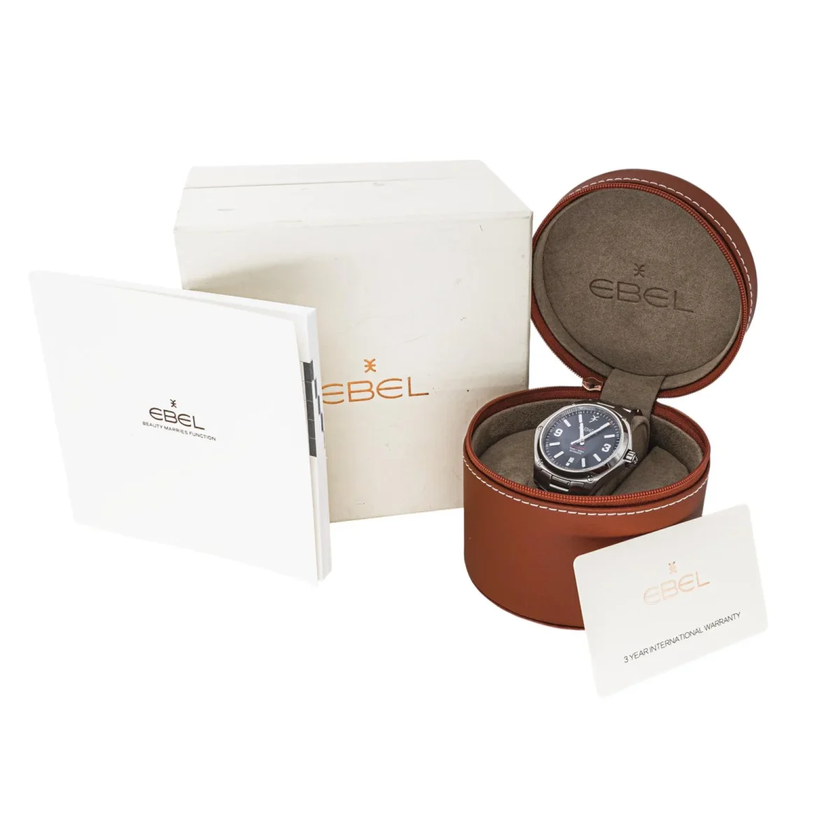 Montre Ebel modèle Discovery 1216458 en acier, n°série 24195353, cadran bleu à chiffres arabes, mouvement mécanique à remontage automatique, boîtier 41 mm, verre saphir, bracelet en acier boucle papillon (taille poignet 18,00 cm, largeur bracelet 1,96 à 1,79 cm en chute), poids total : 147,06 g, full set (boite et papier d’origine), année 2015, révision complète et garantie 1 an, excellent état vendue avec maillon supplémentaire